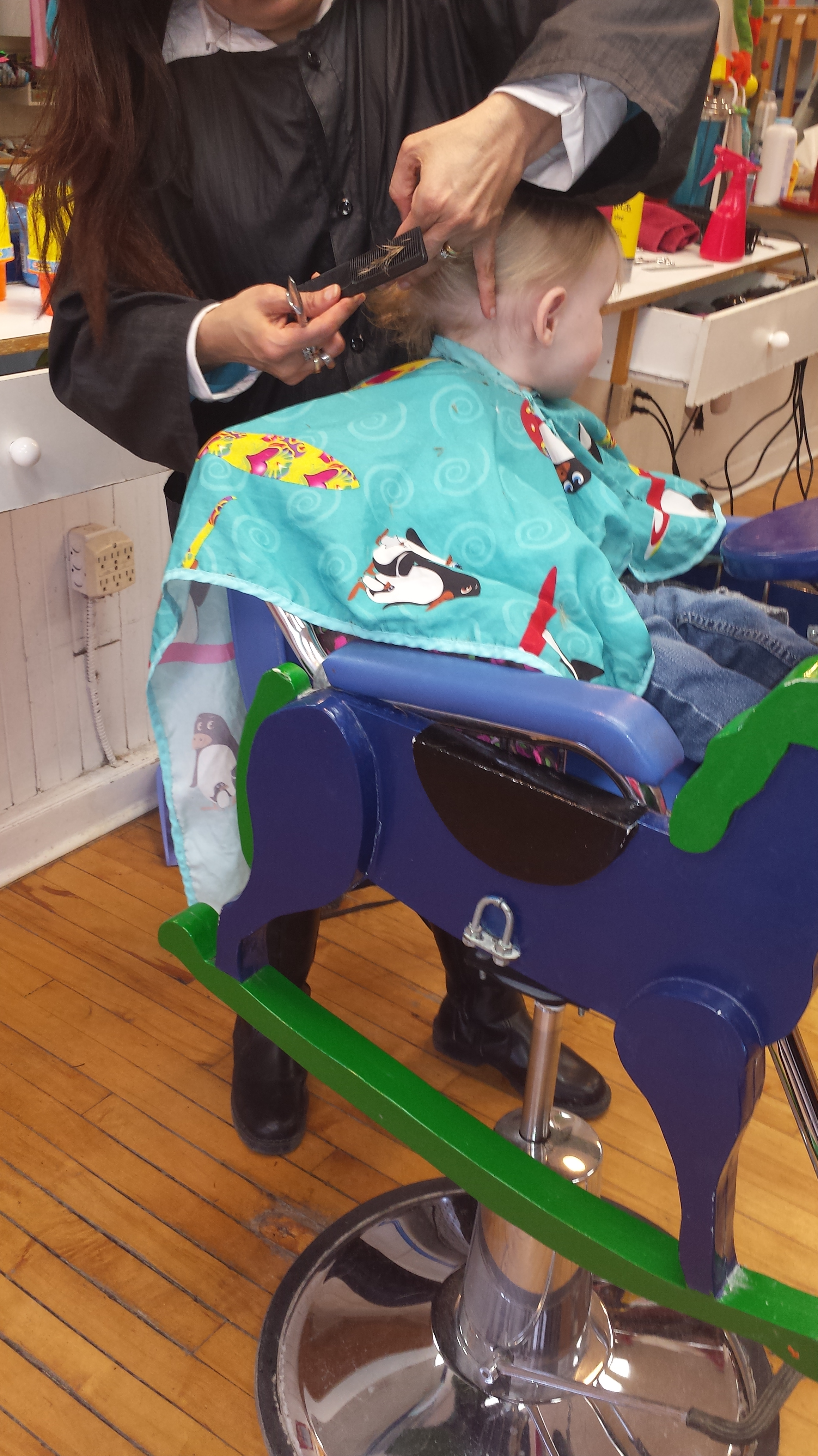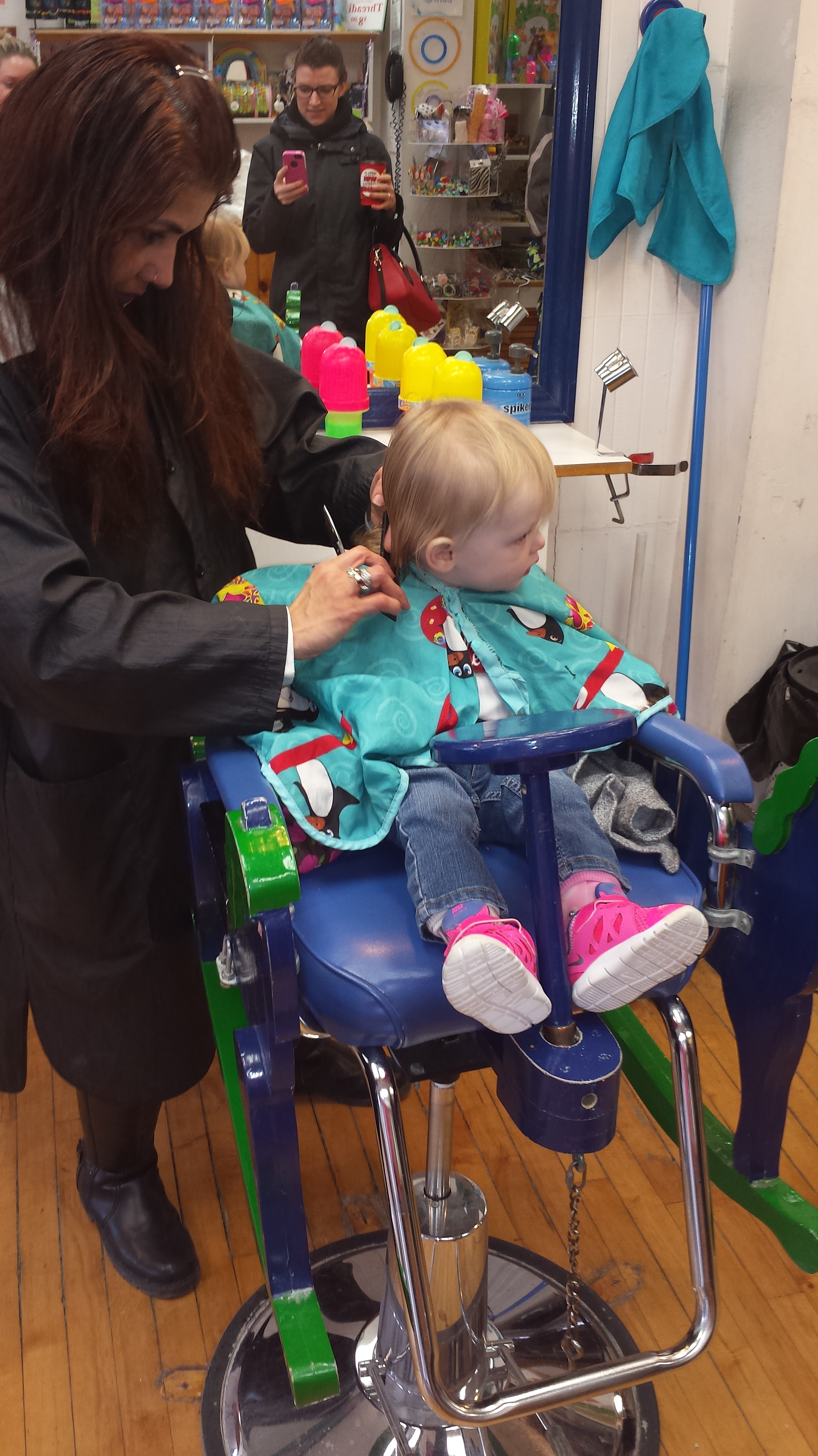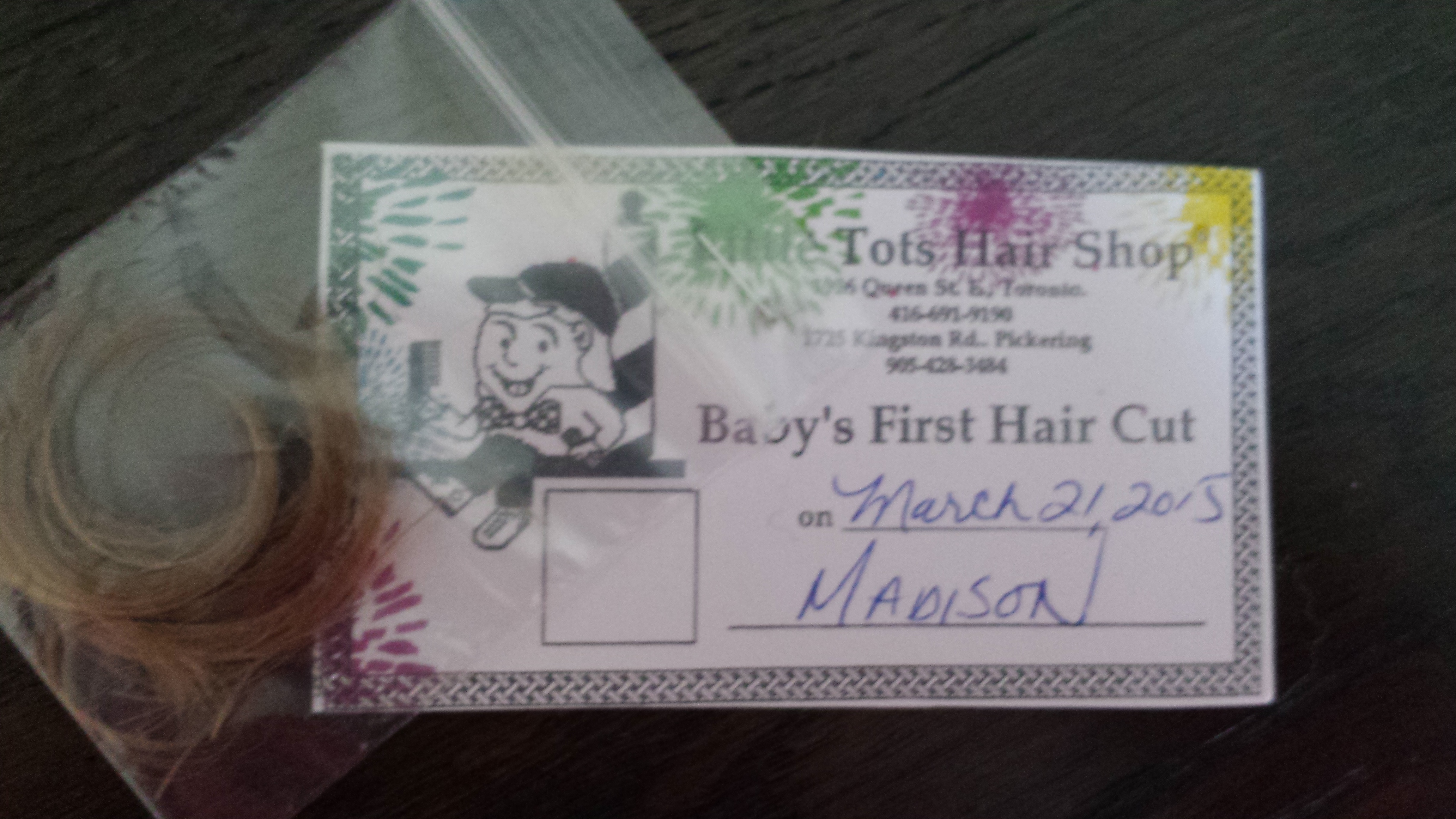 This morning Madi got her first hair cut…no more golden mullet! Myself, her Dad and Aunty Em took her to Little Tots Hair Shop on Queen East. They were great! The chair she sat in worked well for her lack of sitting strength and she was a champ! No fussing…just looked around and watched the other kids. It was quick…she was a pro…cute new hair do and a prize and souvenir lock of hair at the end. Great experience!