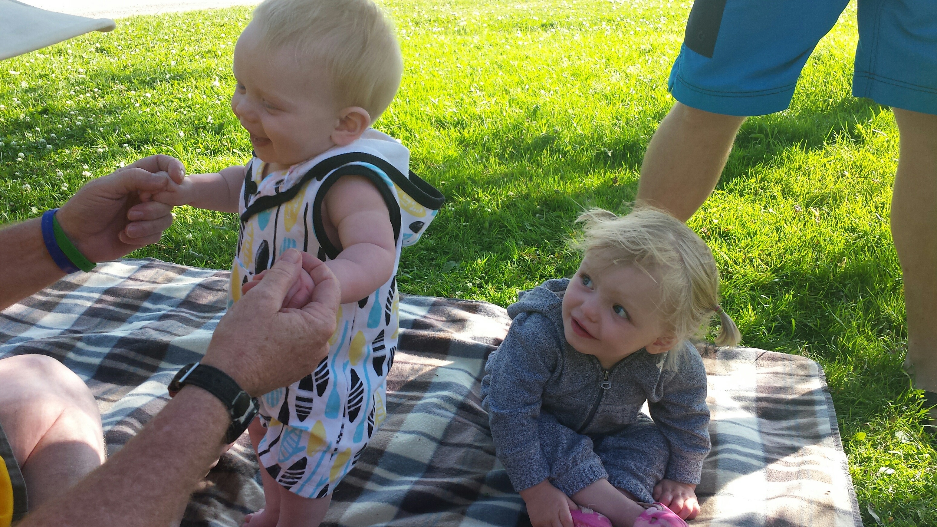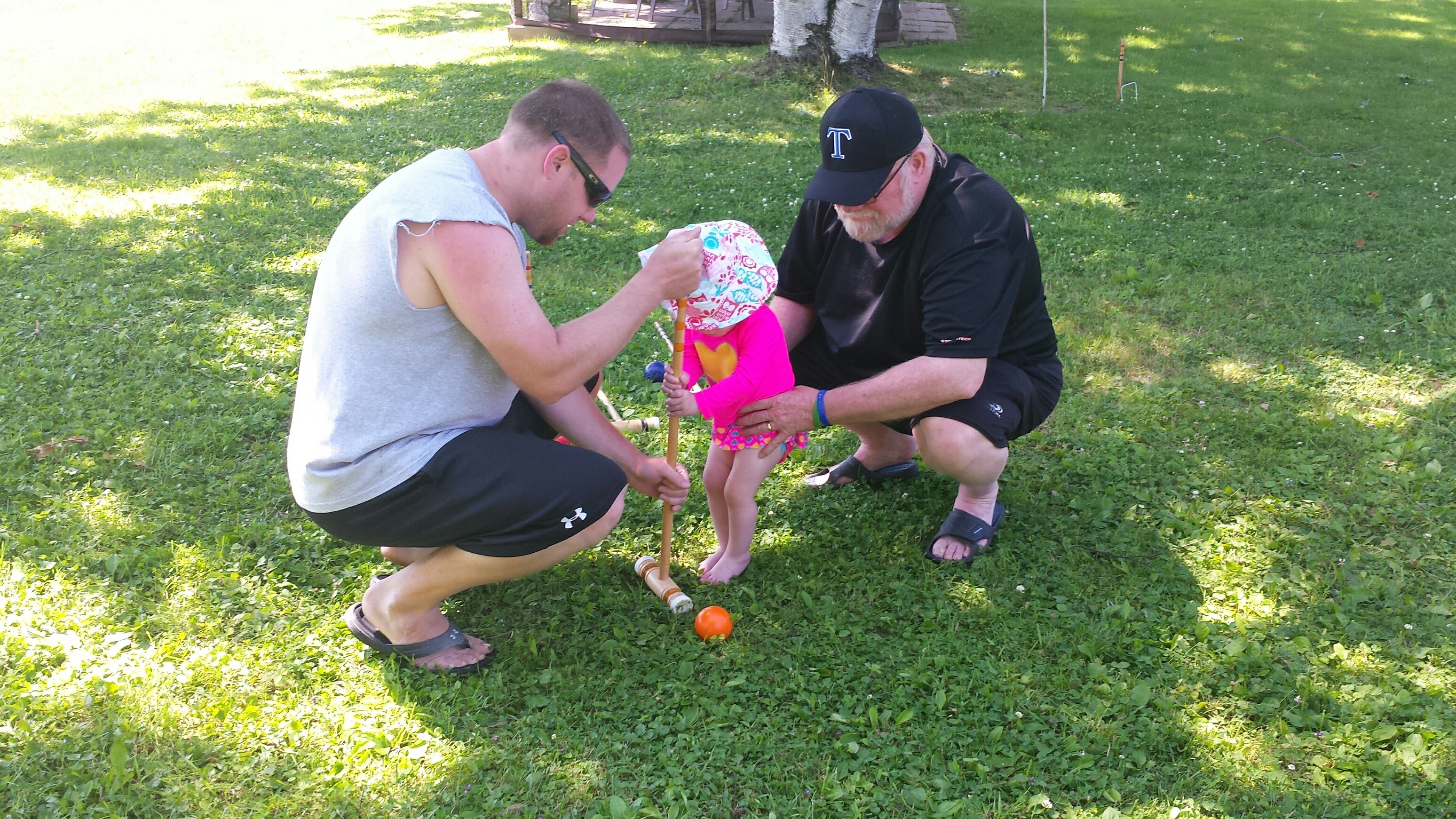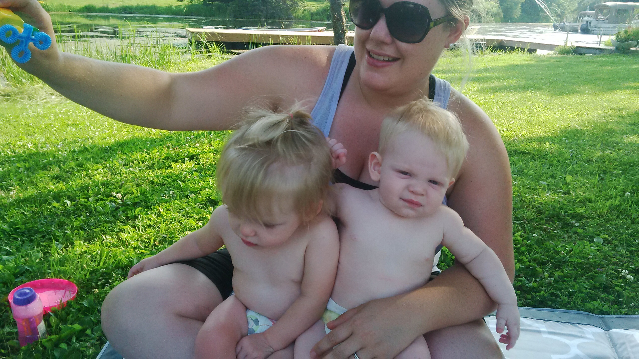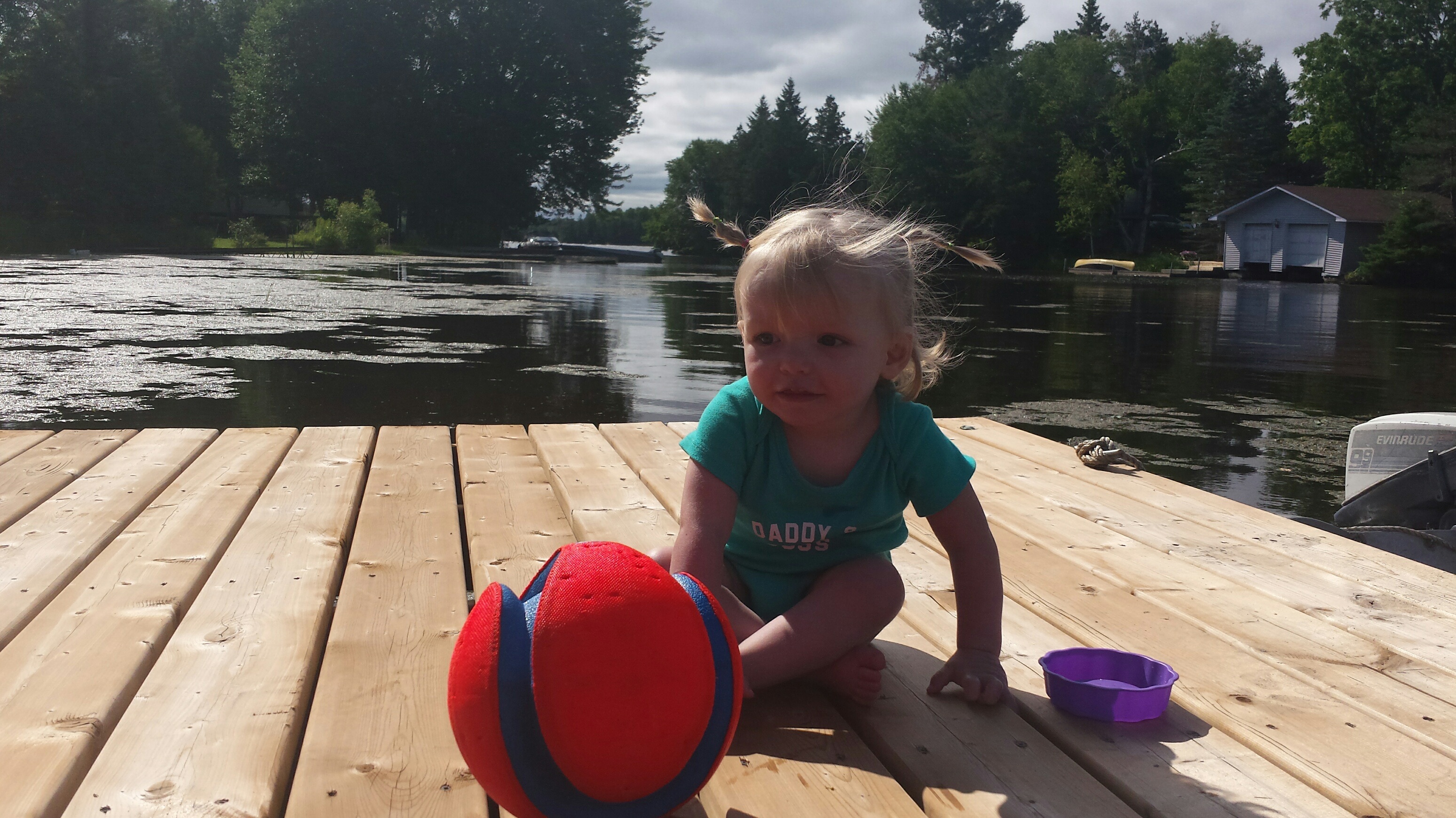 Madison had a great 5 days on vacation. We ventured to Westport which is north of Kingston to a rental cottage. It was an extra special time as this was the first vacation Nana and Grampa Gregoire had been on since Nana’s transplant. Madison and Nate had secretly planned some early morning play dates which everyone ended up being a part of. They practiced their sitting together, had many wrestling matches, swam, blew bubbles, bounced on Grampas knee, sang with Nana and tagged off on alternating naps. Madison had a bit of a break from her AFO’s and physio although we squeezed in stretching when we could and Madison fell in love with walking up and down the deck stairs. Poor Grampa and Dada’s backs will be sore for the next few days. Uncle Mark and Grampa taught Madison how to play crockette and she was so proud hitting the ball. She went to the beach, found ice cream in town, had a fire by the water, went for a boat ride and out for dinner on our last night to celebrate Auntie Nadia’s birthday. She loved watching Carter swim and chase his water toy and then run right back to shake all the water off. I think most of all she loved all the yummy food and time with everyone.