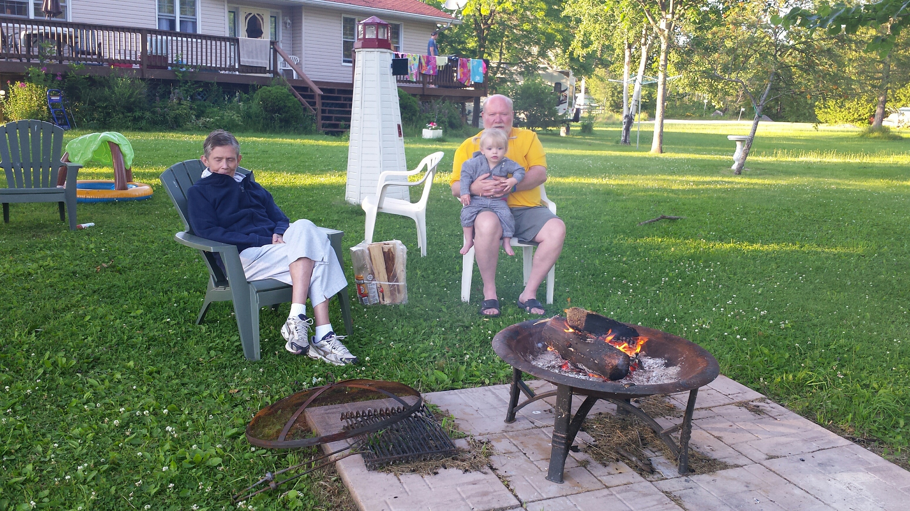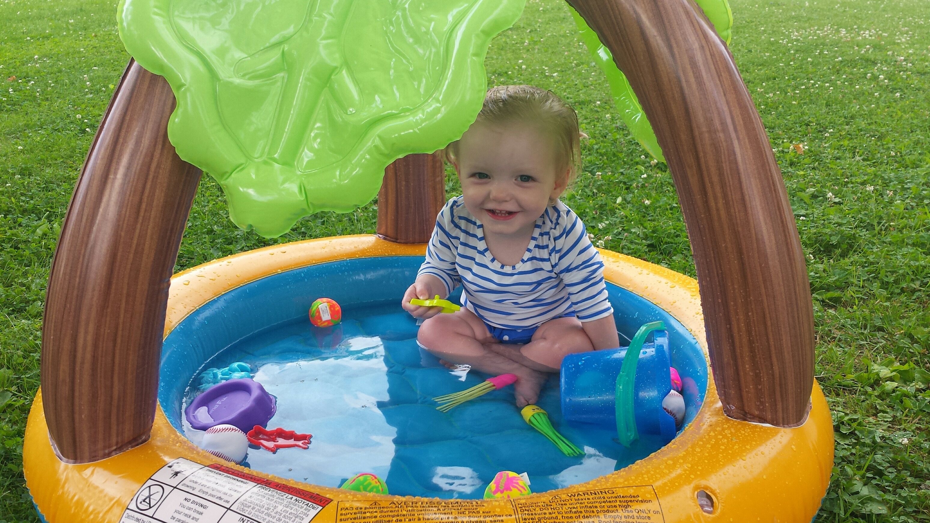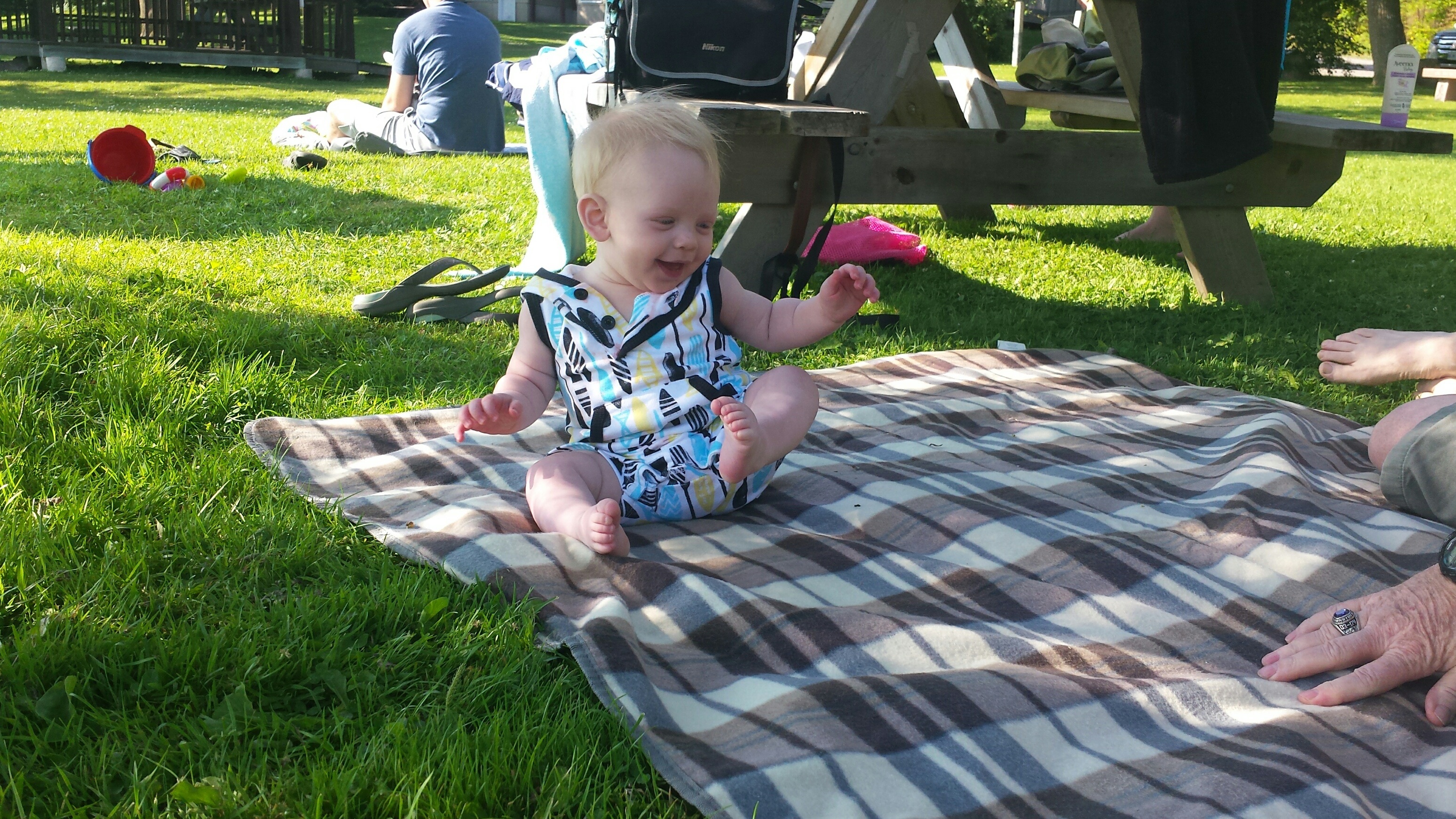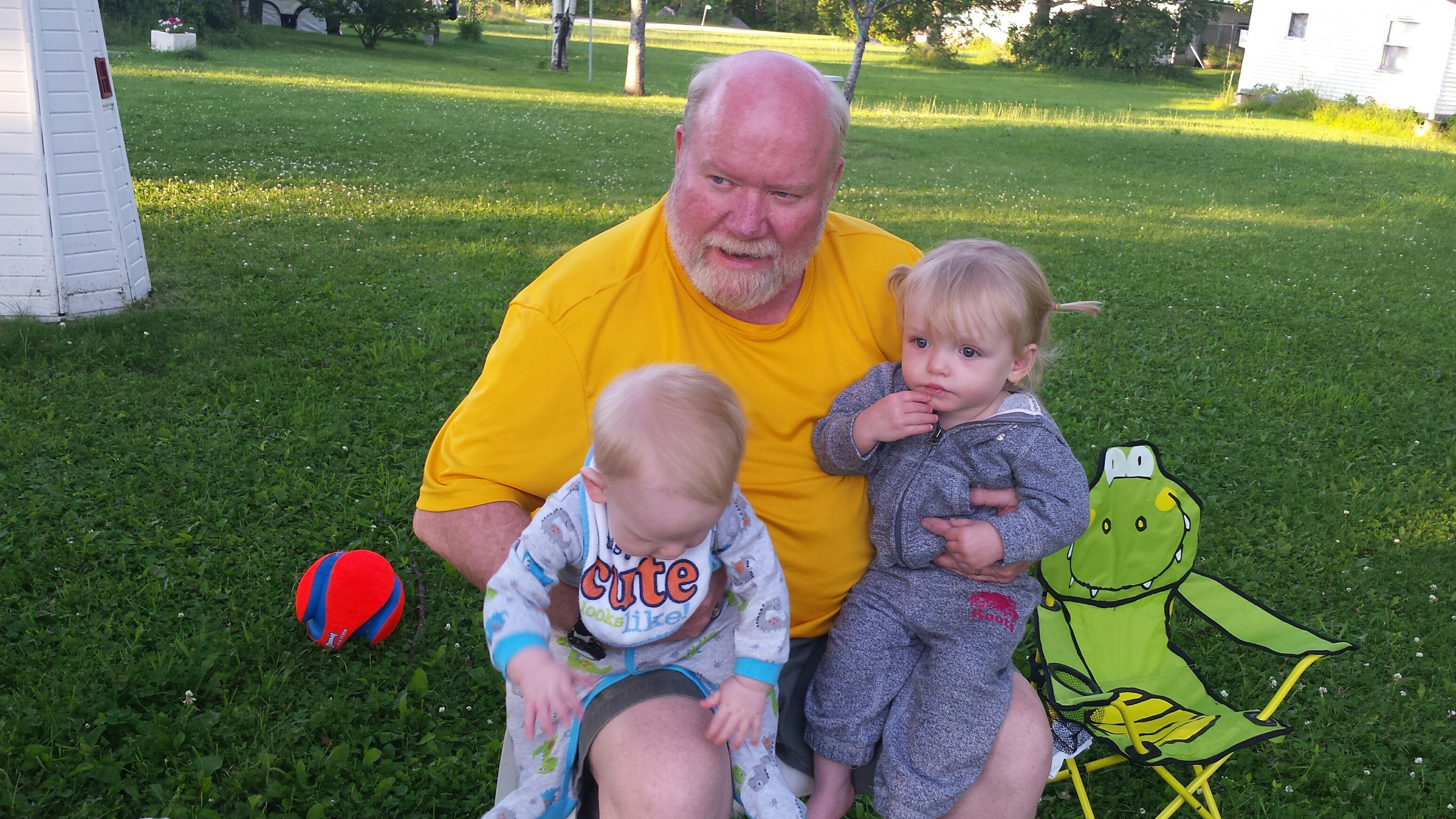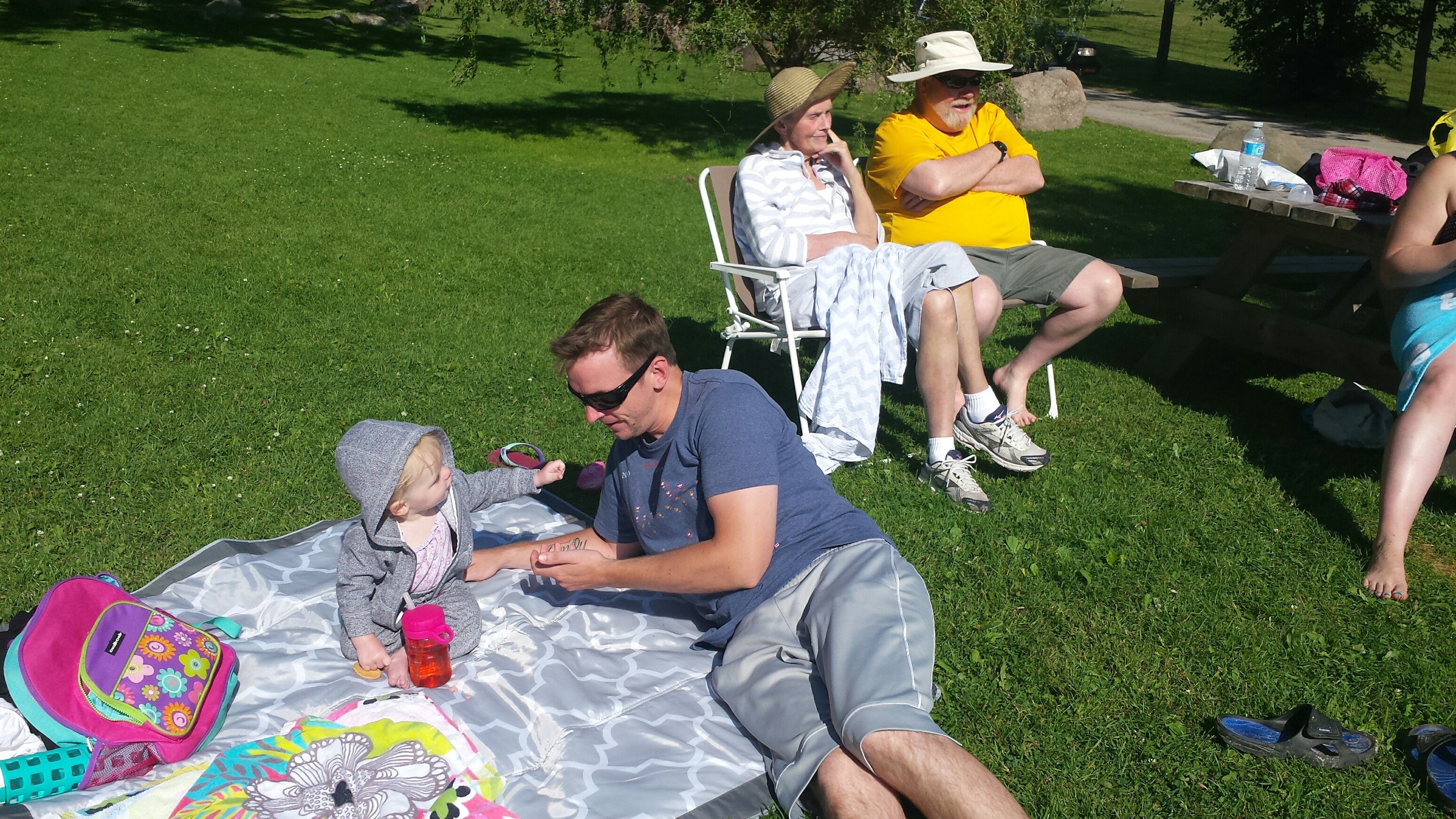 Madison had a great 5 days on vacation. We ventured to Westport which is north of Kingston to a rental cottage. It was an extra special time as this was the first vacation Nana and Grampa Gregoire had been on since Nana’s transplant. Madison and Nate had secretly planned some early morning play dates which everyone ended up being a part of. They practiced their sitting together, had many wrestling matches, swam, blew bubbles, bounced on Grampas knee, sang with Nana and tagged off on alternating naps. Madison had a bit of a break from her AFO’s and physio although we squeezed in stretching when we could and Madison fell in love with walking up and down the deck stairs. Poor Grampa and Dada’s backs will be sore for the next few days. Uncle Mark and Grampa taught Madison how to play crockette and she was so proud hitting the ball. She went to the beach, found ice cream in town, had a fire by the water, went for a boat ride and out for dinner on our last night to celebrate Auntie Nadia’s birthday. She loved watching Carter swim and chase his water toy and then run right back to shake all the water off. I think most of all she loved all the yummy food and time with everyone.