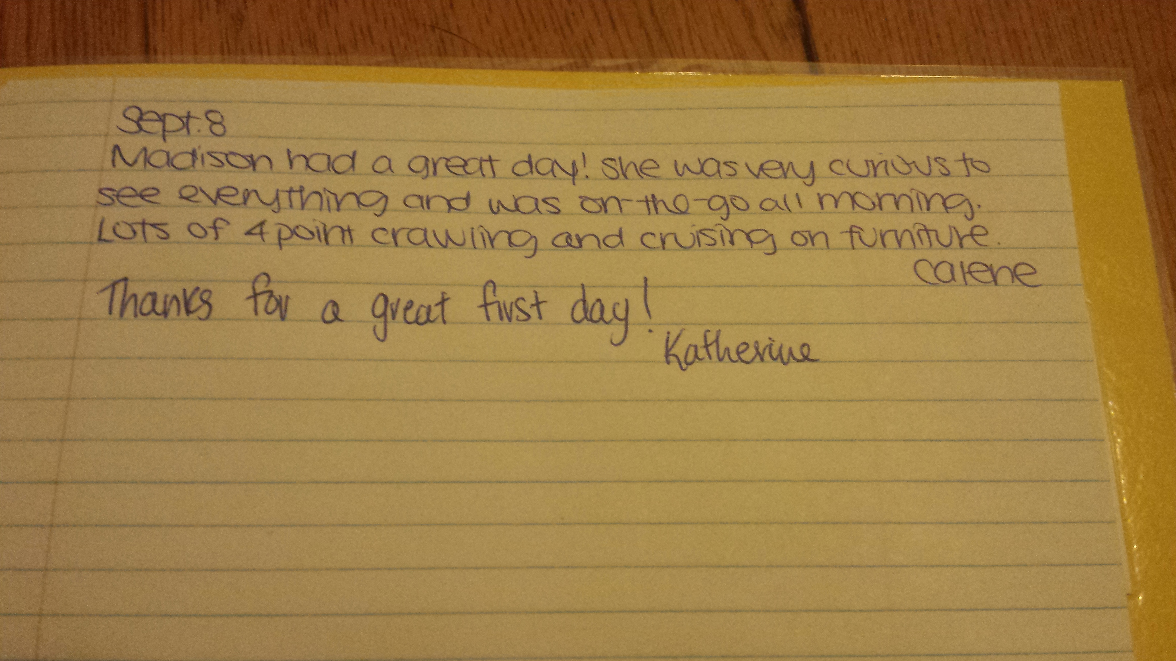 Madison had a fantastic first day! We were particularly happy to hear how mobile she was and how much they challenged her even on the first day. After reading her book tonight I asked her if she wanted to go back to school tomorrow and she said “ya please”