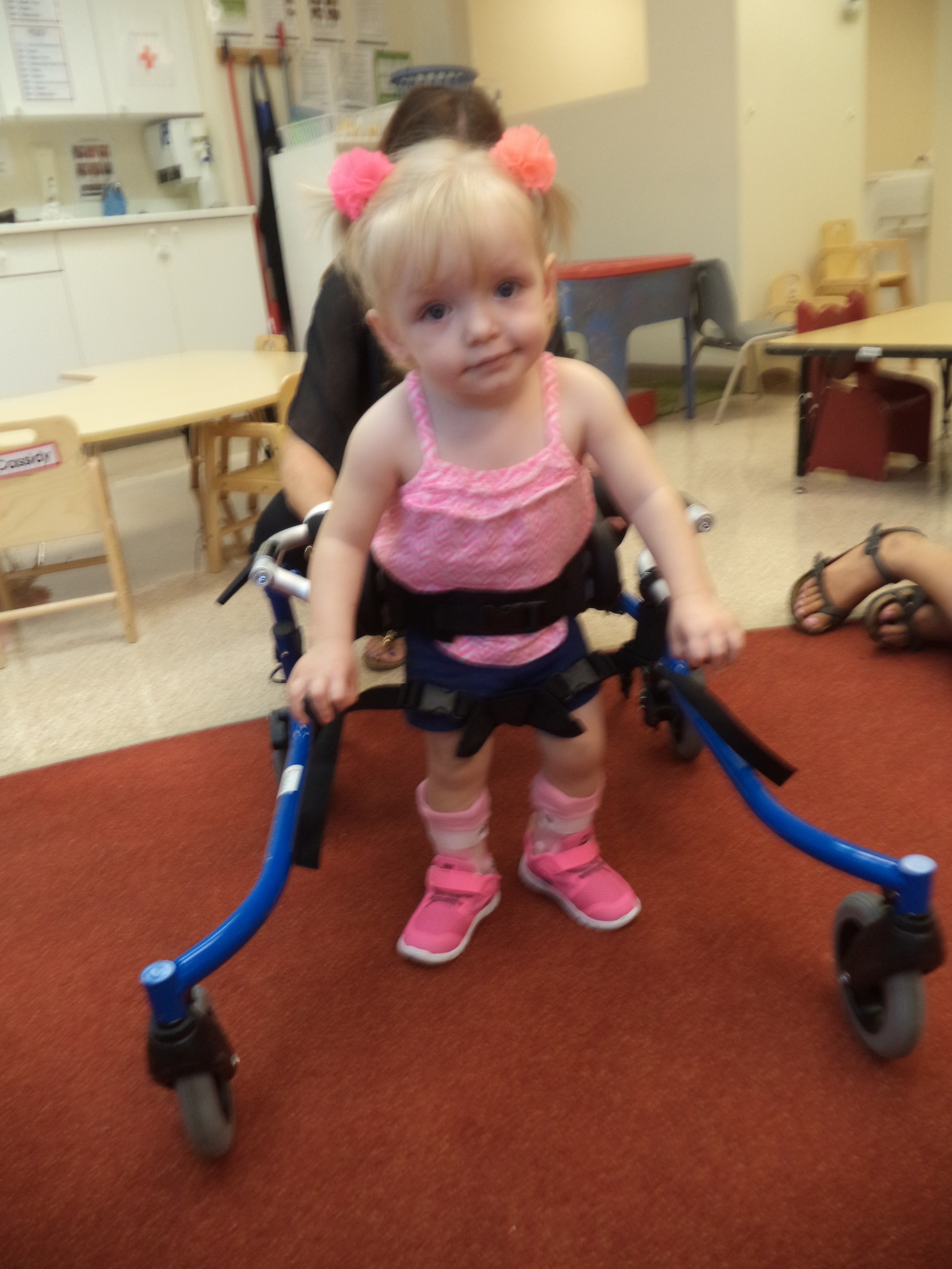 “Sending you some pictures of Madison fitted in her walker (and using it!) for school and enjoying time on the trampoline. I was telling James how she was so motivated to move all morning and how happy she was to do so. This was particularly evident at the end of music circle where she got a turn to cruise around with the teacher to shake hands and say “bye bye”. She had a fantastic first day!”