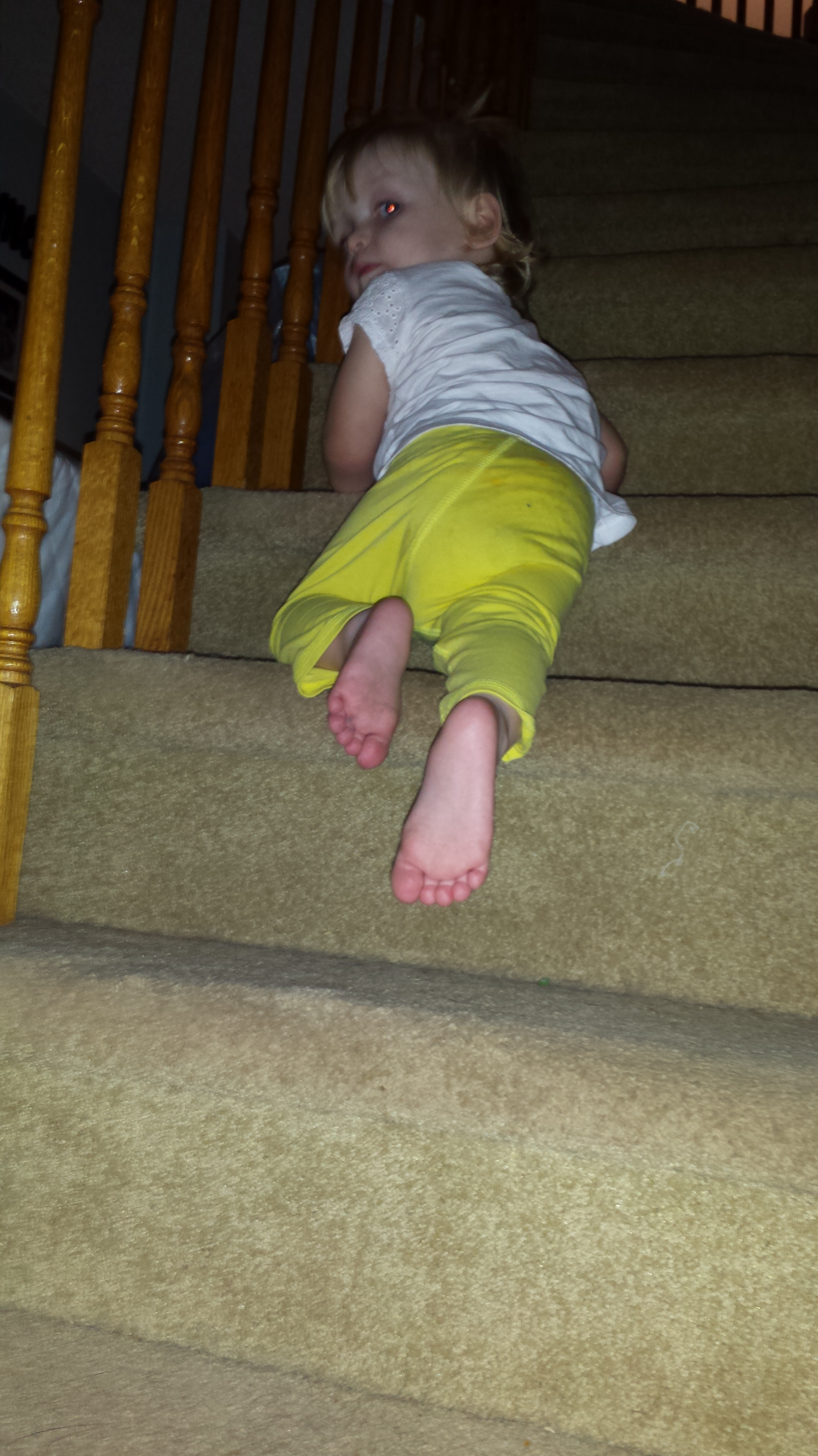 Mama was busy in the kitchen preparing food for the next day, doing dishes etc. while listening to Madison play in the next room. It was then quiet for a few minutes so Mama went looking for Madison. Madison was no where to be found. Finally a loud “Hi! ” filled the room and Mama noticed Madison on the stairs. She was not the usual 2-3 steps up on her own….she was 10 steps up (halfway up the stairs) all by herself! There were mixed emotions of proudness and excitment but Mama was also terrified as Madi could have tumbled down the stairs too. We were so proud of her courage and determination and confidence to do it all on her own. We’ve now realized the stairs are fair game in her mind so they have to be watched.
