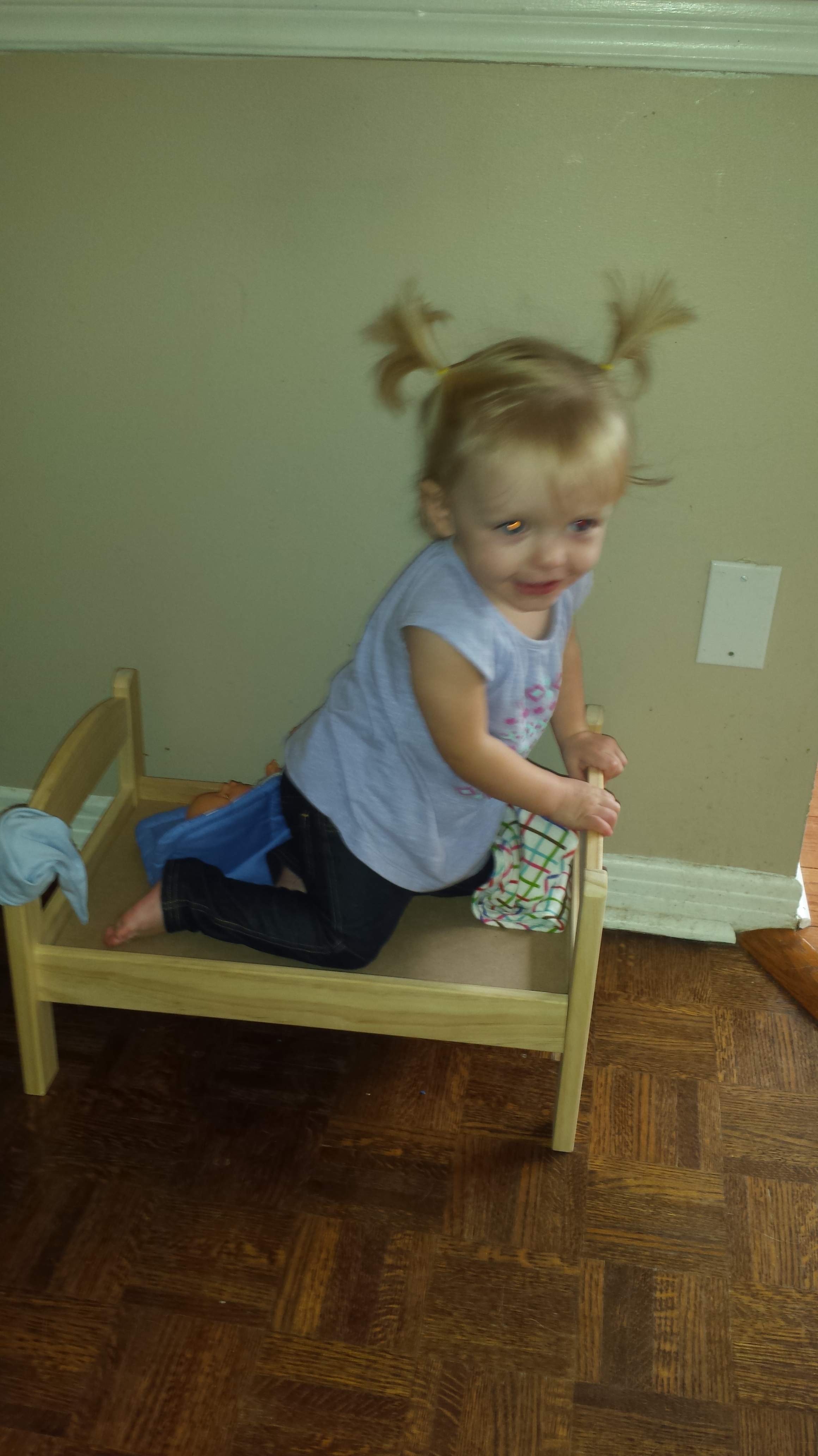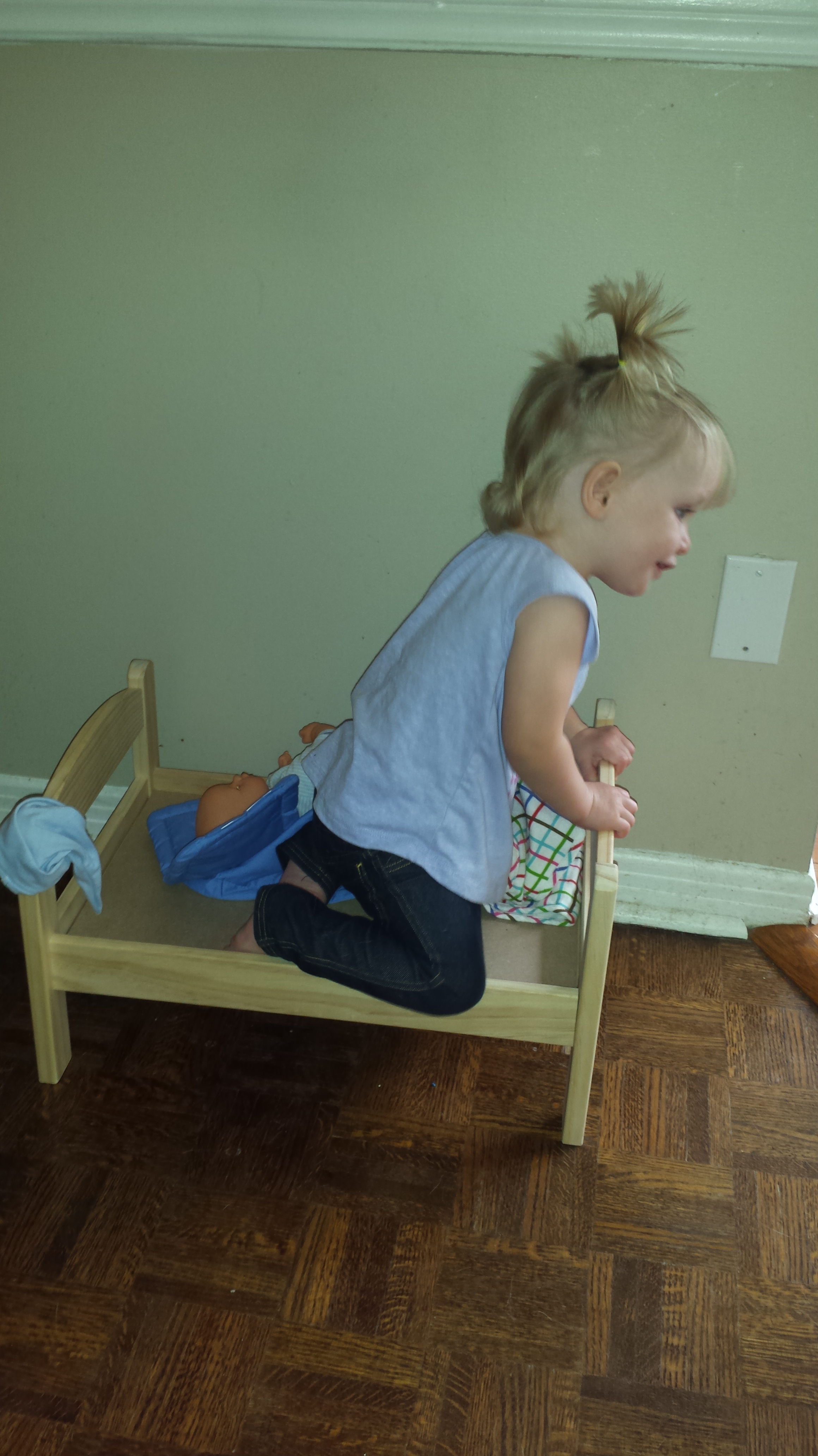 Madison has a mild obsession with her new baby doll to say the least. Mama and Dada have taken advantage of this obsession for therapy purposes. Madison makes the baby sit on the ground and then she will sit by herself on the ground. The baby is then put on its knees so Madison goes on her needs. The baby stands tall on the ground so Madison tries to stand tall on the ground. Once the therapy session was finished Madison put her baby to bed and then decided she should go into bed with her baby too. She is loving her new baby and bed from Nana and Papa – and based on all the new things she has been doing since she got it – Mama and Dada love it too!