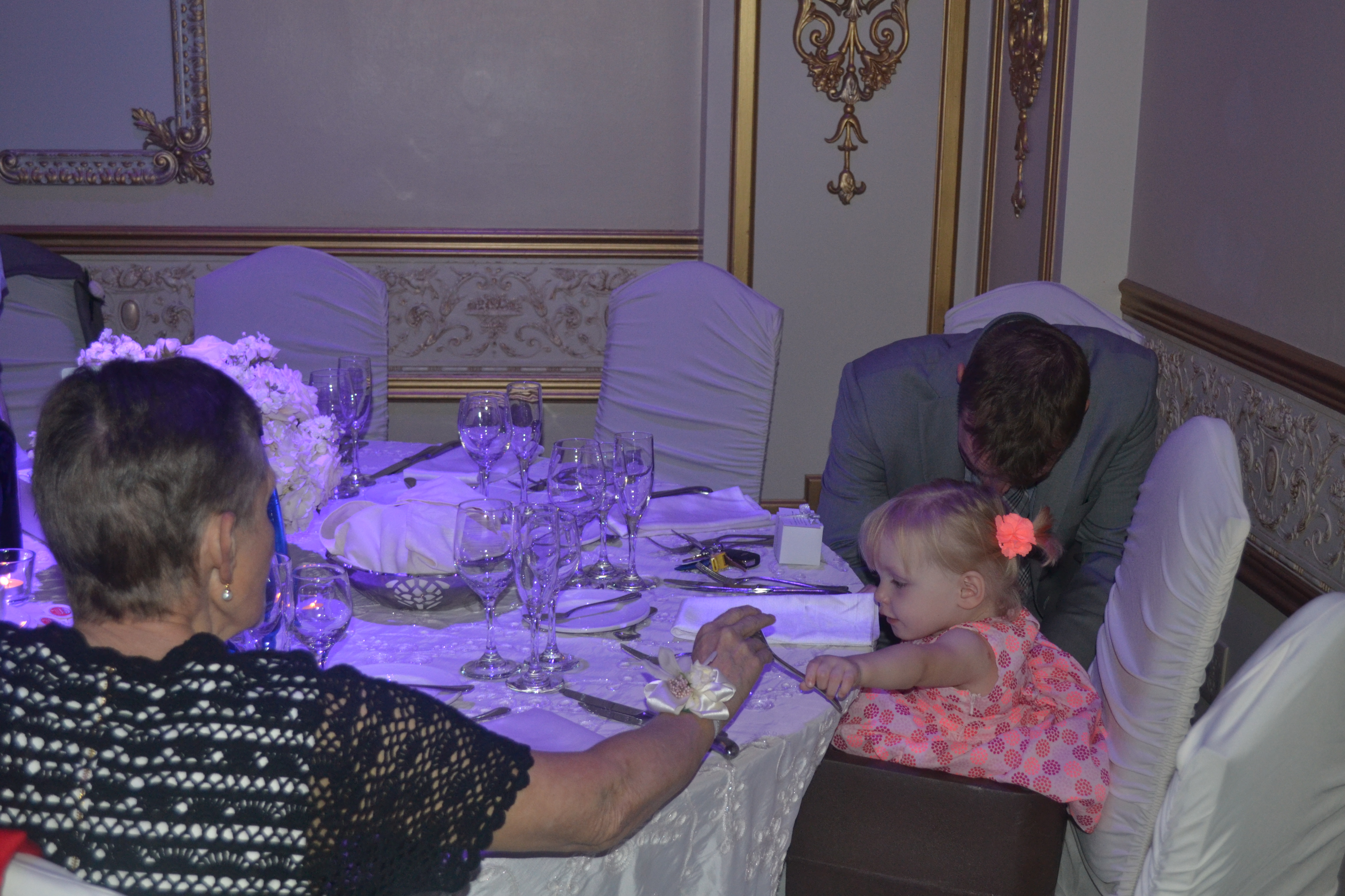 She sat in her first booster chair at the ceremony. She loved pointing and looking at all the different colours of lights and how they changed the look of the flowers. She ate lots! Pasta, cheese, apples, rice, chicken, potatoes, bread, veggies and the yummy chocolate ice cream dessert.