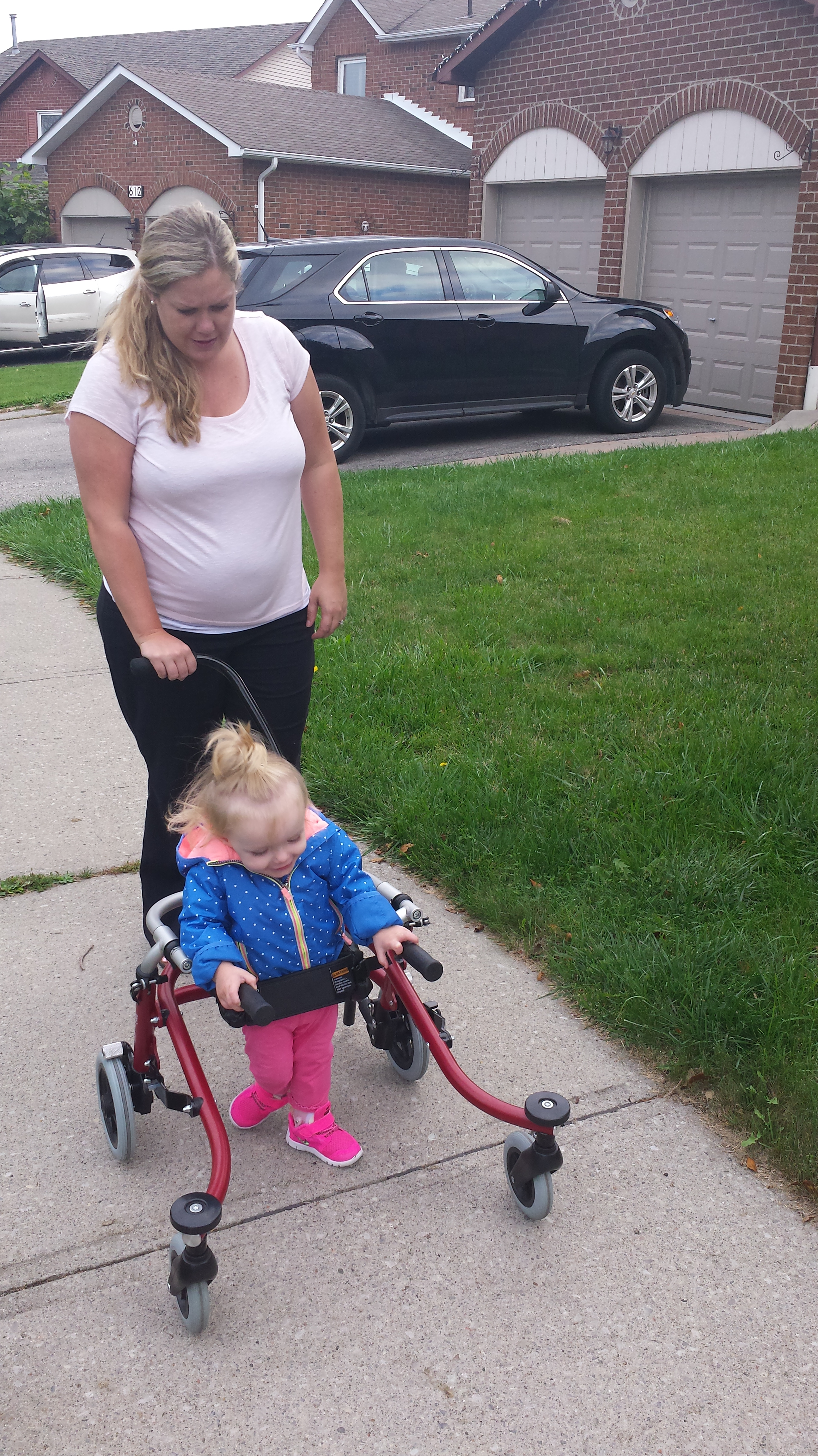 Before dinner we convinced Madison to go for a walk in her walker. She has been using her school one more throughout the day so she hasn’t been too interested at night using hers. We told her she would see Pam on her walk so she decided to go. Her walking is getting alot better. She is also more confident in her walker turning around and walking on uneven ground.