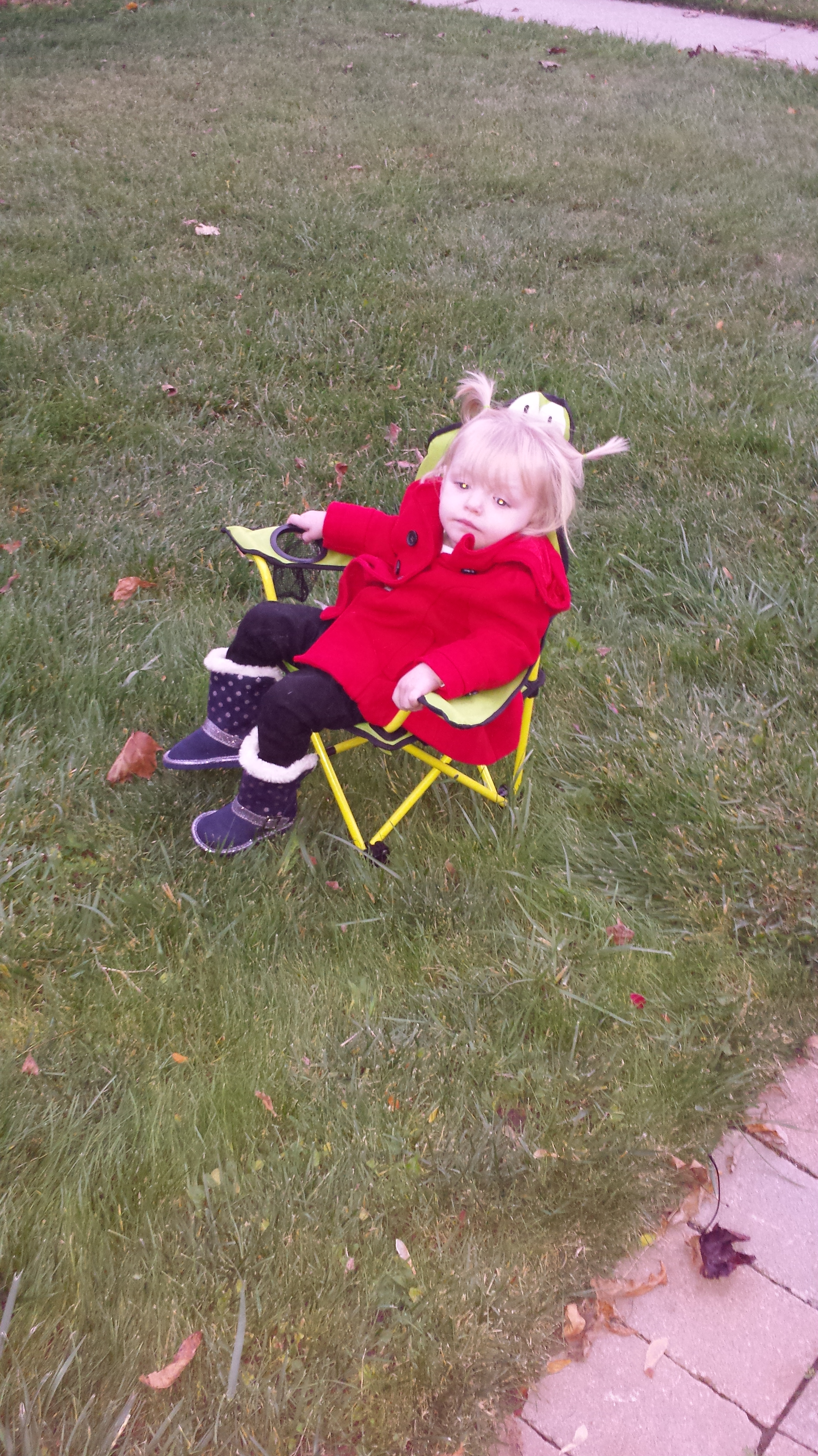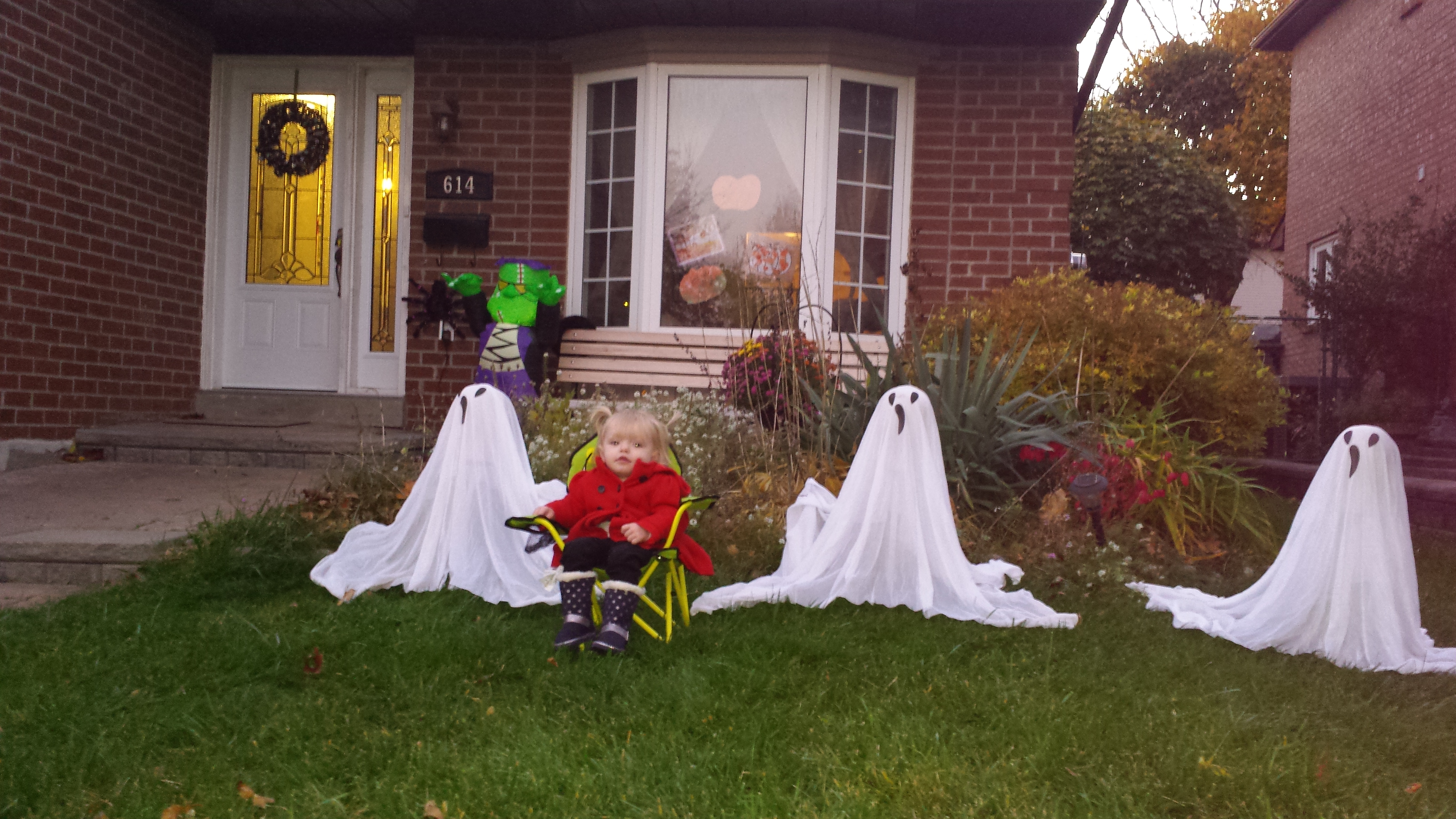 After a quick nap and a Pizza dinner (Halloween tradition) Madison helped set up her pumpkins and then was off for some Trick or Treating. She made it in her walker to 4 houses this year! Her first stop was to Pam and Medford’s house. She walked right up in her walker making her monkey sounds and was excited to get some bags of gold fish crackers – her favourite! After some piano playing and a nice visit she left for some other houses. She did a great job walking with her costume on and was only scared at one house. It had a big ghost on the front lawn so it took her about 10 minutes to reach the door. When she was all done she sat out front of our house for a while watching the other kids and handed out candy. At this time last year Madison had her first pony walker for only a few weeks and made it just next door. What an improvement and change from a year ago! Happy Halloween!