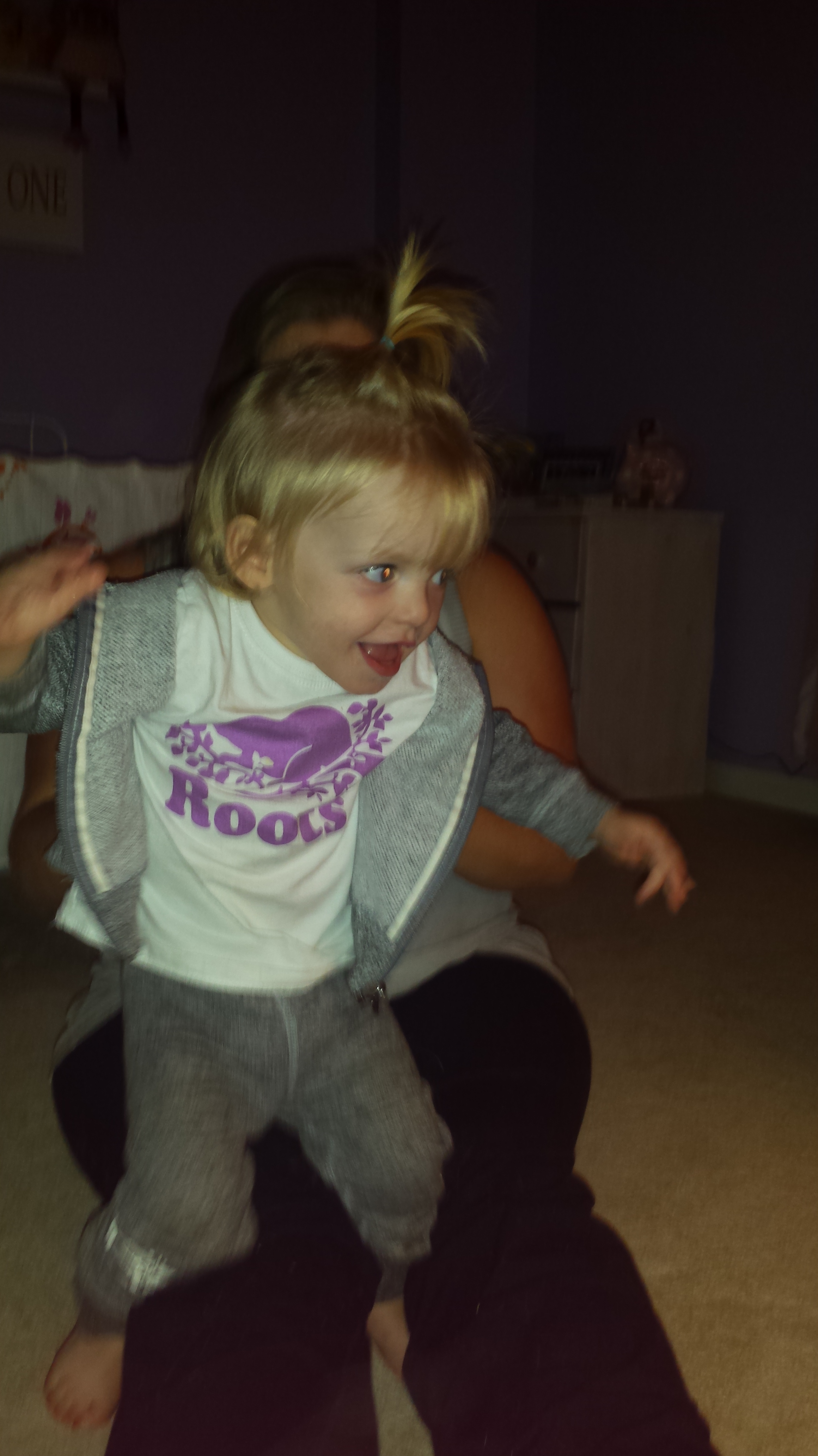 This afternoon Madison had no appointments so she spent the afternoon doing activities at home. One of her activities was standing independently. Madison started by sitting in a straddle position on Mama’s leg. She then says “nose over toes” and presses up to a standing position. She then squeezes her legs against Mama’s legs to try and hold herself up in a free standing position. She is able to hold it right now for about 1 second.