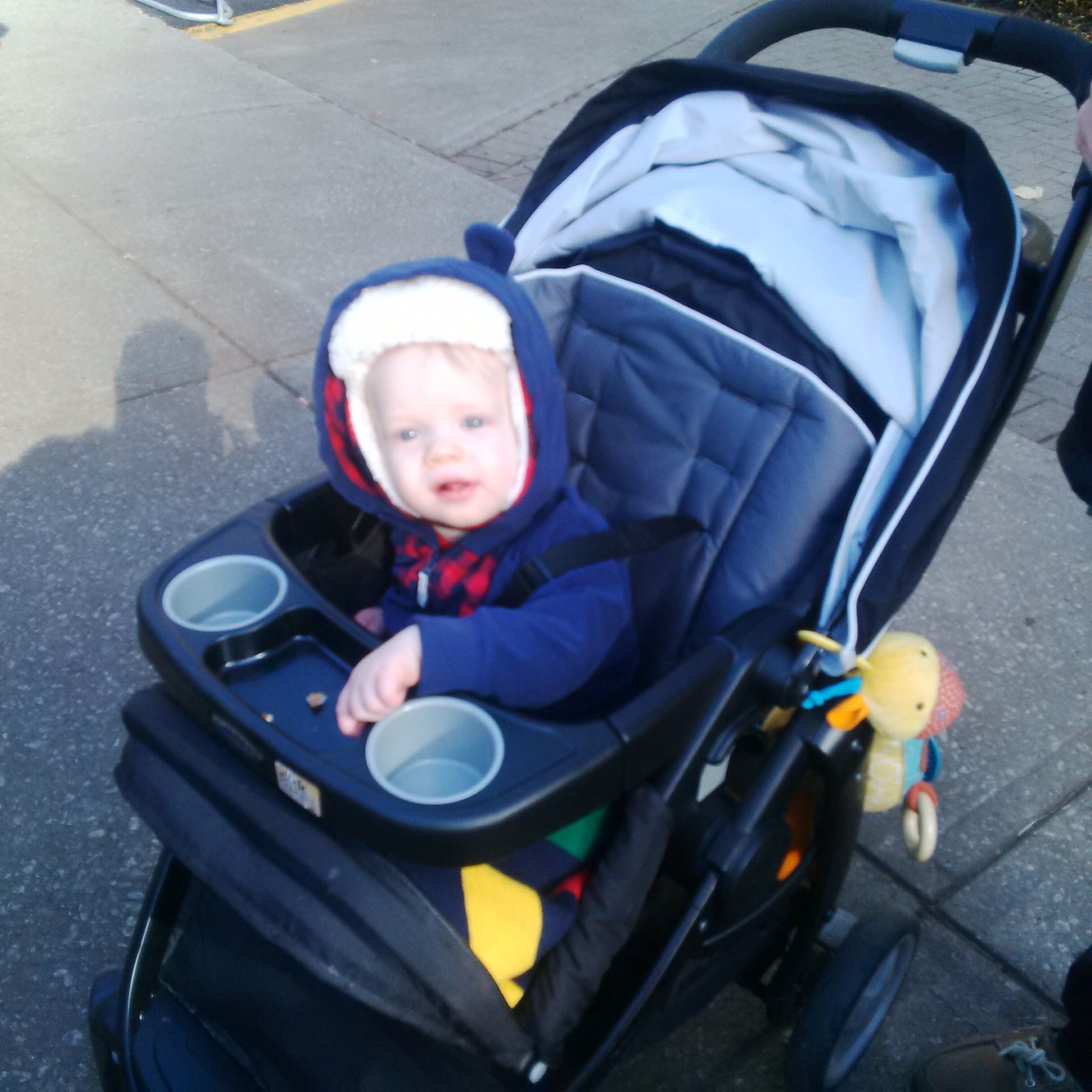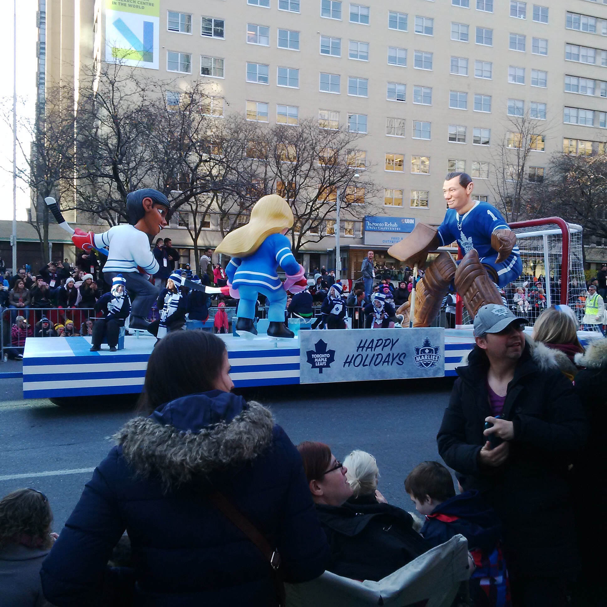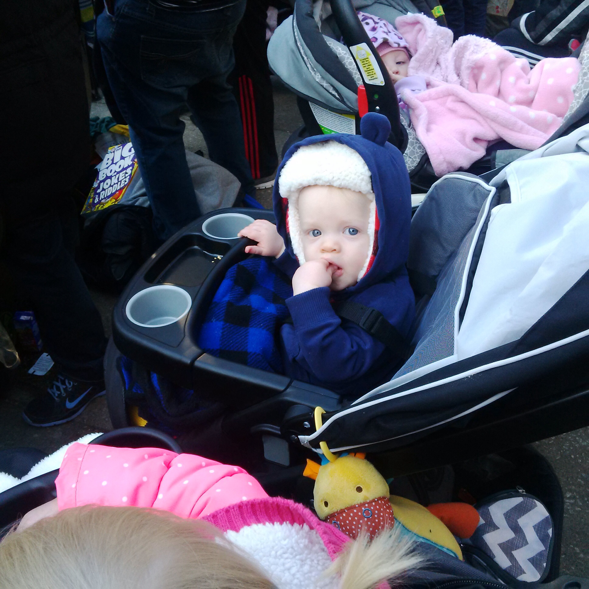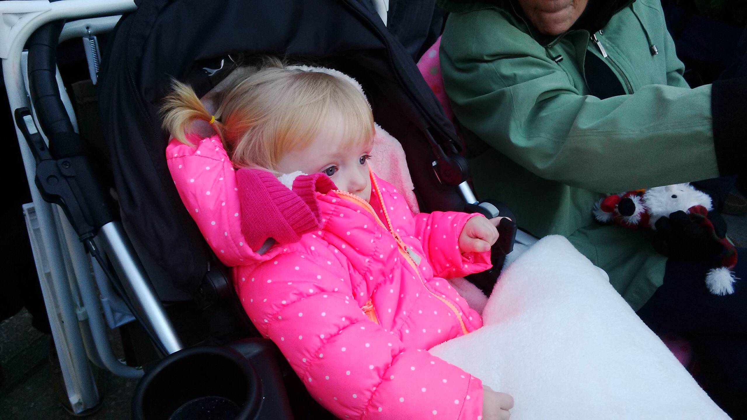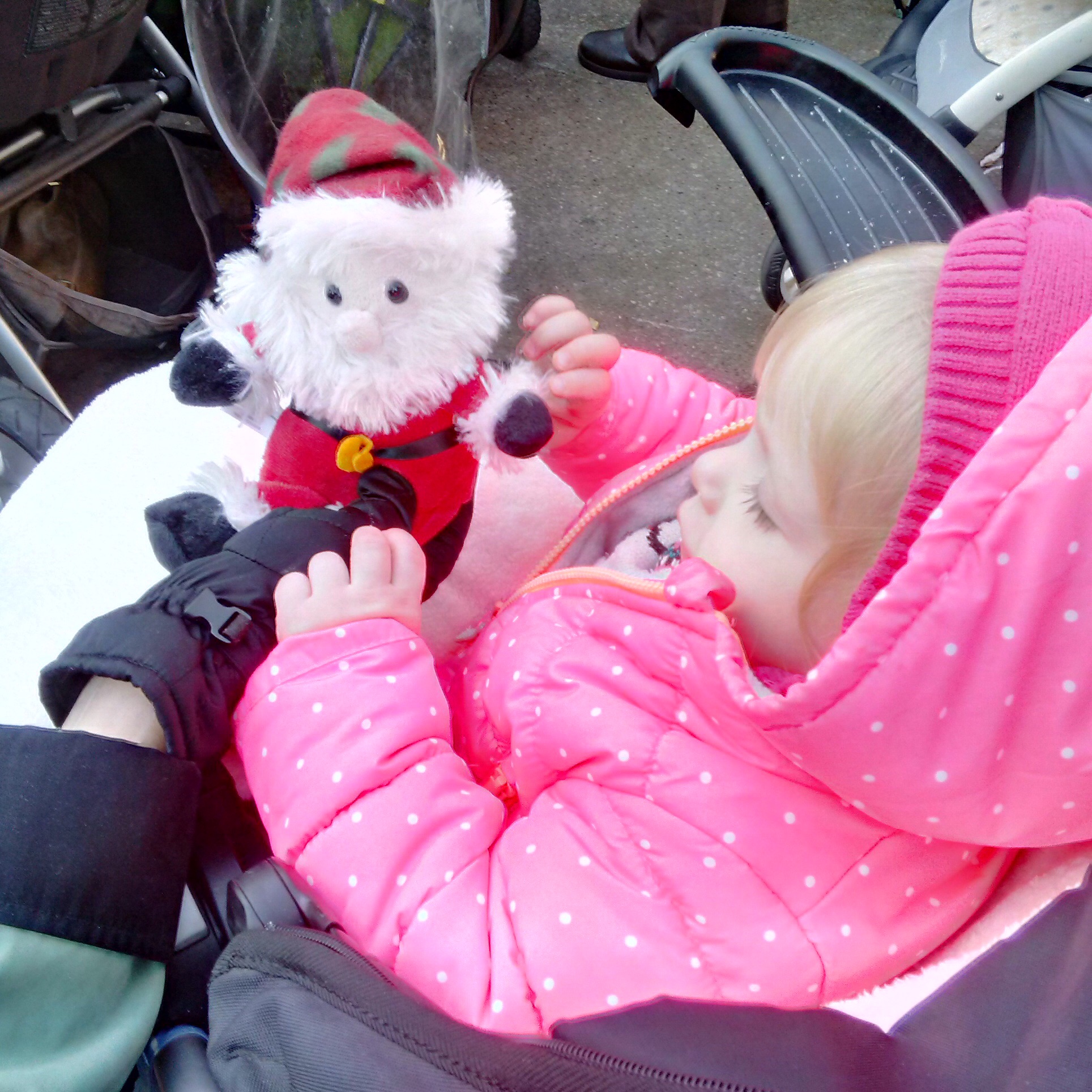 Today Madison spent her day with Nana, Papa, Uncle Mark & Nate and went to the Santa Claus Parade for the first time! It was a beautiful day! The day started with a visit at Nana & Papa’s house and gifts! Madison and Nate were given an advent calendar, reindeer antlers, a Christmas ornament and a Santa stuffy to snuggle with during the parade. They then made their way down to the parade and watched out front of Sick Kids Hospital. They had great seats! They watched all the floats go by, waved hi and had lots of yummy snacks and lunch – Madison loved her frosty cookies. The music from all the bands was great – Mark and Nate danced to the Western University marching band. Madison’s favourite floats were Mother Goose, The Blue Jays, Treehouse and of course Santa! Madison gave her Santa letter to one of his elves who was collecting and then they saw Santa! They waved hi and said ho ho ho! It was a fun day and a great way to kick off the holiday season. As soon as the parade was ended Madison fell asleep in her stroller and made her way back to Pickering. Thanks Nana & Papa for a great Sunday! She loved telling Mommy and Daddy about all the things she saw and watched the parade again on tv before dinner. Madison is ready for the holidays to start!