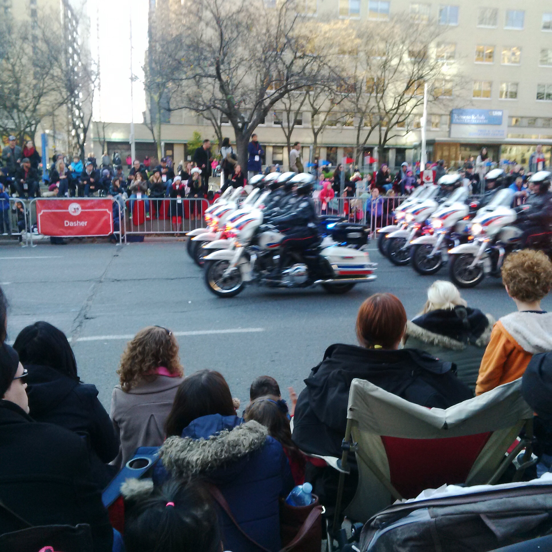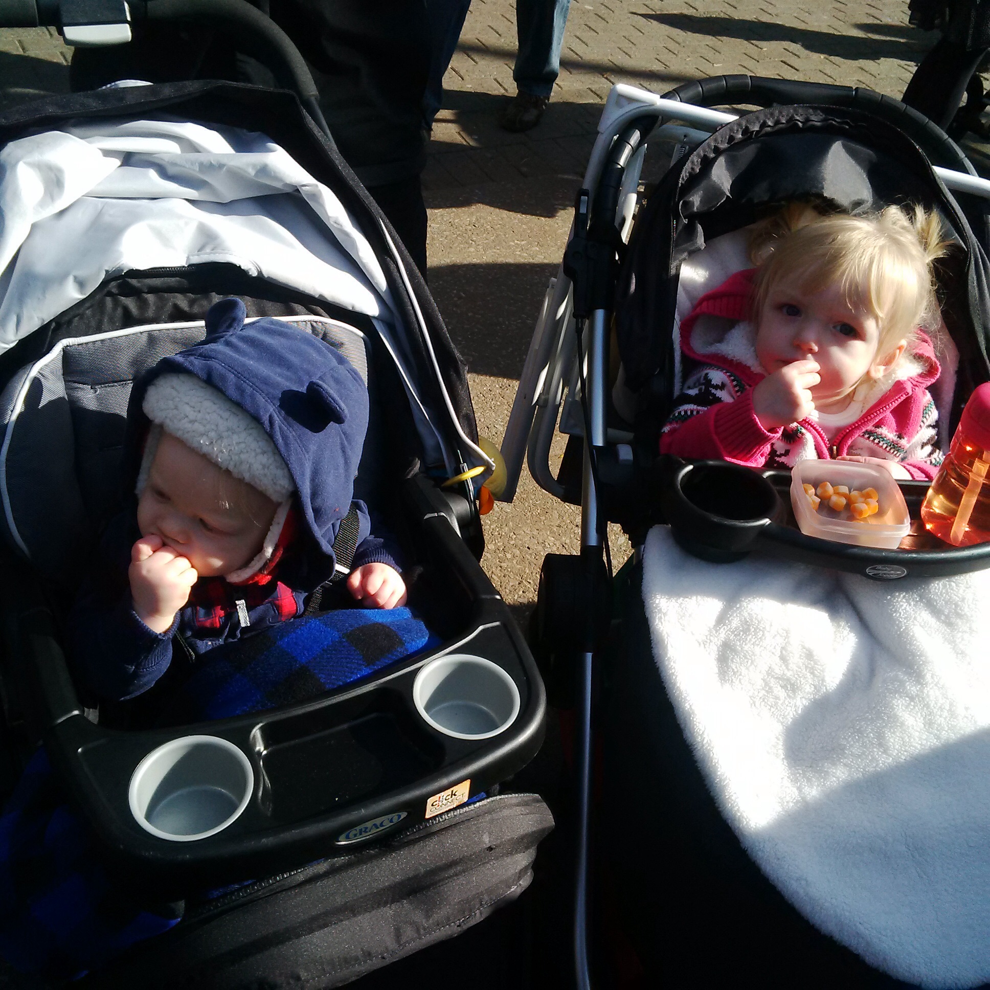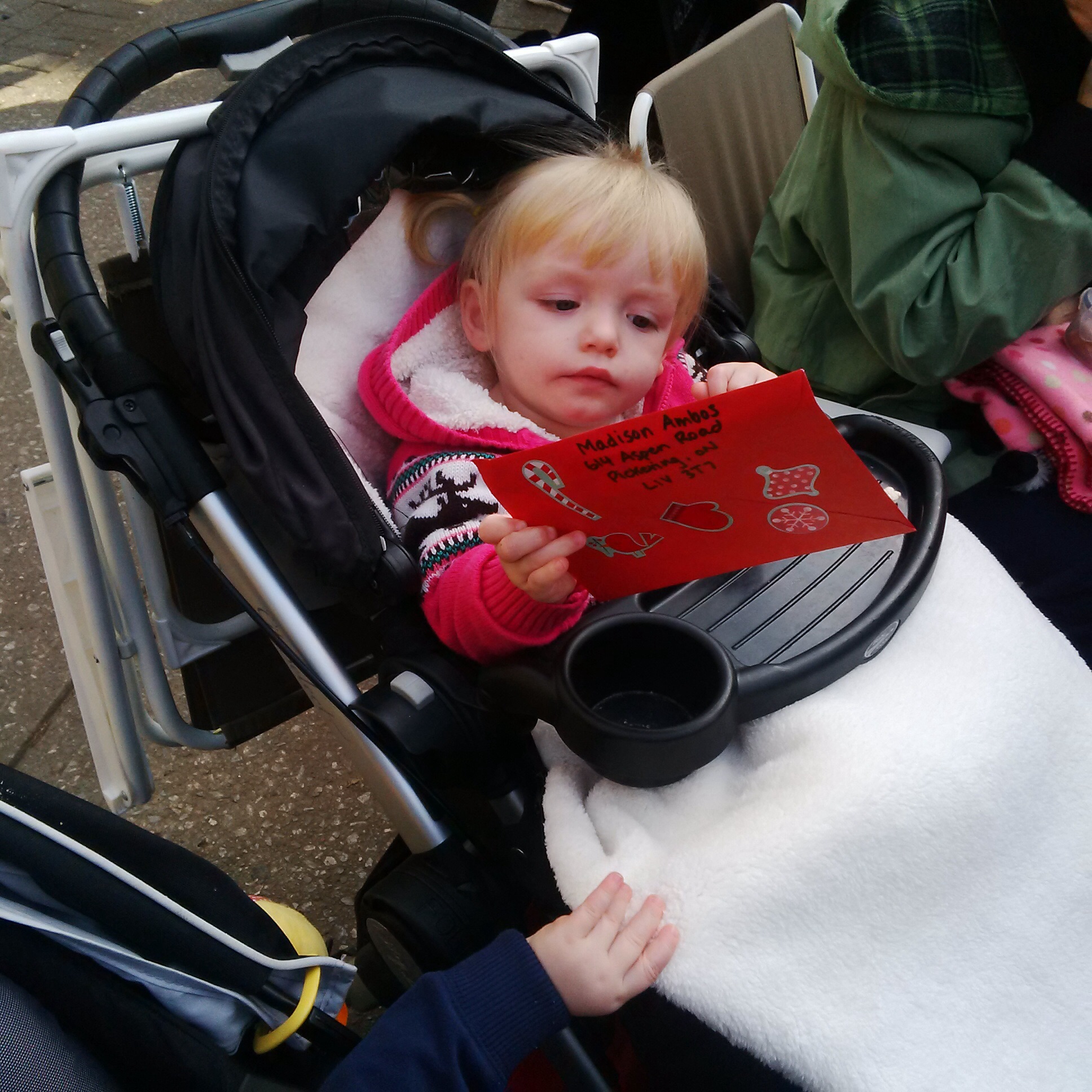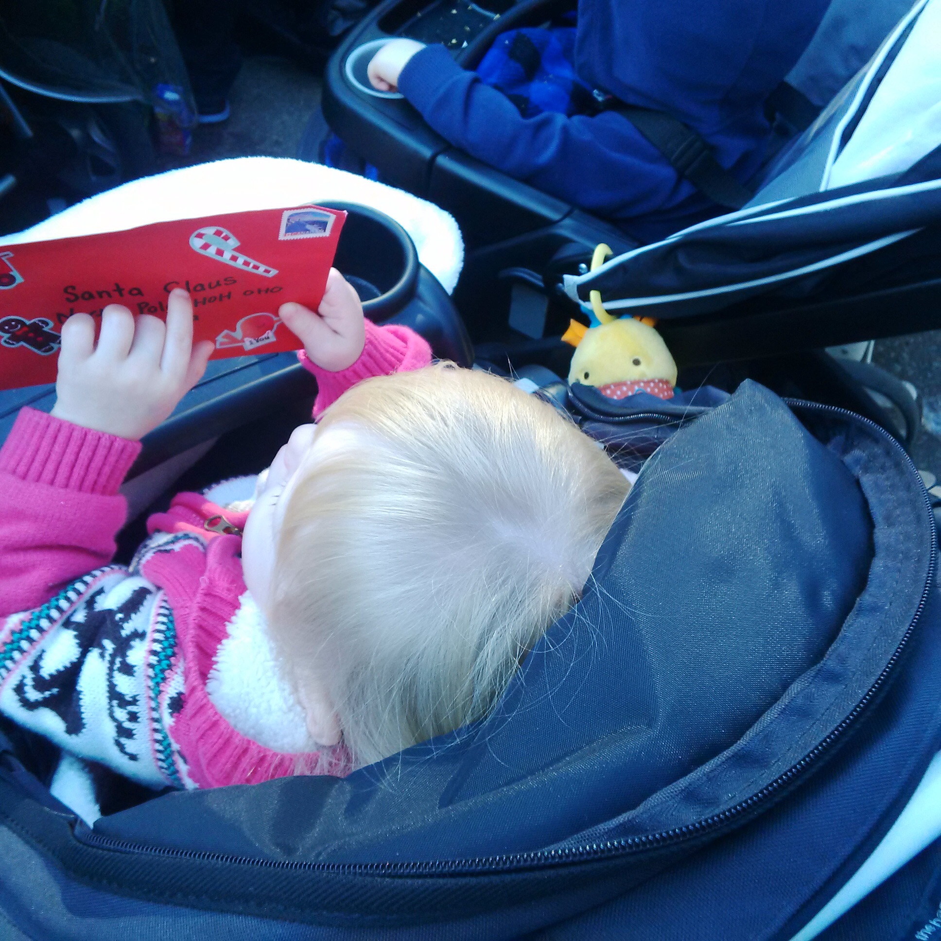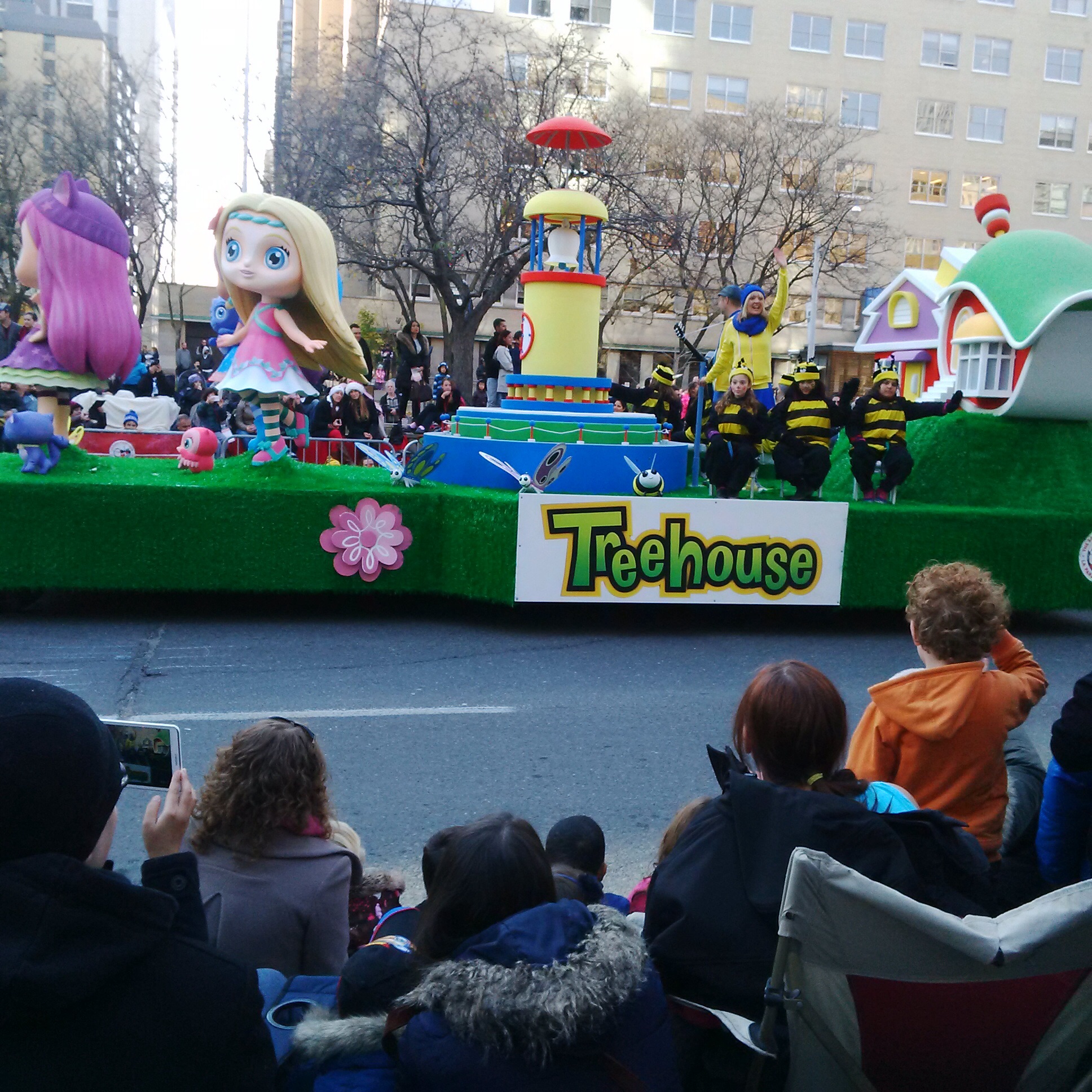 Today Madison spent her day with Nana, Papa, Uncle Mark & Nate and went to the Santa Claus Parade for the first time! It was a beautiful day! The day started with a visit at Nana & Papa’s house and gifts! Madison and Nate were given an advent calendar, reindeer antlers, a Christmas ornament and a Santa stuffy to snuggle with during the parade. They then made their way down to the parade and watched out front of Sick Kids Hospital. They had great seats! They watched all the floats go by, waved hi and had lots of yummy snacks and lunch – Madison loved her frosty cookies. The music from all the bands was great – Mark and Nate danced to the Western University marching band. Madison’s favourite floats were Mother Goose, The Blue Jays, Treehouse and of course Santa! Madison gave her Santa letter to one of his elves who was collecting and then they saw Santa! They waved hi and said ho ho ho! It was a fun day and a great way to kick off the holiday season. As soon as the parade was ended Madison fell asleep in her stroller and made her way back to Pickering. Thanks Nana & Papa for a great Sunday! She loved telling Mommy and Daddy about all the things she saw and watched the parade again on tv before dinner. Madison is ready for the holidays to start!