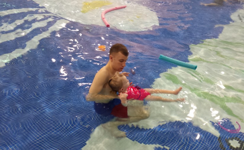 Madison had a swim class with Ryan tonight. One of the things they worked on was transitioning from sitting on the side of the pool to putting her feet flat against the wall to pushing off as a way to enter the water. Ryan told her the different steps of what she needed to do and she listened well and did a great job following through. They also worked on walking in the water up the ramp and floating on her back.