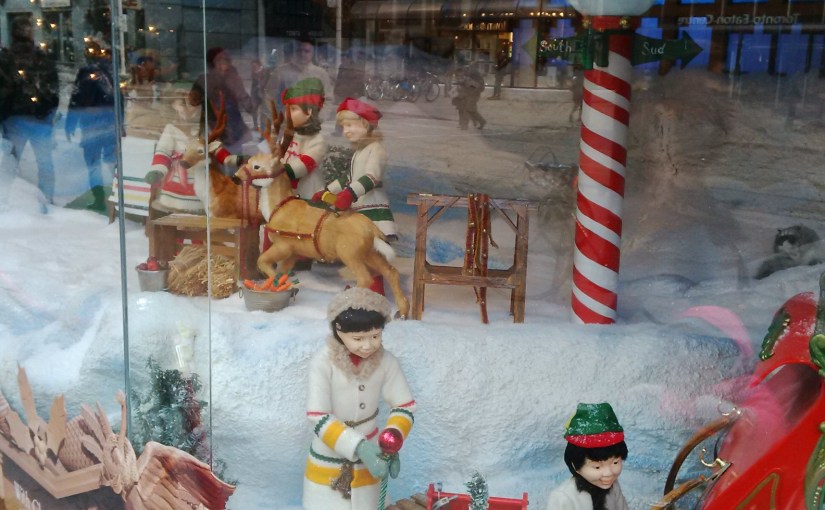 After brunch Madison, Nana and Papa went downtown to check out the Christmas windows at The Bay. Madison told us she saw Santa, a mouse, a horse and toys. It was a bit chilly but everyone bundled up in the snow. They also went to look at the giant tree at the Sheraton Centre and the big Toronto sign at City Hall. It was a fun downtown adventure to get excited for Christmas! Mommy and Daddy want to say a big thank you to Nana and Papa for the much needed break.