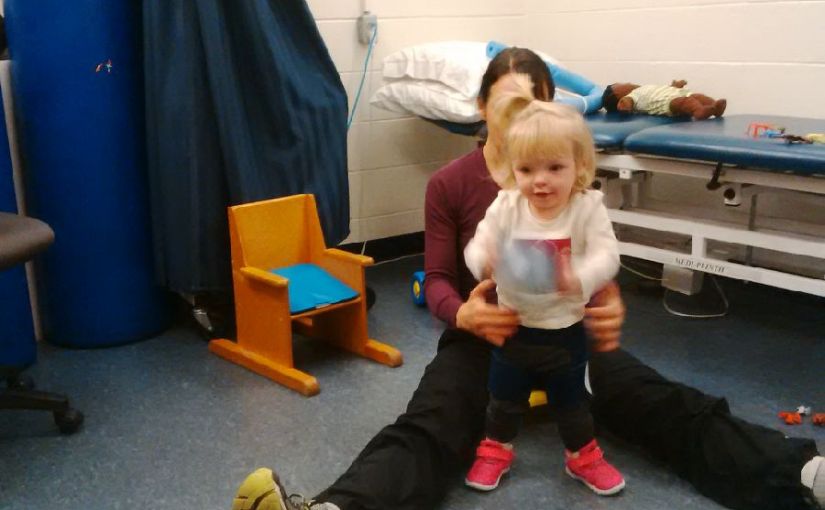 After school today, Madison headed to Nana’s. She had a super long nap, a big lunch and then was off to physio at VV with Stephanie. Madison continues to impress everyone with her progress each week. Today Nana and Papa watched her practice her walking, squatting to standing, walking on the treadmill and independent standing. Madison loved the background music of jingle bells that Papa played for her. The most exciting activity was watching Madison independently go from sitting in her chair to standing up all by herself! She did it several times in a row and everyone was very proud of her. Mommy and Daddy were especially happy to see this skill developing as they are also seeing the transfer of it in other environments like at school and home. Seeing specific skills worked on at therapy being naturally transferred into real life situations is so rewarding.
