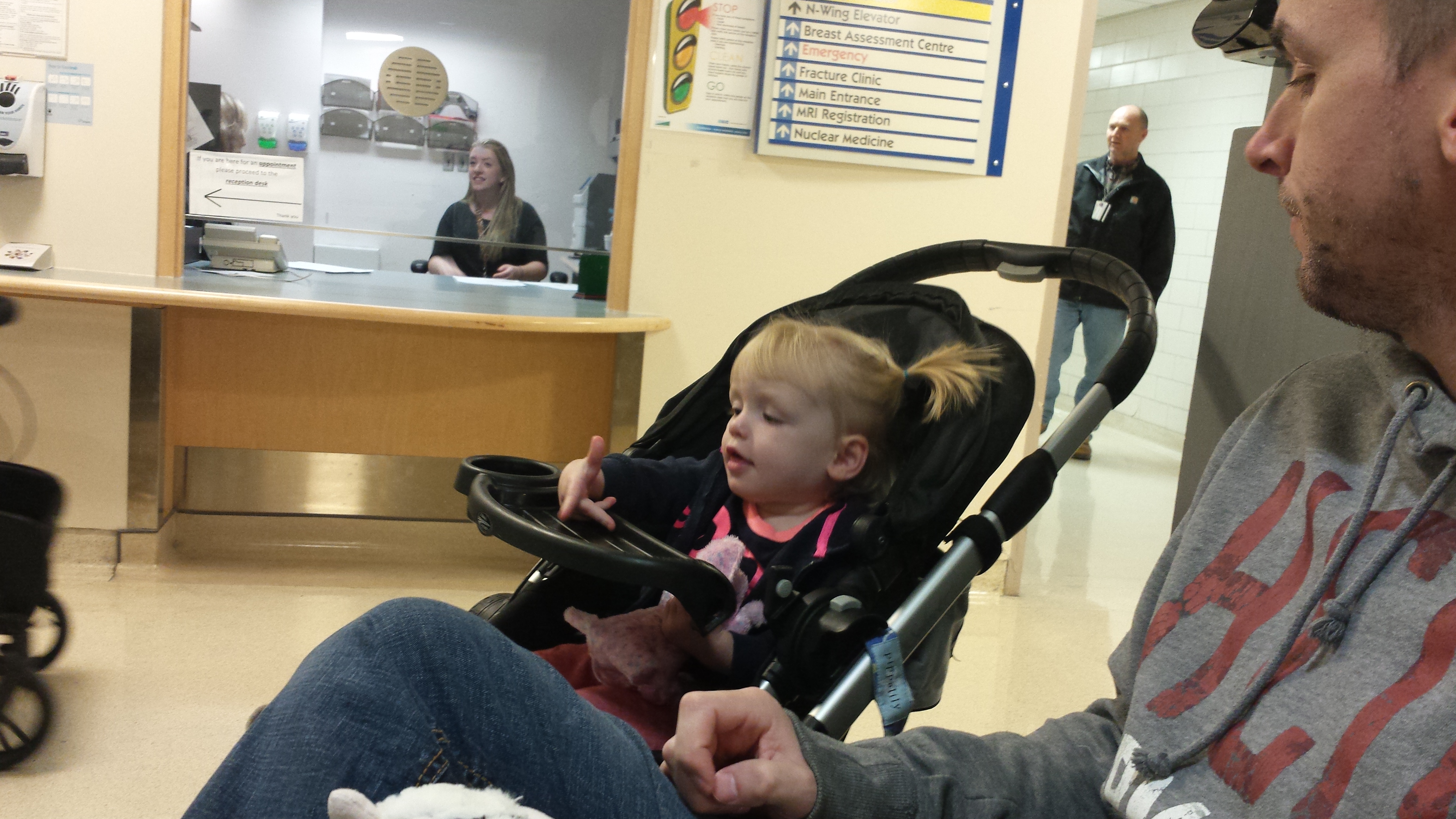 Today was Madison’s first missed day of school. It’s hard to believe that it is November and she has not been sick and needing to stay home (knock on wood). She missed her first day to go to the Oshawa Hospital to have an xray of her hips and pelvis. One of her specialists from Edmonton and another from Grandview wanted to see the anatomy of her hips prior to having botox to make sure her tone issues were from muscle issues and that her bones are developing and aligning as they should. As usual she was a rock star! She went right in with Daddy, lied down on the table and got 2 xray’s. One of her legs extended and one of her legs bent and rotated to the sides. Daddy said she pointed to the machine the whole time and said “machine – up!” And waved hello. No tears! She was in and out in 5 minutes.