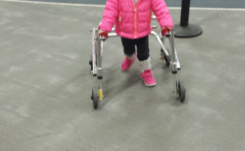 Madison did a great job at physio considering how tired she was. She walked in and out of her session in her walker. We now have to try and be early for things and have time after as it takes us a lot longer with Madison using her walker hy herself – but it is so worth it! Madison and Stephanie worked on standing in her ski boots, walking in her walker and learning how to lift the walker to turn and did lots of good stretches. She used Stephanie’s gators and got a good long stretch. Stephanie let Madison borrow the gators so she can do some deep long stretches at home. Madison stood by herself for 10 seconds and took 3 independent steps!!