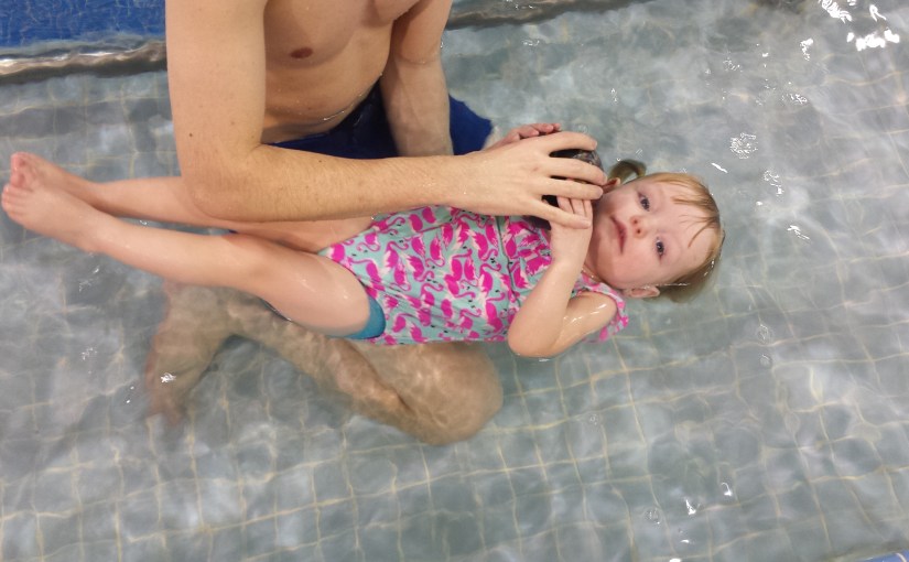 Madison had a great swimming lesson with Ryan tonight. She worked on walking up and down the ramp and pulling herself out of the pool by herself. An important skill they continue to work on is transitioning from a back float to an upright position to try and get her feet on the ground to hold onto the side. She is learning to tuck her chin into her chest and engaging her stomach muscles to pull herself upright in the water. Ryan uses a ball that Madison reaches forward for to try and pull herself forward. Her lesson ended with lots of laughs as she threw a ball many times at Ryans head.