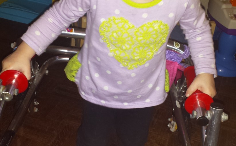 Madison has been a speed demon latly in her walker…so much so that her wheels have worn down to having no grip. She has been sliding forwards, backwards and everywhere. Daddy purchased some “sure tread” from the hardware store and lined her back wheels with it. She now has some good grip and is back speeding down the halls.
