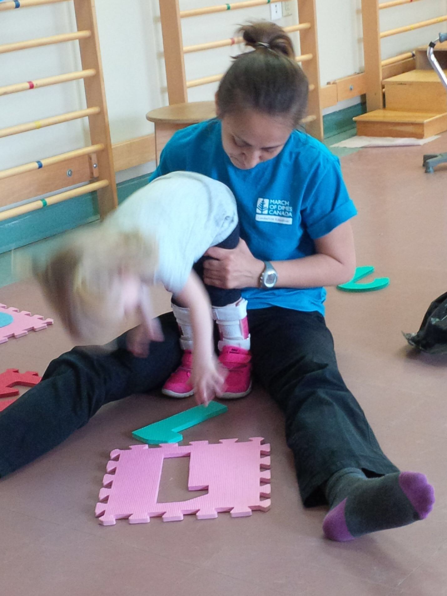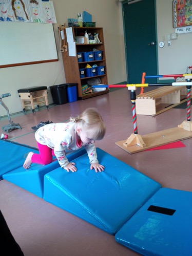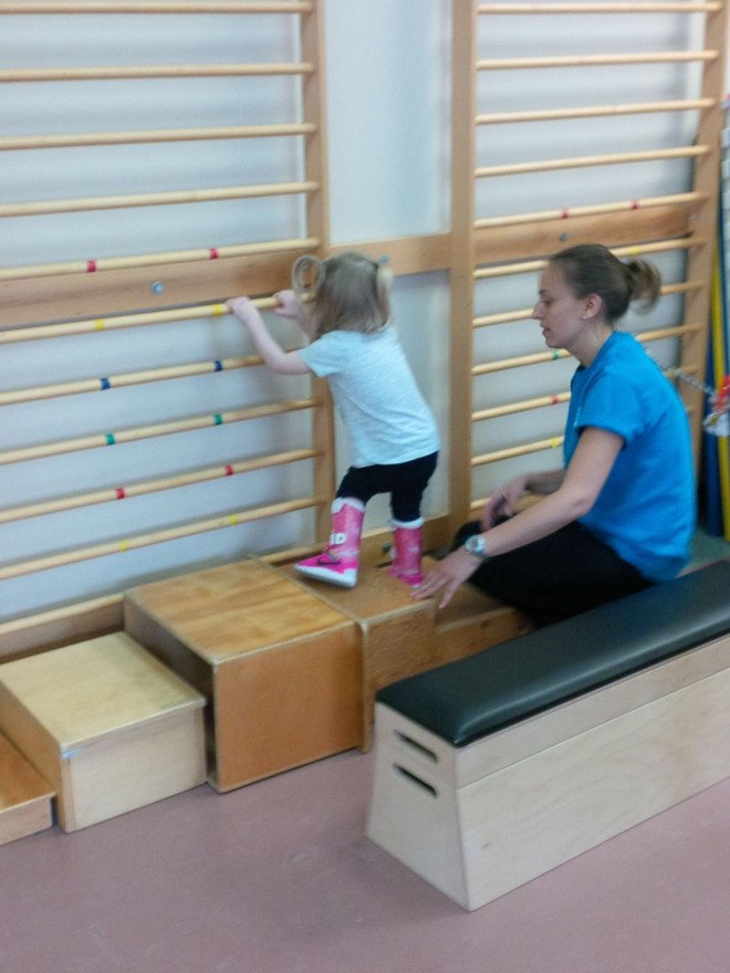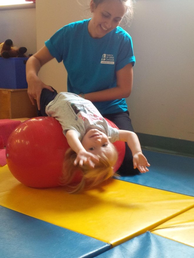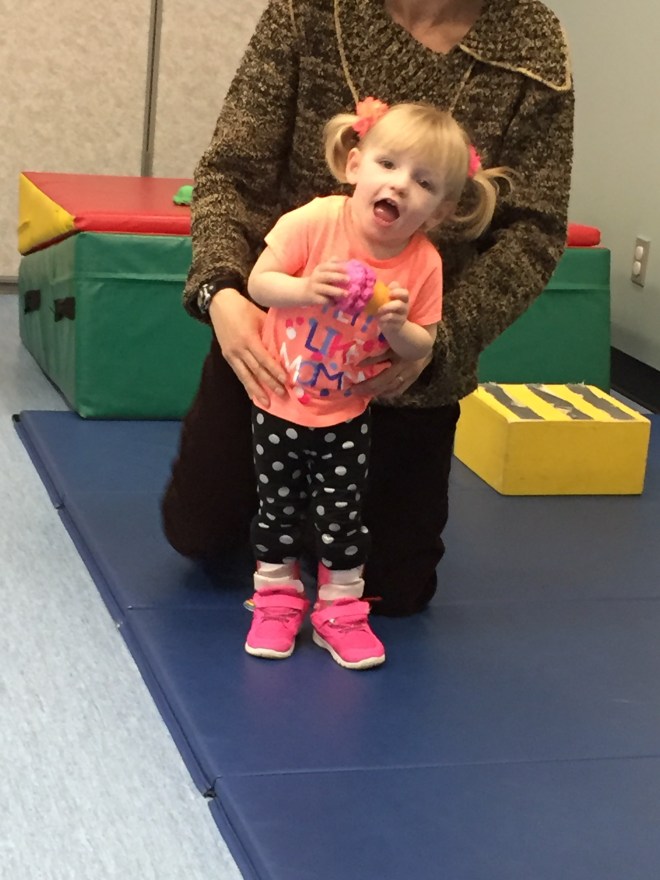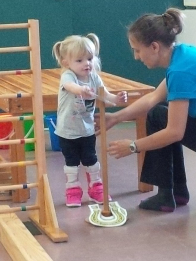 Madison then went to see Monika at March of Dimes. She stretched on a ball, did different activities like horse shoes while standing, practiced walking with her canes and also walking up and down stairs.