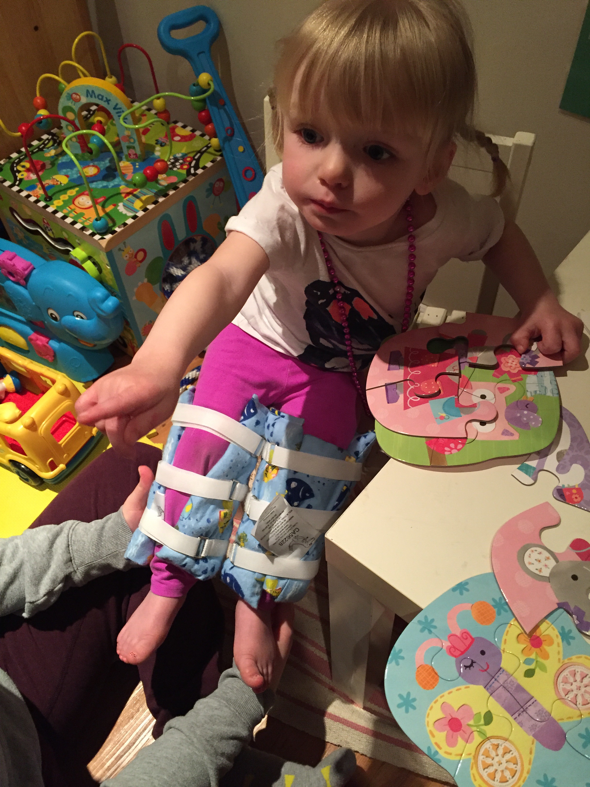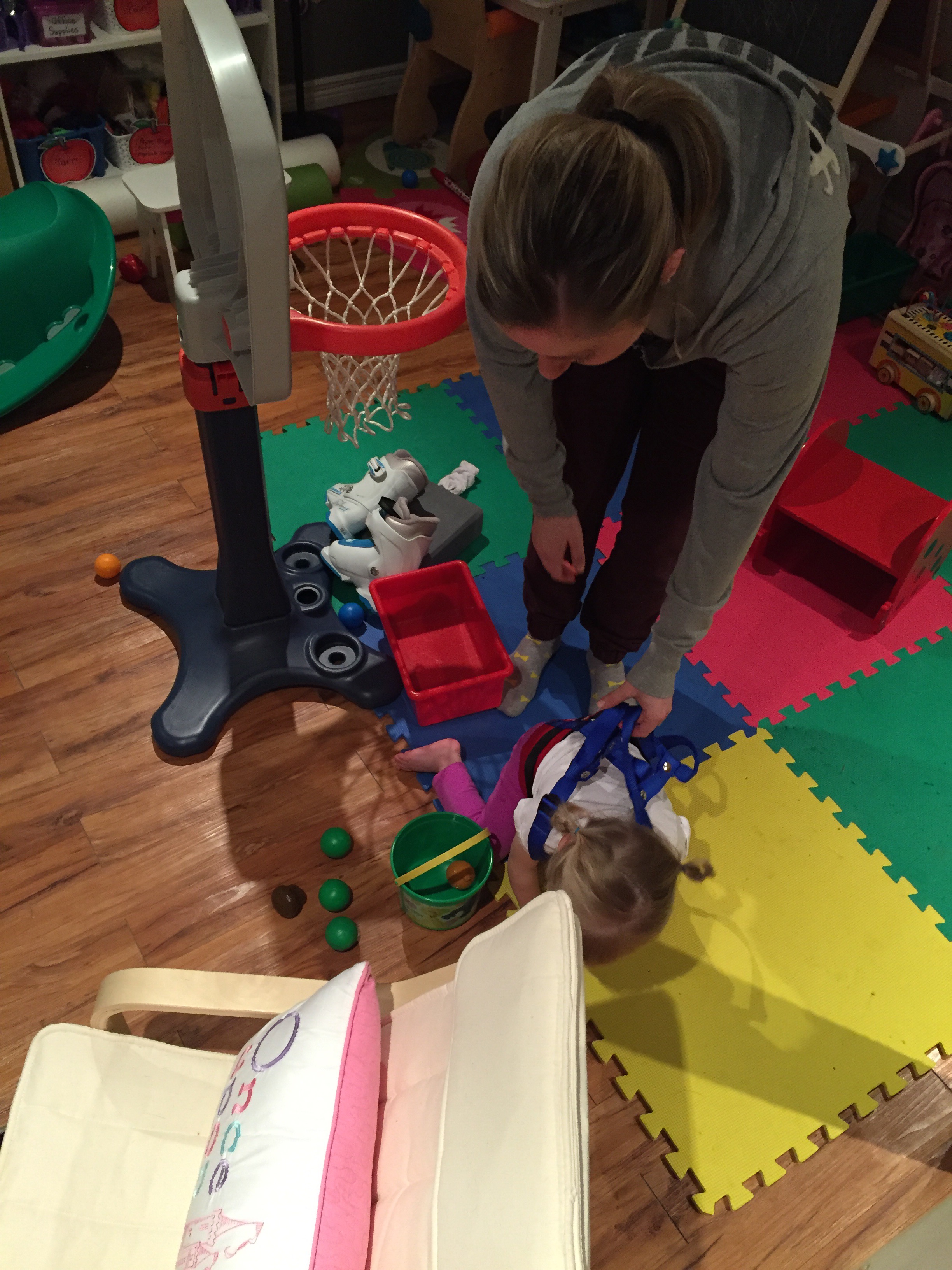 With Botox scheduled and it being just over 2 weeks away, Madison is trying to get in the routine of stretching at least three times a day. Mommy and Daddy have spoken to her a lot about the importance of stretching so she has been heard several times saying “guys I’m stretching” or “I’m going to stretching now”. When Daddy got home from work tonight Madison was with Emily in the basement. She heard Daddy and yelled up the stairs “Dadda I’m stretching!” Madison did a great job with Emily. They walked in her harness and used her gators to stretch out the back of her knees. She collected balls from all over the room to practice walking and squating while picking them up. Its an excellent activity for Madison to walk and try and do different things using her hands instead of having to use her hands to hold onto something. Madison also practiced sitting on the foam roller. All during her bath and at bedtime she talked about Emily and having fun in the basement – thanks Emily!!
