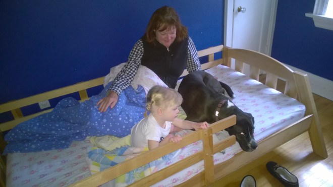 Madison had a great afternoon with Grandma, Grandpa and Stanley. Her big girl bed was repositioned so that she can climb in and out of it independently. She practiced going in and out while Stanley supervised.