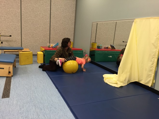 Madison worked really hard with Kate at Grandview this afternoon. She tried sitting on a ball for the first time by herself. She tried doing little bounces while her feet were flat on the floor and legs at 90 degrees. She also rolled out on her back on the ball and on her tummy too. It was a great workout!