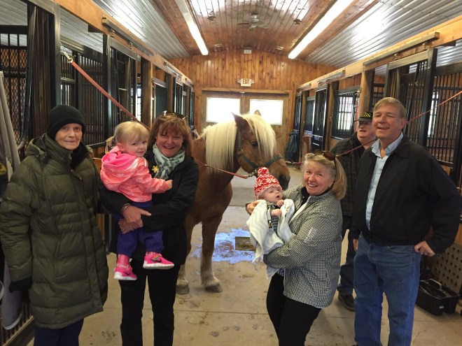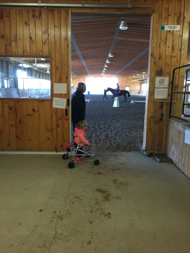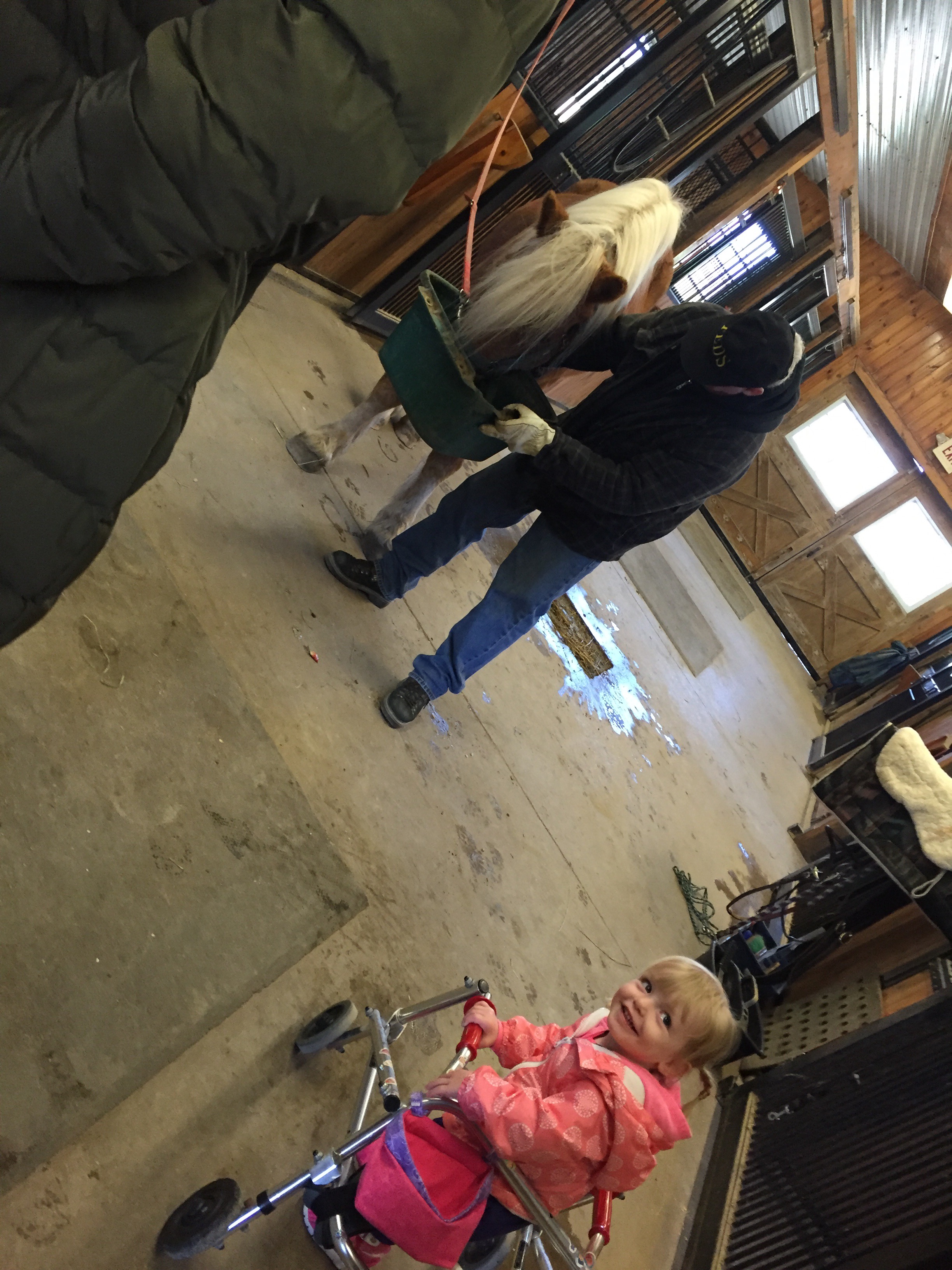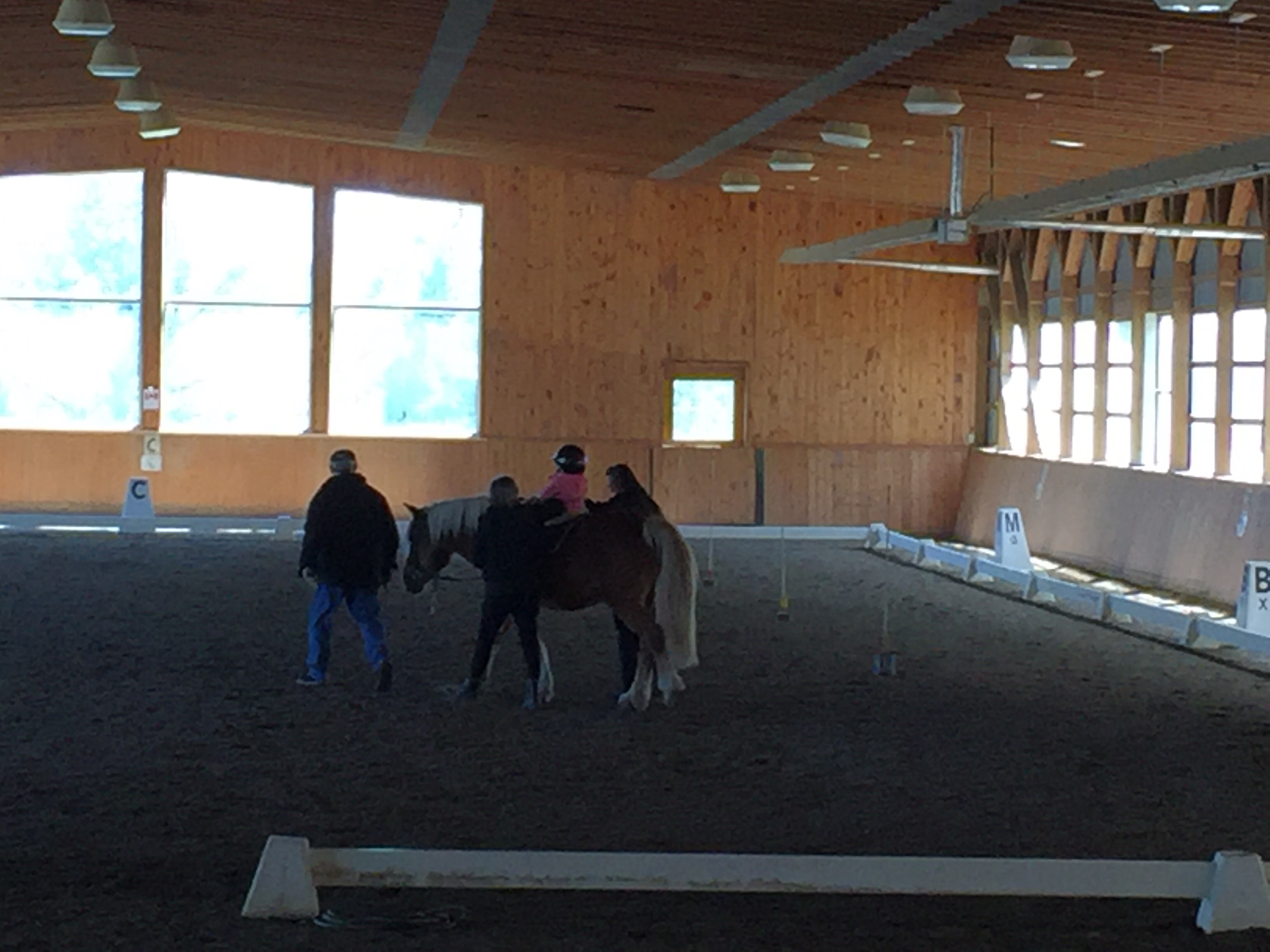 Madison had a great ride with Joe today. It was cold outside so they stayed in the indoor ring. She worked on telling him to stop and go. She also lied down on him and sat up several times to work on her core and her trust and confidence in him. Madison also had a big cheering section today – thanks to everyone who made the drive to watch Madison and her buddy Joe! She was tired today and needed more support then usual to stay upright but she got a great inner thigh stretch.