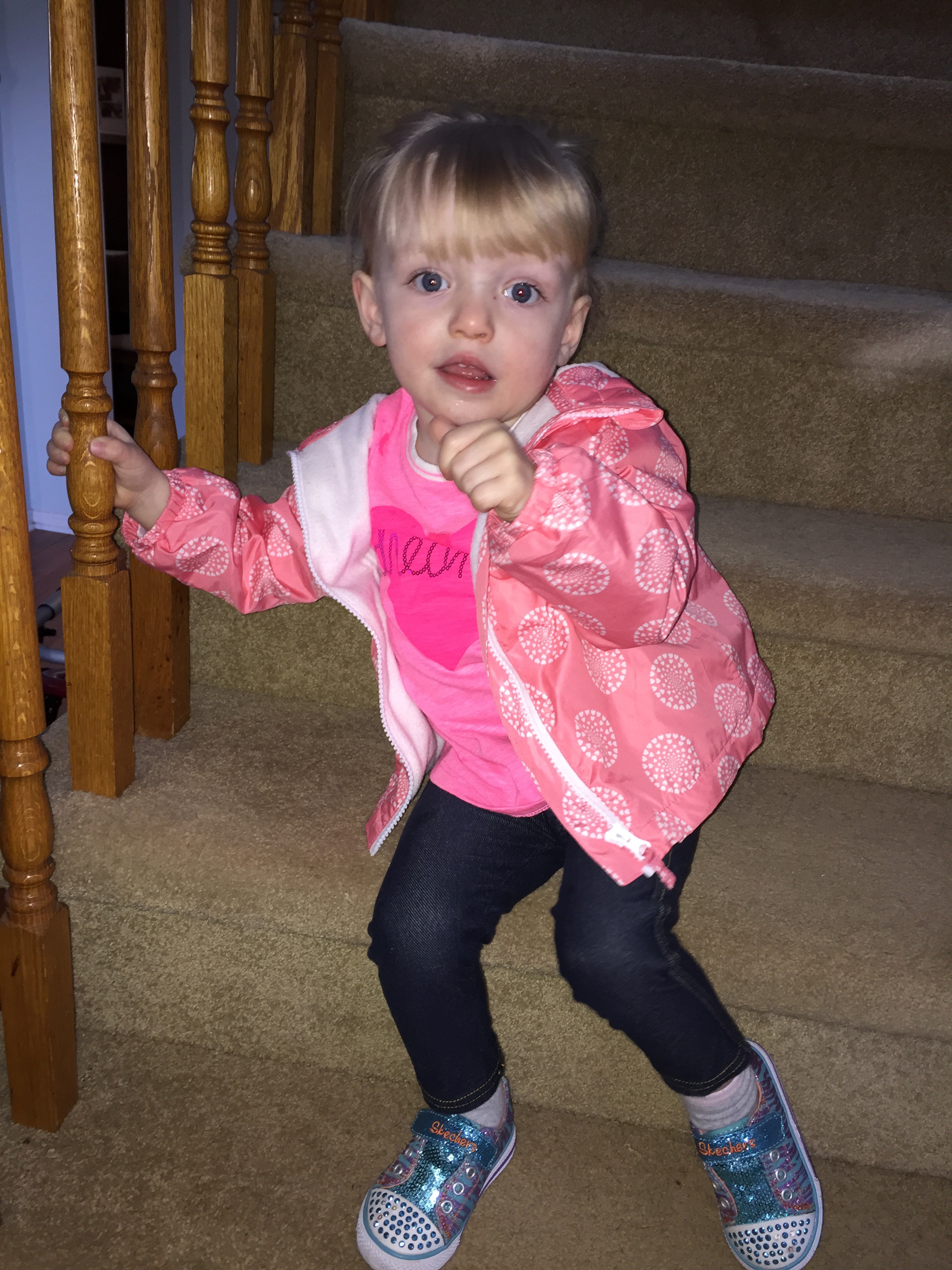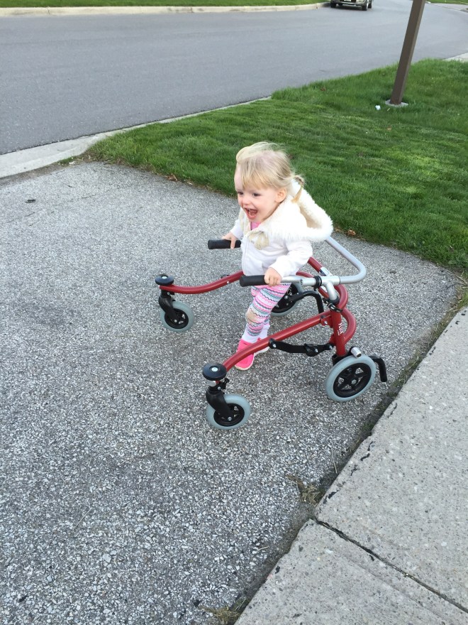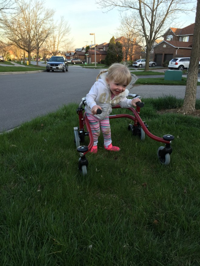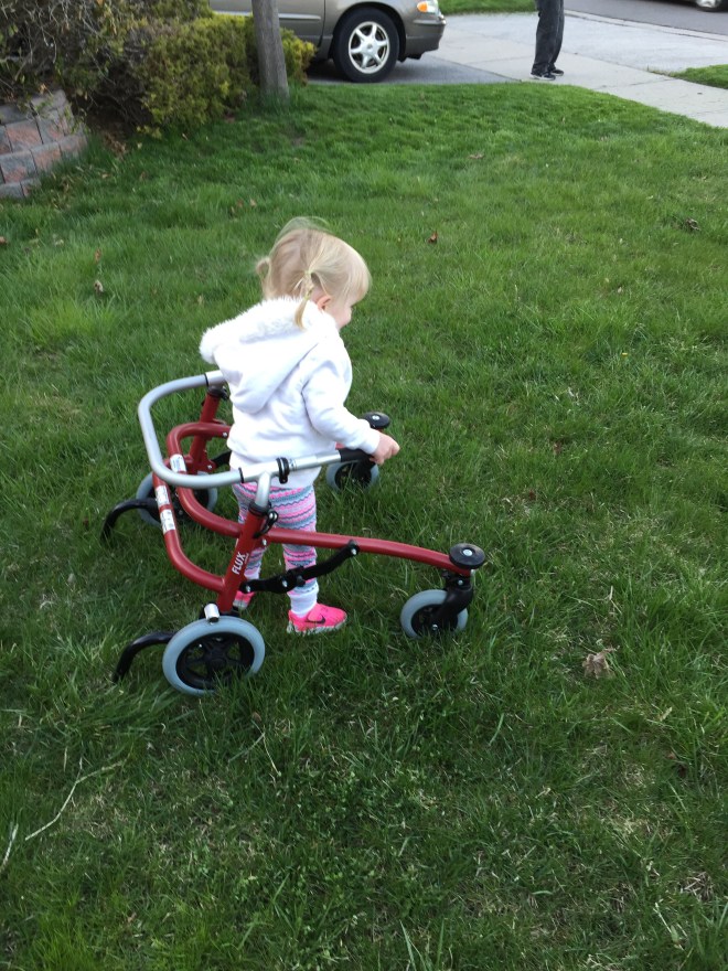 Madison has become extremely comfortable with her little silver walker. Her larger walker with swivel wheels was modified a few weeks ago to provide less support for her as was originally needed. It has been sitting in the dinning room and only used a few times as Madison is more interested in the silver walker. Tonight as Mommy was cooking dinner Madison was playing and exploring with the bigger walker. She started yelling “Mommy I want to go fast!” And then started trying to run with it around the house. After dinner she wanted to try it outside. Madison zoomed up and down the sidewalk smiling and laughing while she chased Carter. The bigger walker requires similar control as the silver one, but it is much smoother with the swivel wheels which also makes it trickier to steer and control. The highlight of everyone’s day was watching Madison walk on the grass for the first time. She has been on grass with the help of others to walk or sit and play, but at 2.5 years old she had never been on grass by herself walking …and she loved it!!! She was so proud of herself and she didn’t want to stop. With this new discovery and confidence Madison is going to have so many more adventures this spring and summer!
