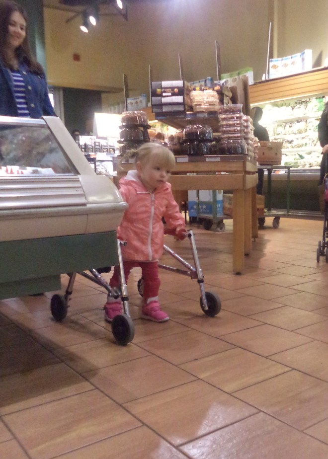 “Madison did an INCREDIBLE job on our grocery store field trip. She managed to walk all the way there, maneuver in the Loblaws independently, and half way back before she tired out. On the way there, we saw a few puppies being walked, heard lots of noisy trucks, and saw the escalators go up and down. She made many people turn heads and everyone that she encountered cheered her on. She was the proudest I’d ever seen her, and she was very excited that we bought lots of goodies to eat upon our return.