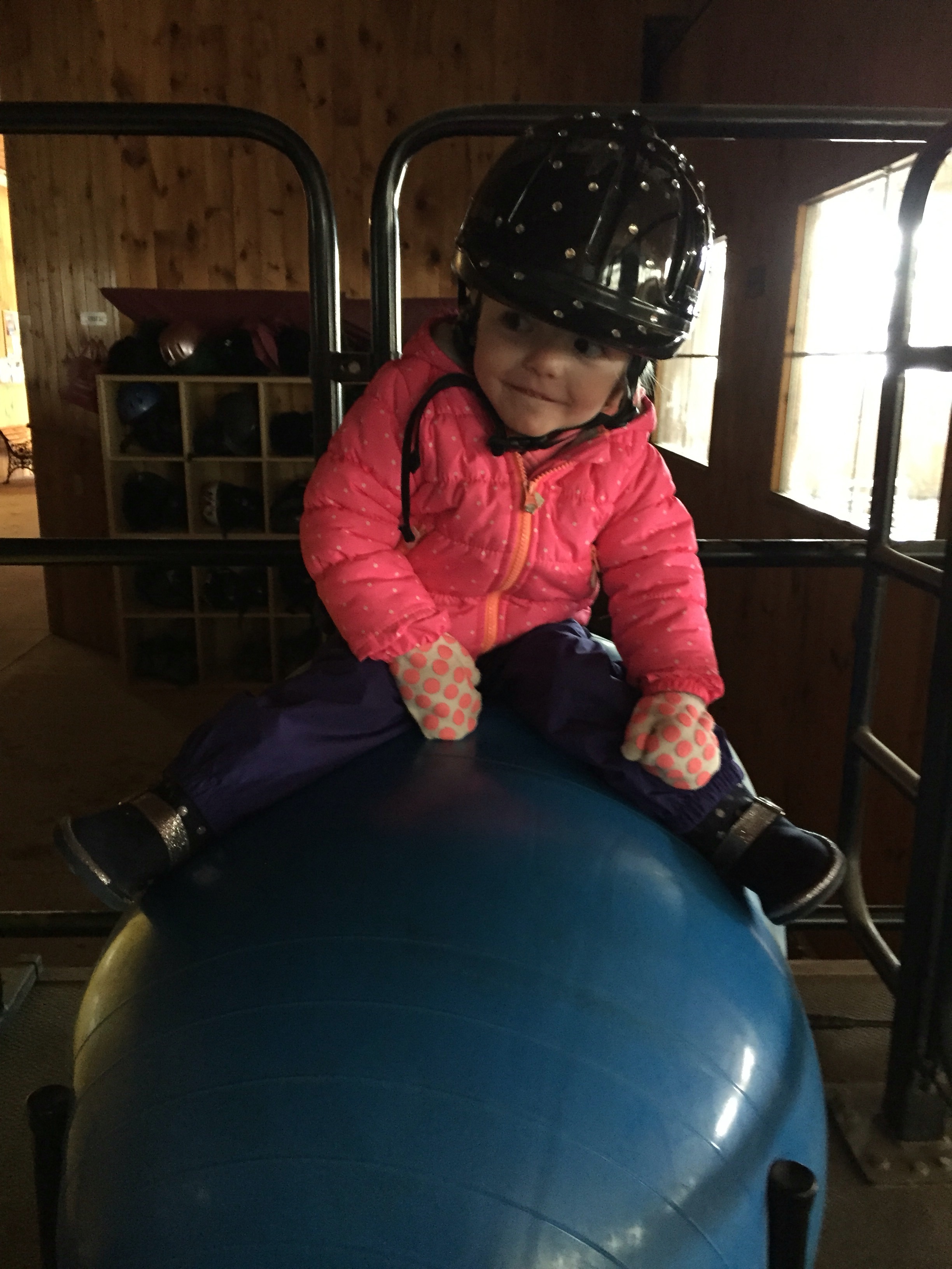 Madison’s routine before starting her work with Joe is to sit on the physio ball to stretch out her legs and then put her helmet on.