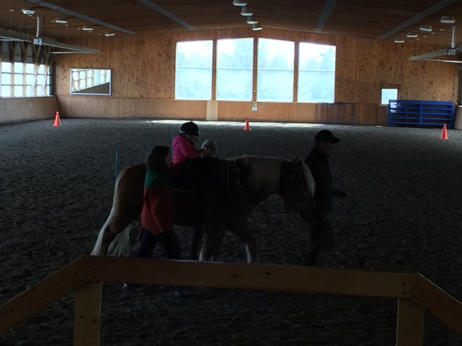 Today they worked on strengthening her core and posture. They had her lying down on Joe to feel him move when on her back and then sit up and turn her upper body side to side. This helped her continue to bond with Joe to build trust, and to do some hard work with her core muscles. She also touched his mane and tail more and talked to him to continue to get comfortable with him.