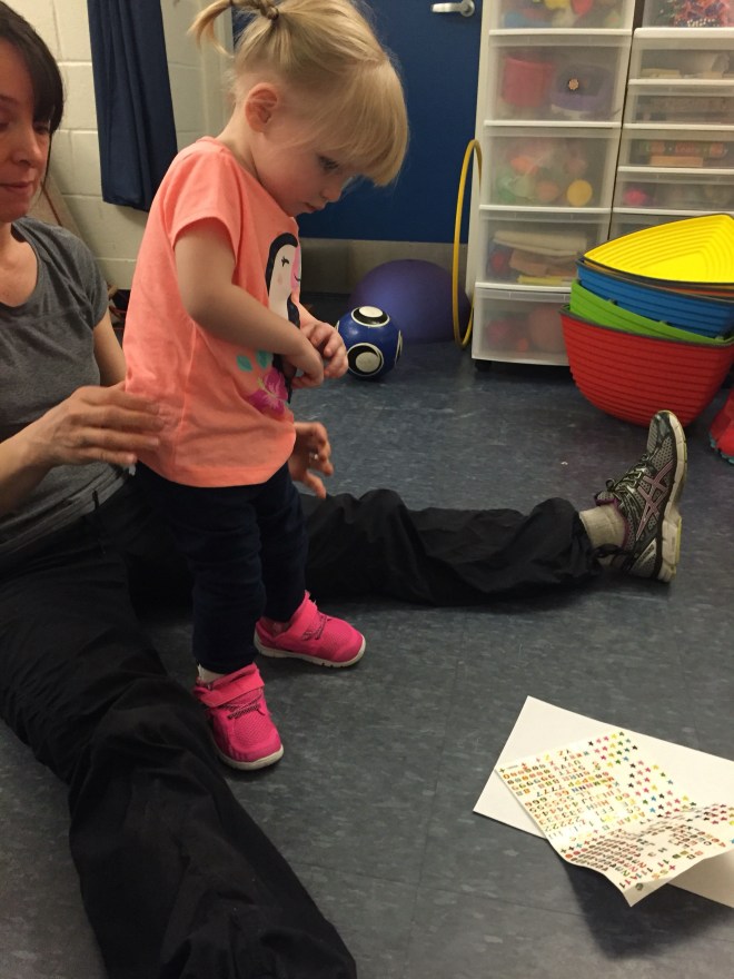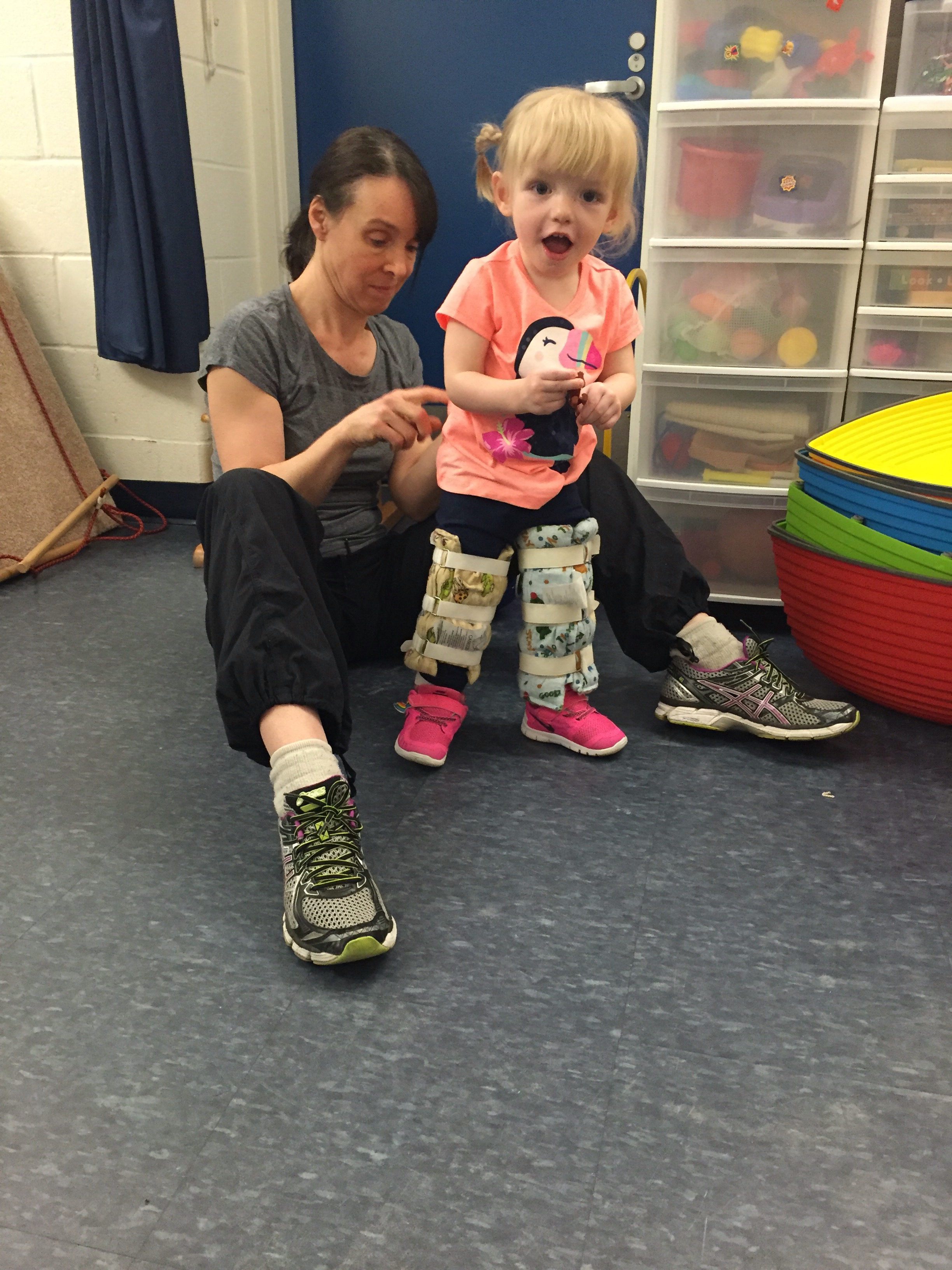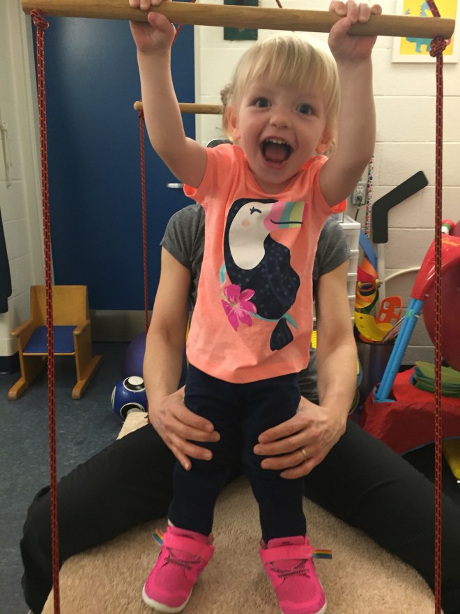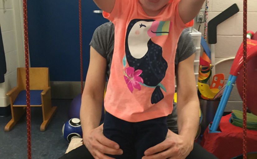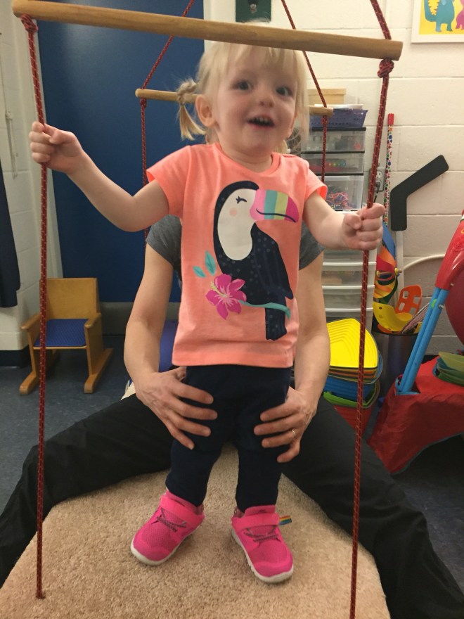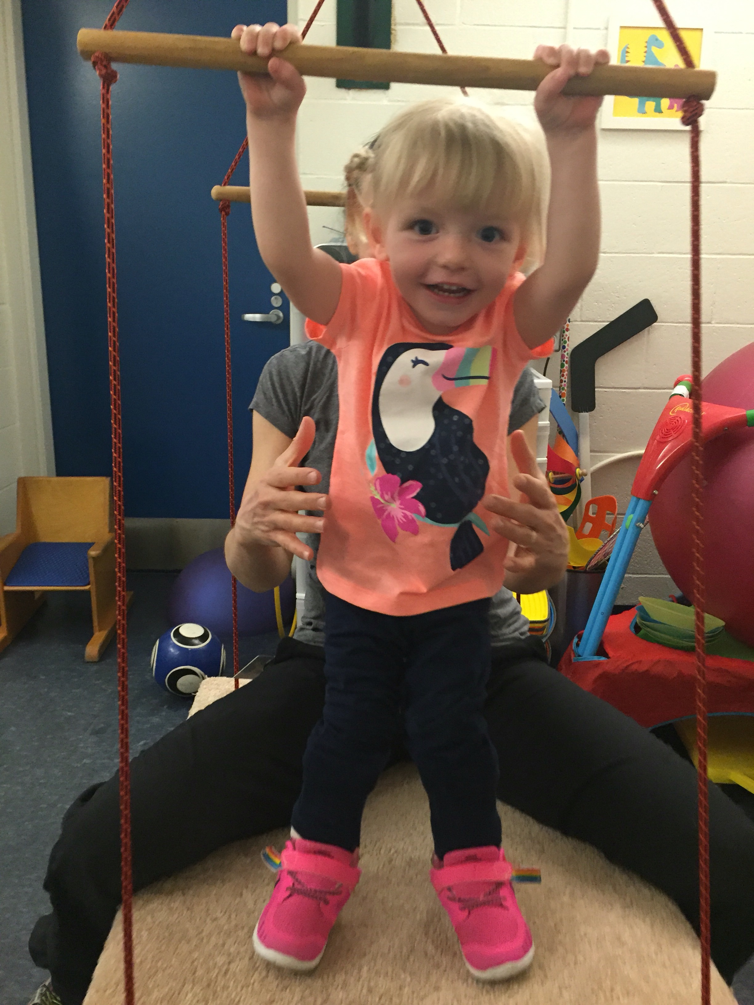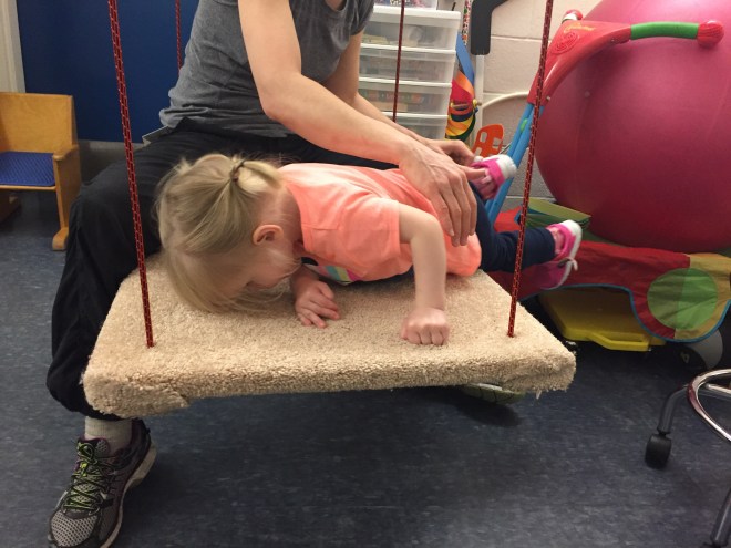 Madison did a fantastic job with Stephanie today. She loved balancing on the swing and trying to make it move all by herself. They practiced lots of walking with a stick, walking with some leg gators on and walking on the treadmill. Madison walked 30 steps holding the bar on the treadmill without Stephanie holding her! She worked so hard that she fell asleep as soon as she was in the car.