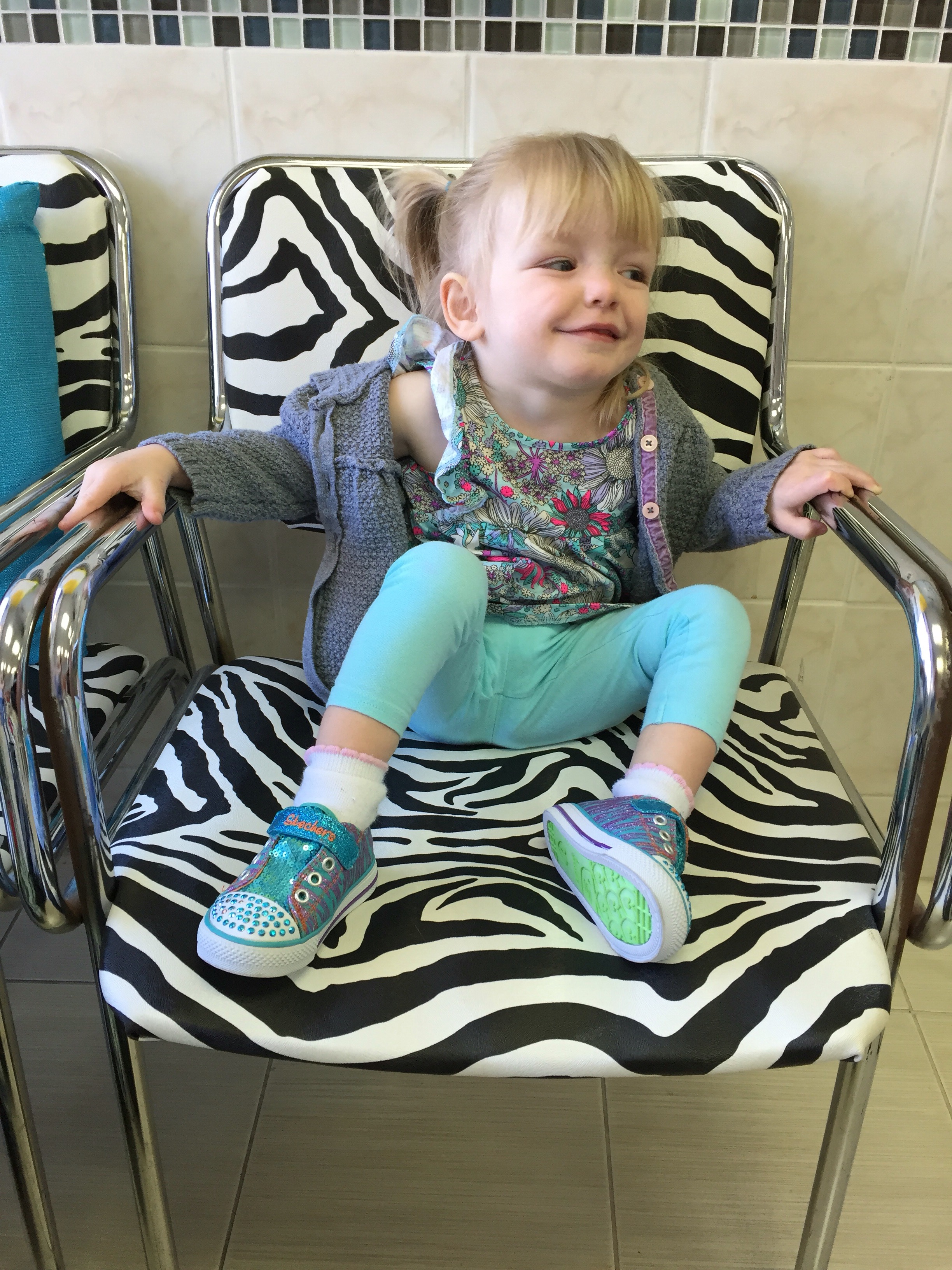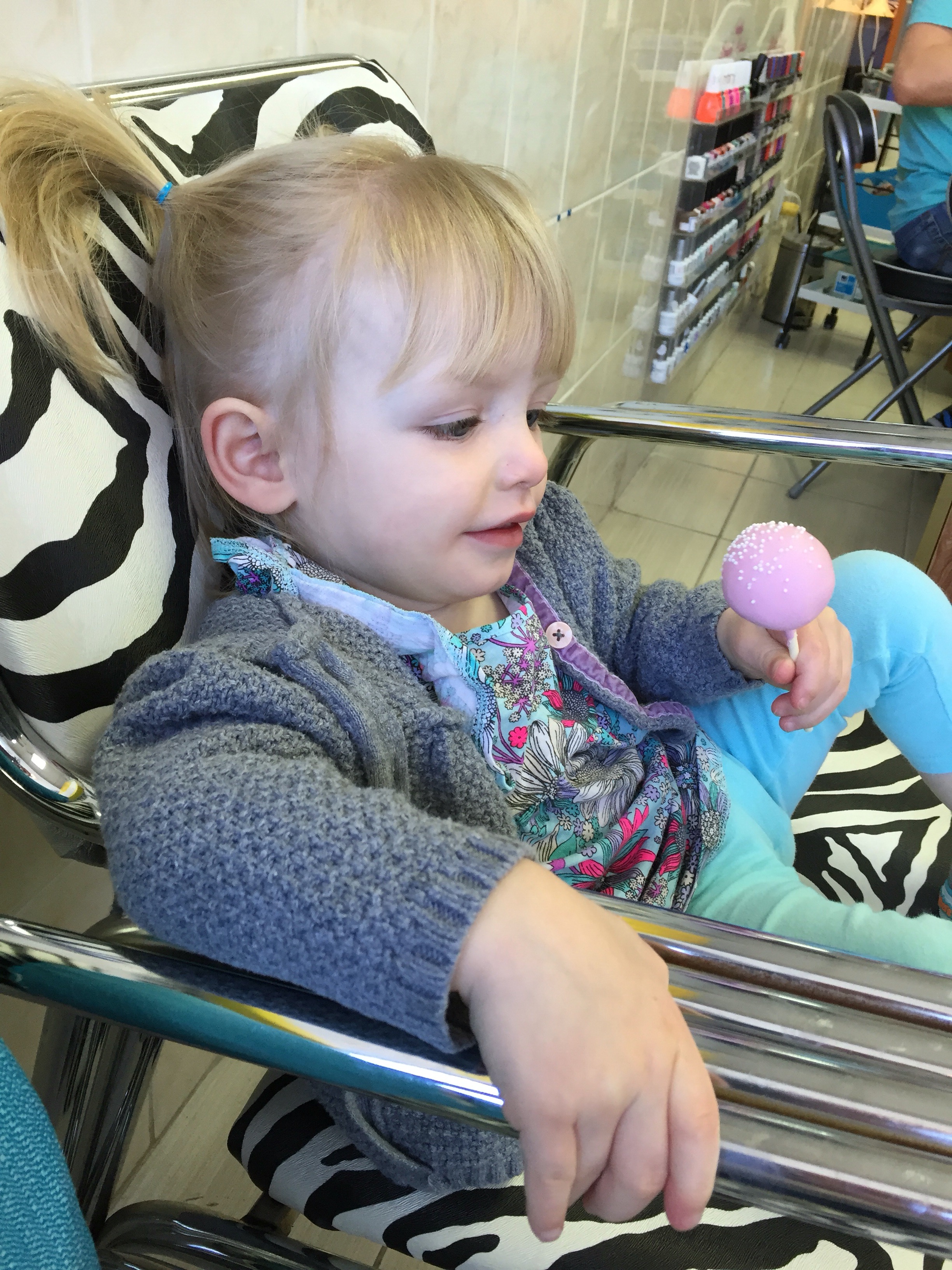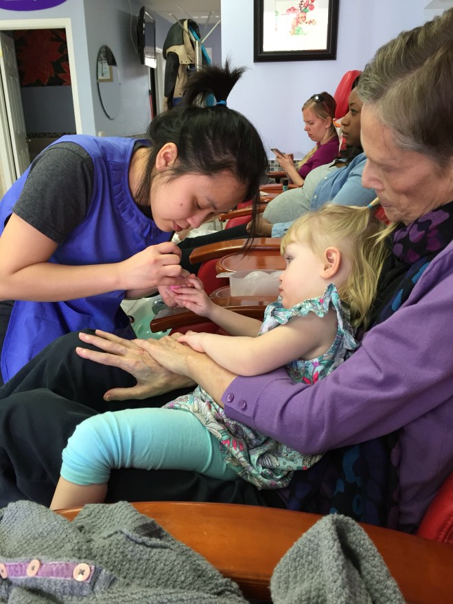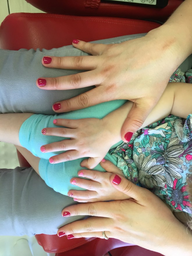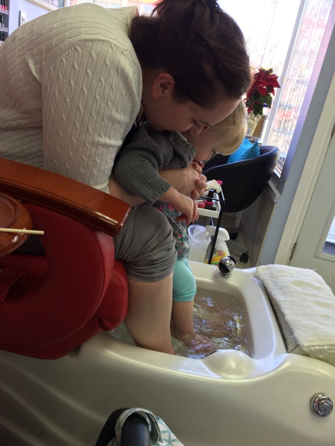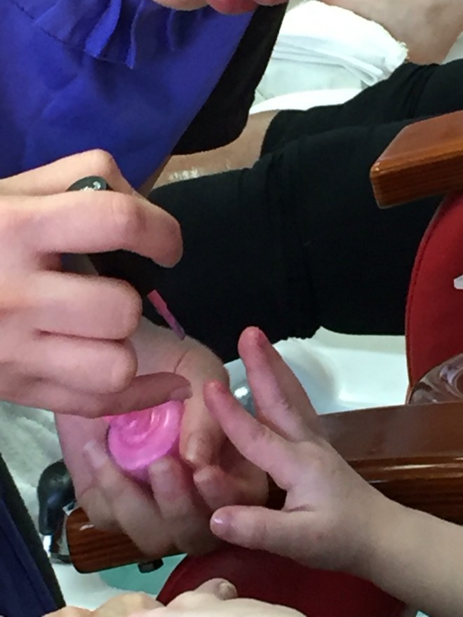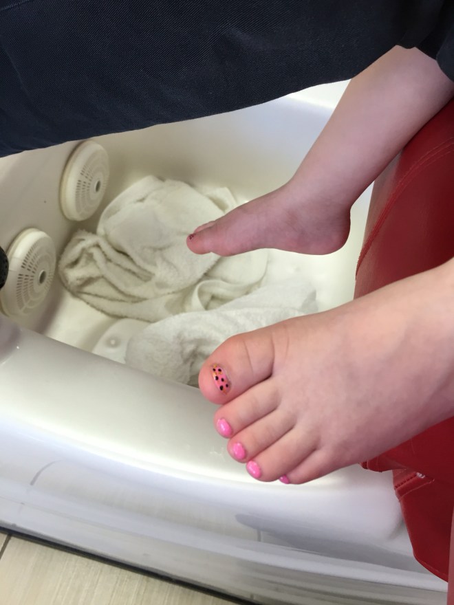 Madison was super excited to get her first manicure and pedicure. She of course picked pink. She watched Aunt Nadia and Nana have their feet cleaned and polished and then it was her turn. Mommy was happy Madison was able to have her nails trimmed as it has become a more difficult task at home with her toe nails starting to crack from the way She walks on her toes sometimes.