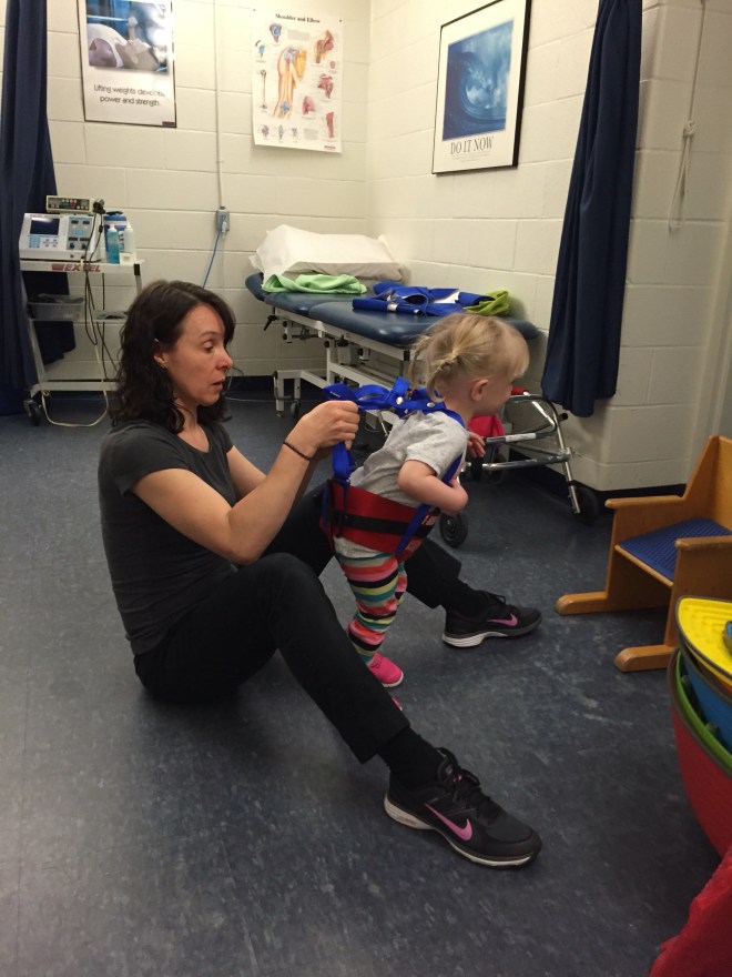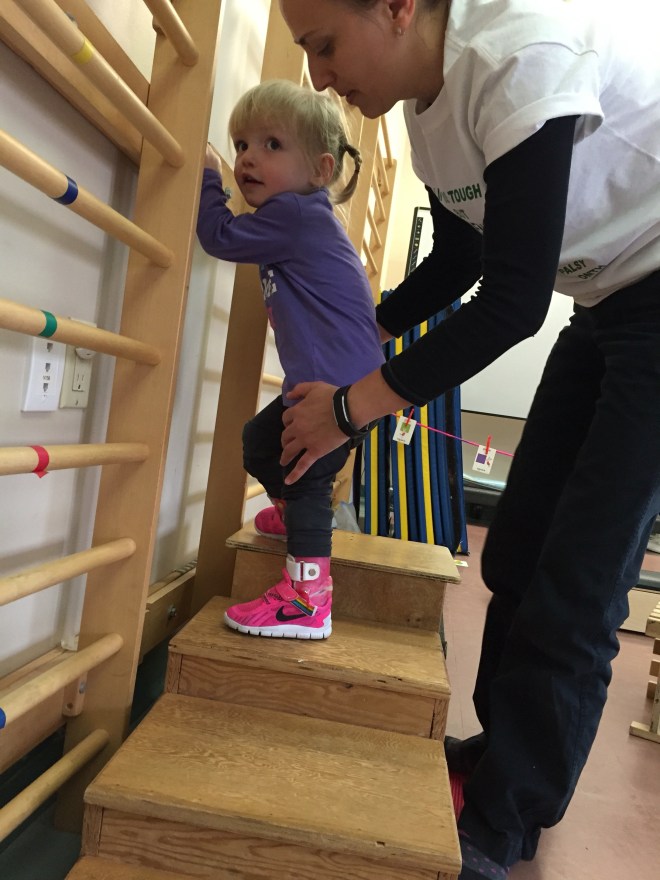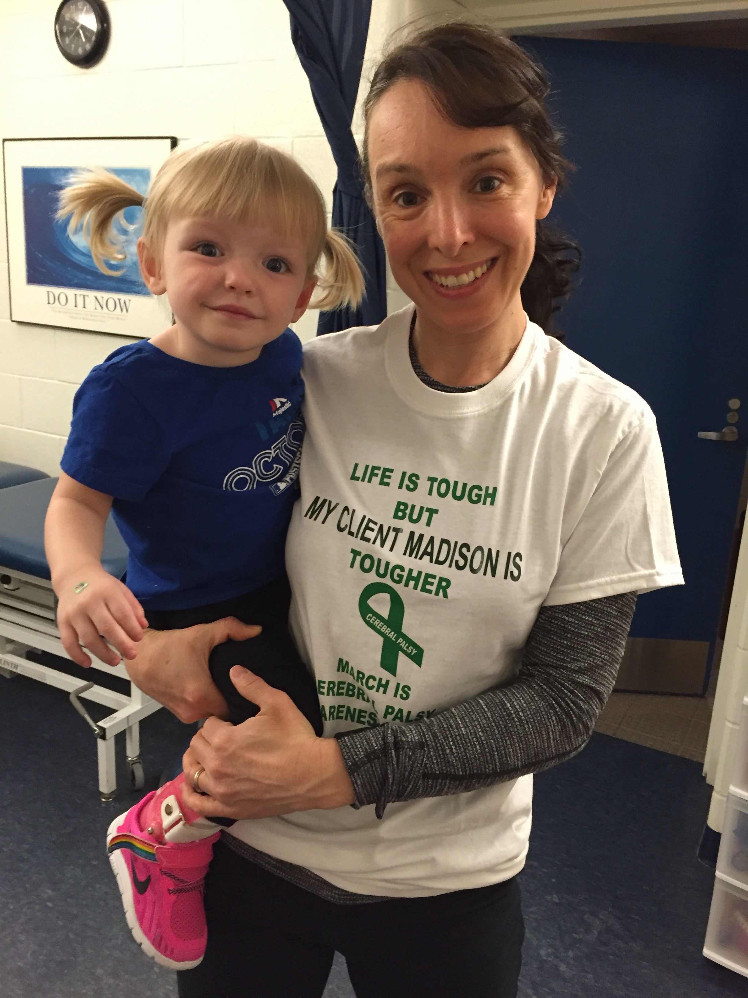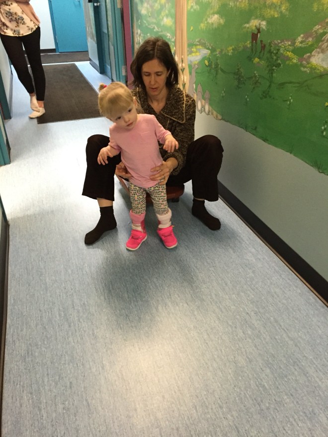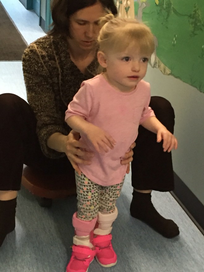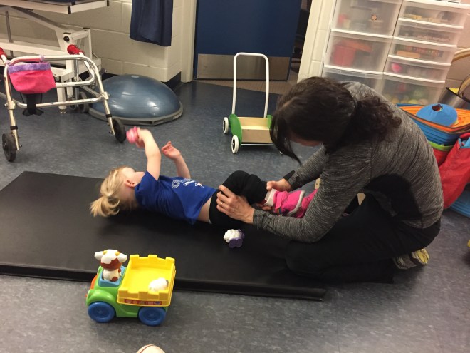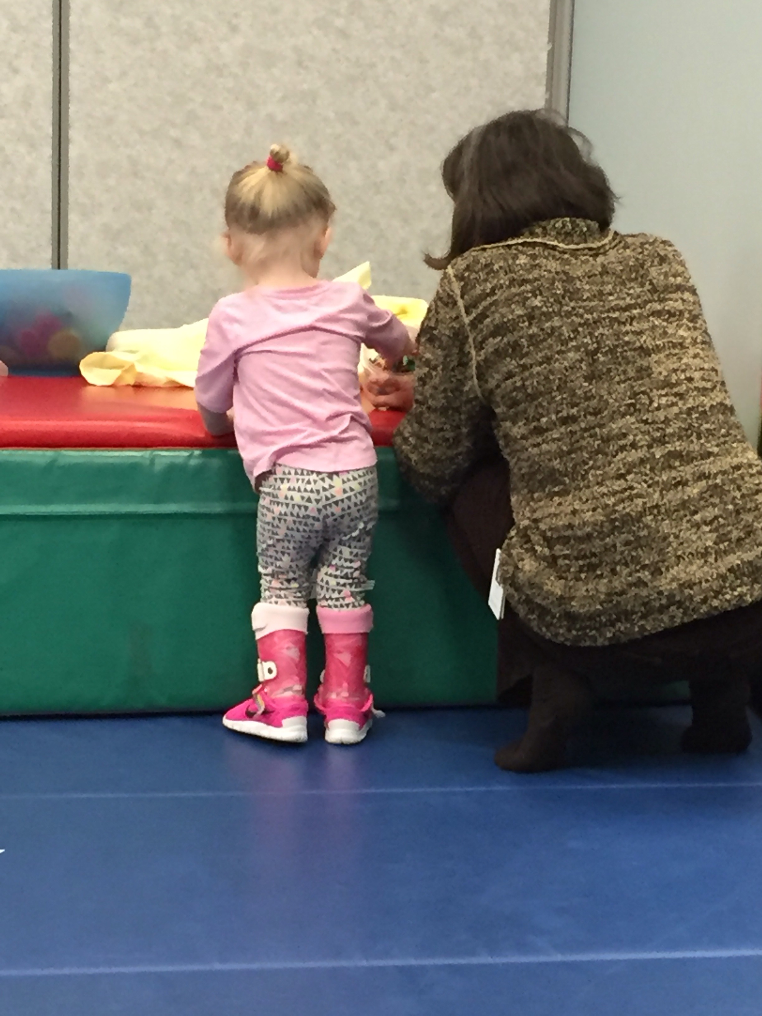 Madison has been under the weather, but gave it her best go at Grandview today to help set new goals. With a new block started for the next 8-10 weeks Madison will be focused on the following with Kate: to assist with independence in potty training they will work on moving from a crawling position to squating to standing next to the potty followed by turning while standing and then squaring to sit down on the potty. They will also work on lifting high knees to climb and pull up to help her better get into her own bed herself. An ongoing goal will be independent standing as well as walking. It was also decided that she will be receiving her second round of Botox in a few weeks – her first round that happened in December has now worn off and she is in need of a new set of injections that will be in the same muscle groups as before – her hamstrings and calf muscles.