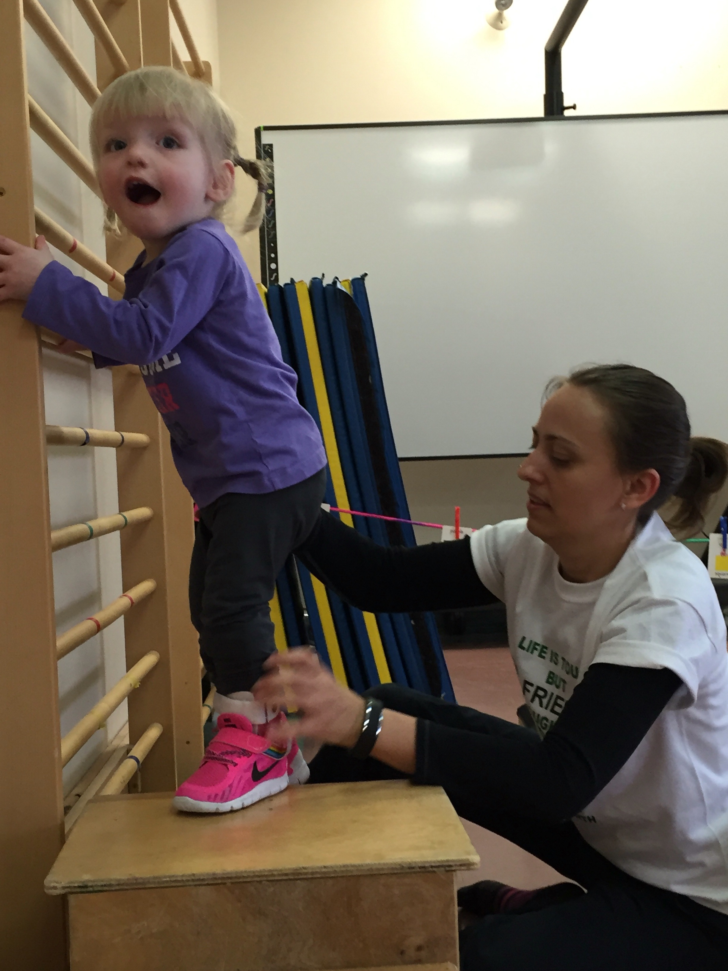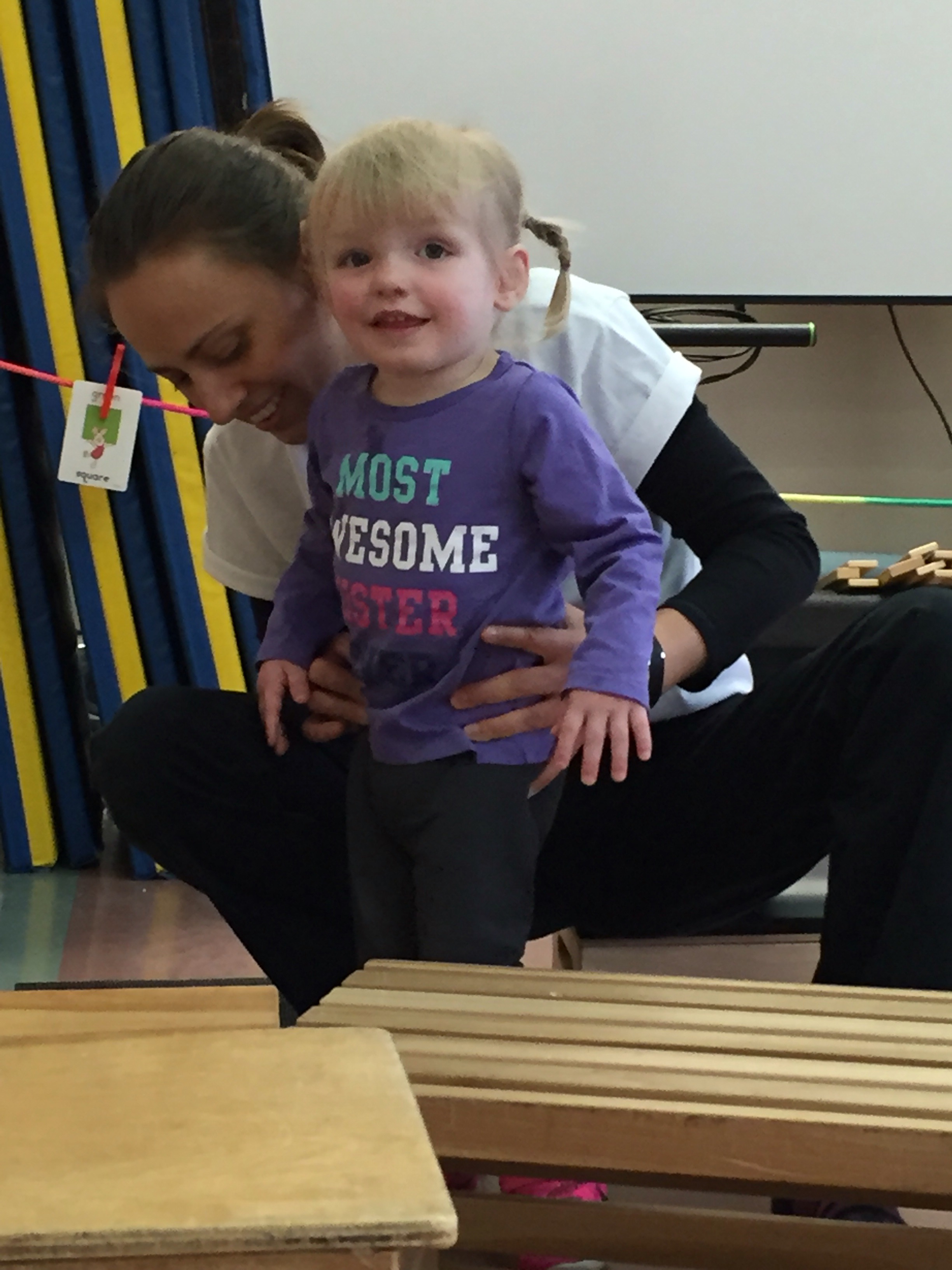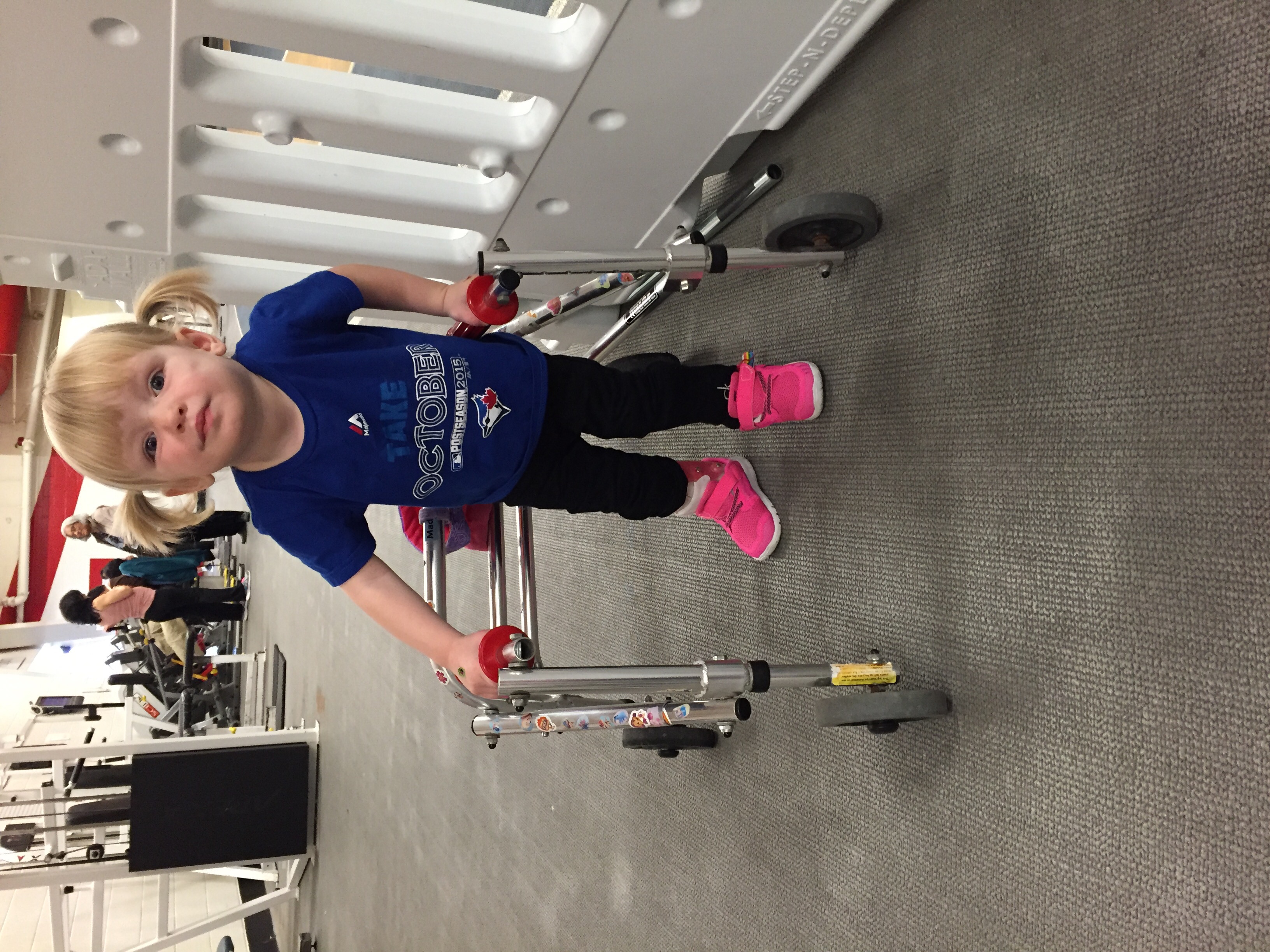 Madison had a very long week of not feeling well, but other then swimming – she made it through all her therapies with success. After lunch and a nap with Nana, she spent some time with Stephanie at Variety Village. She had some “moments” that any typical two year old would have on a Friday afternoon, but her hard work and determination outweighed those. Mommy and Stephanie were very proud of her. They worked today on all different kinds of walking. She walked in and out of her session with her walker, they walked with a harness, walked with bands around her hips, and walked with some help from Stephanie and her scooter. It was a great way to end the week!