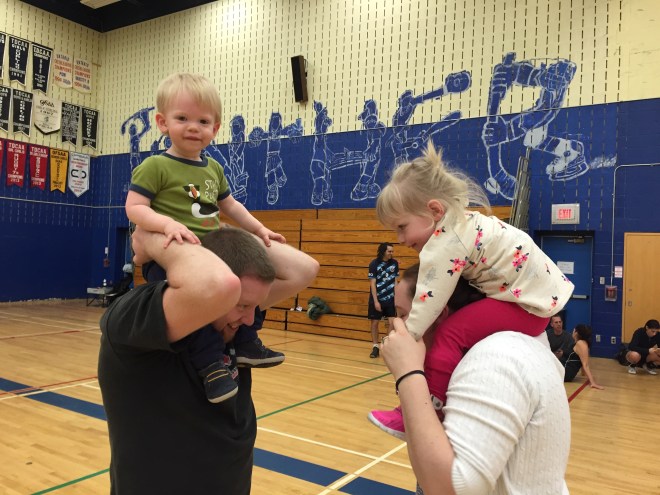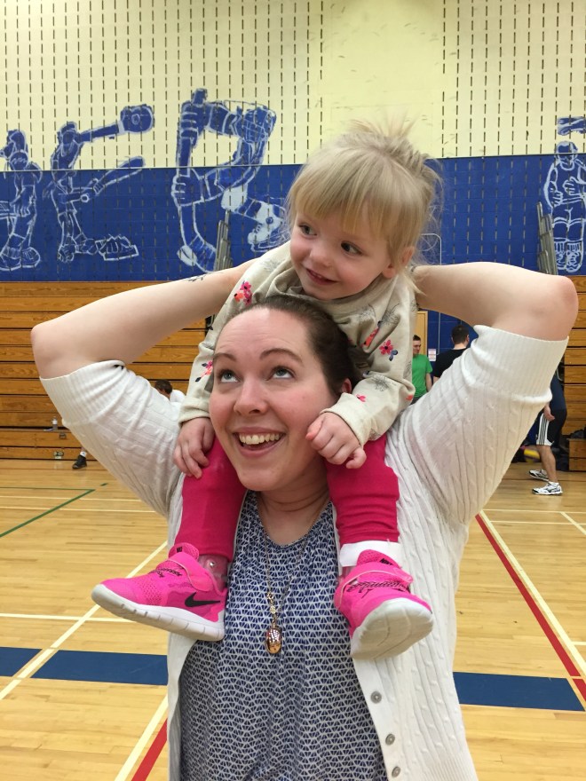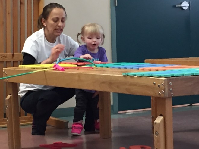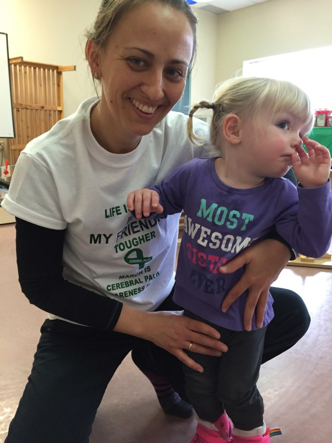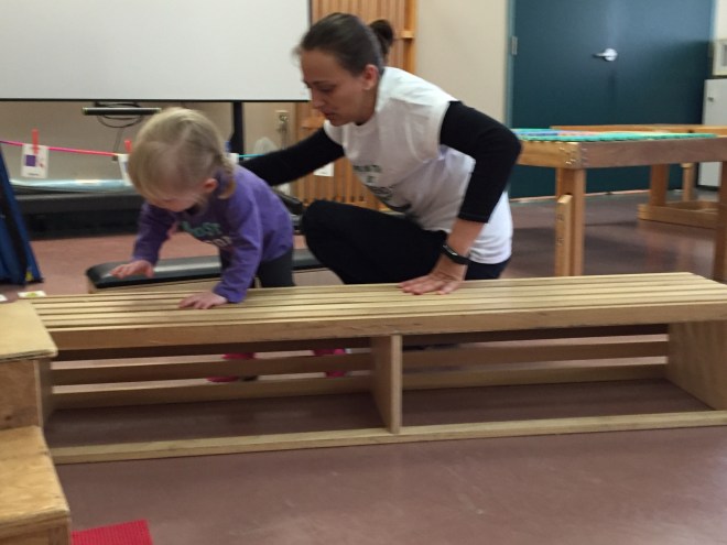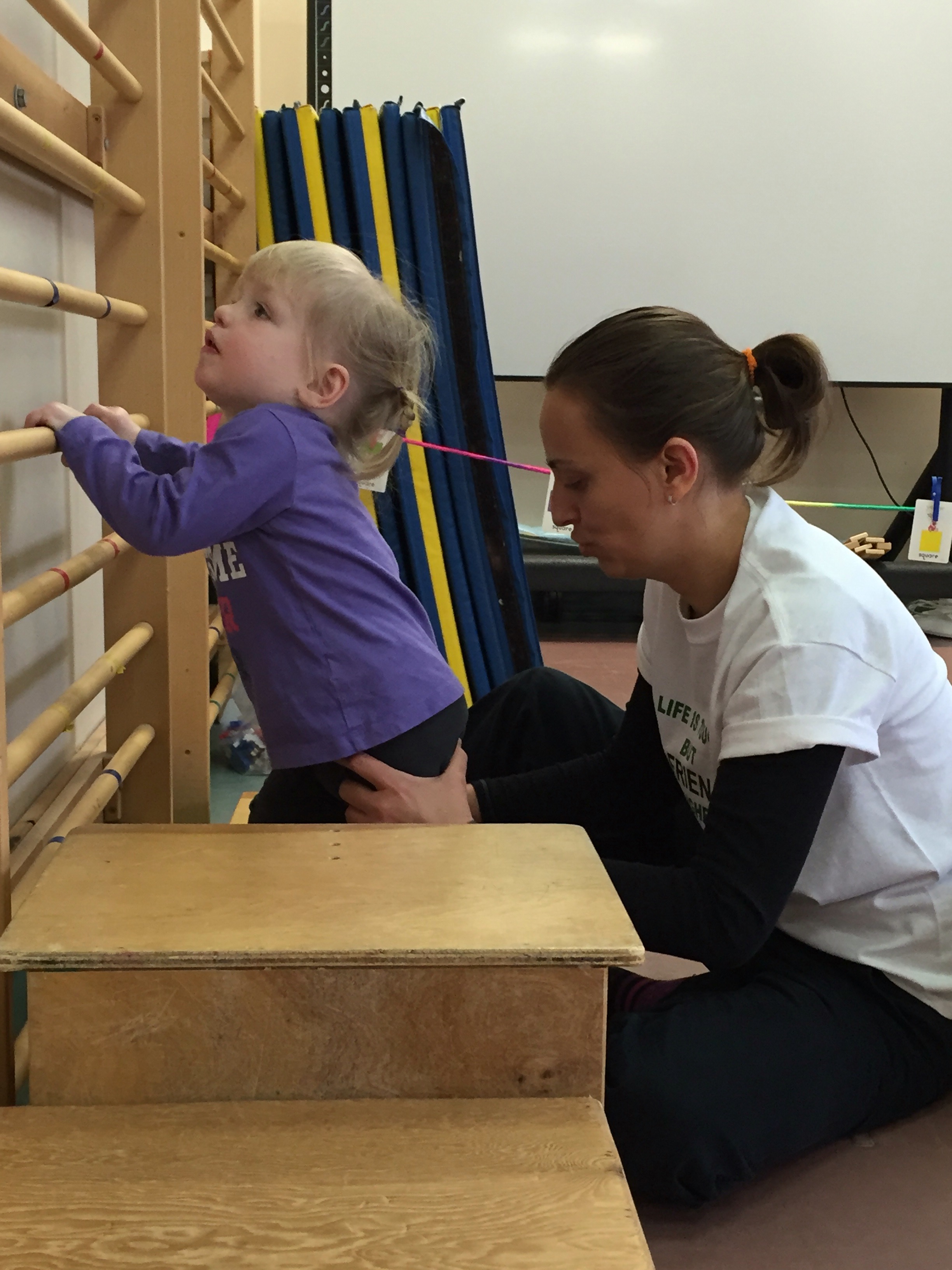 Madison had a very long week of not feeling well, but other then swimming – she made it through all her therapies with success. After lunch and a nap with Nana, she spent some time with Stephanie at Variety Village. She had some “moments” that any typical two year old would have on a Friday afternoon, but her hard work and determination outweighed those. Mommy and Stephanie were very proud of her. They worked today on all different kinds of walking. She walked in and out of her session with her walker, they walked with a harness, walked with bands around her hips, and walked with some help from Stephanie and her scooter. It was a great way to end the week!