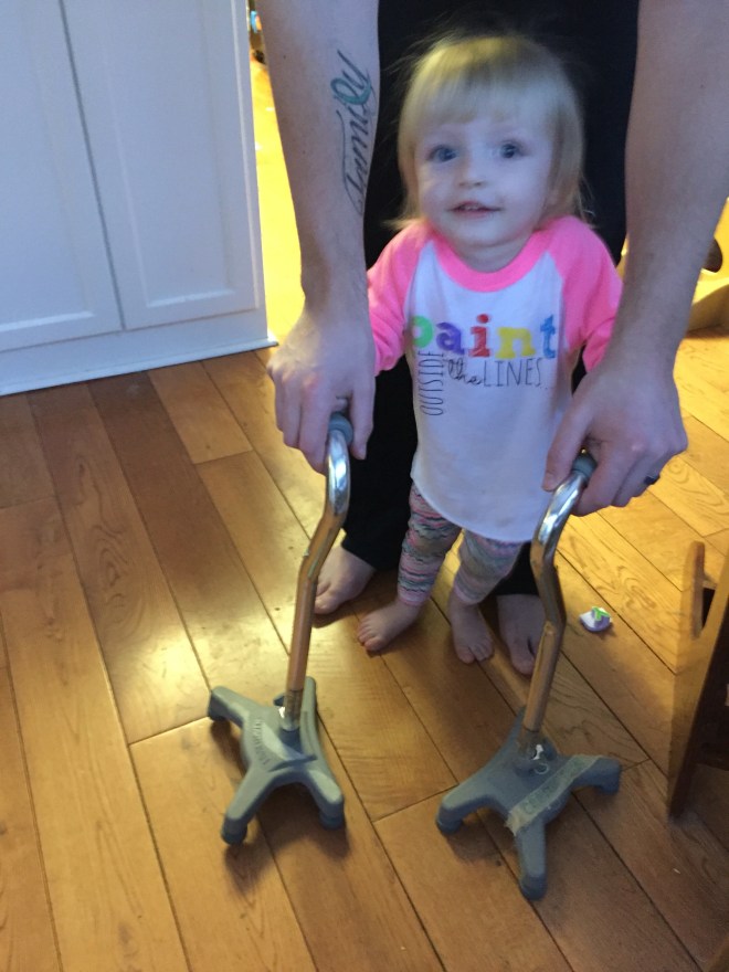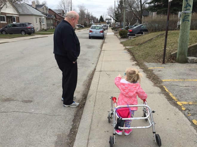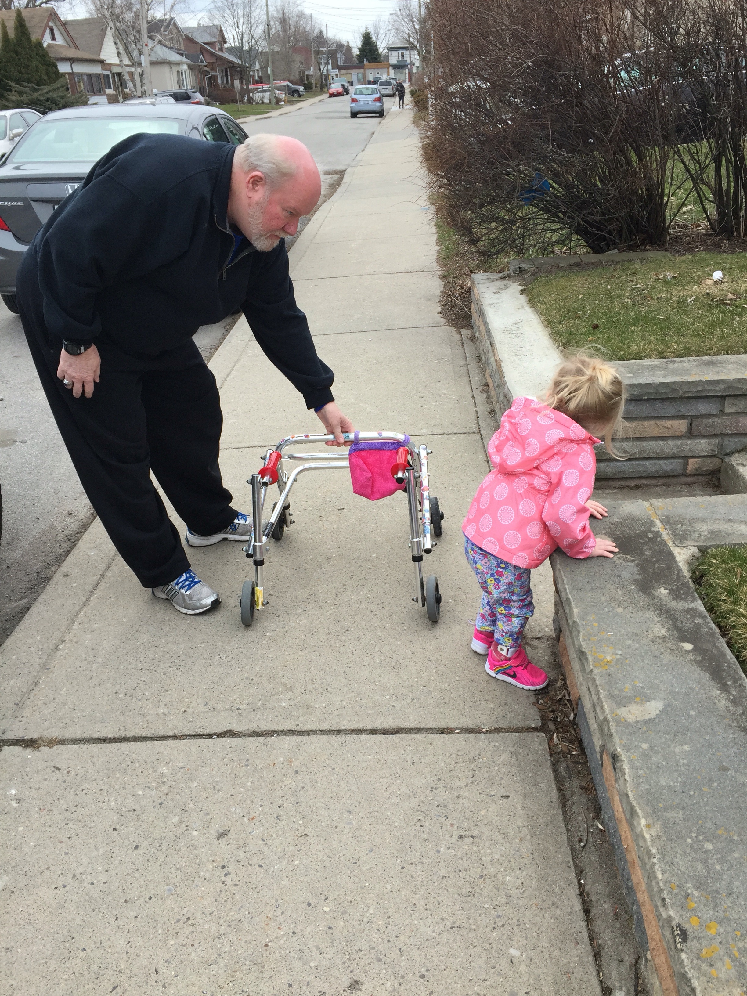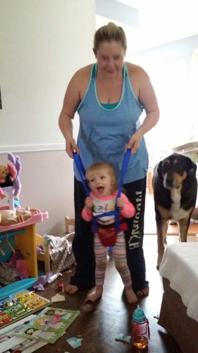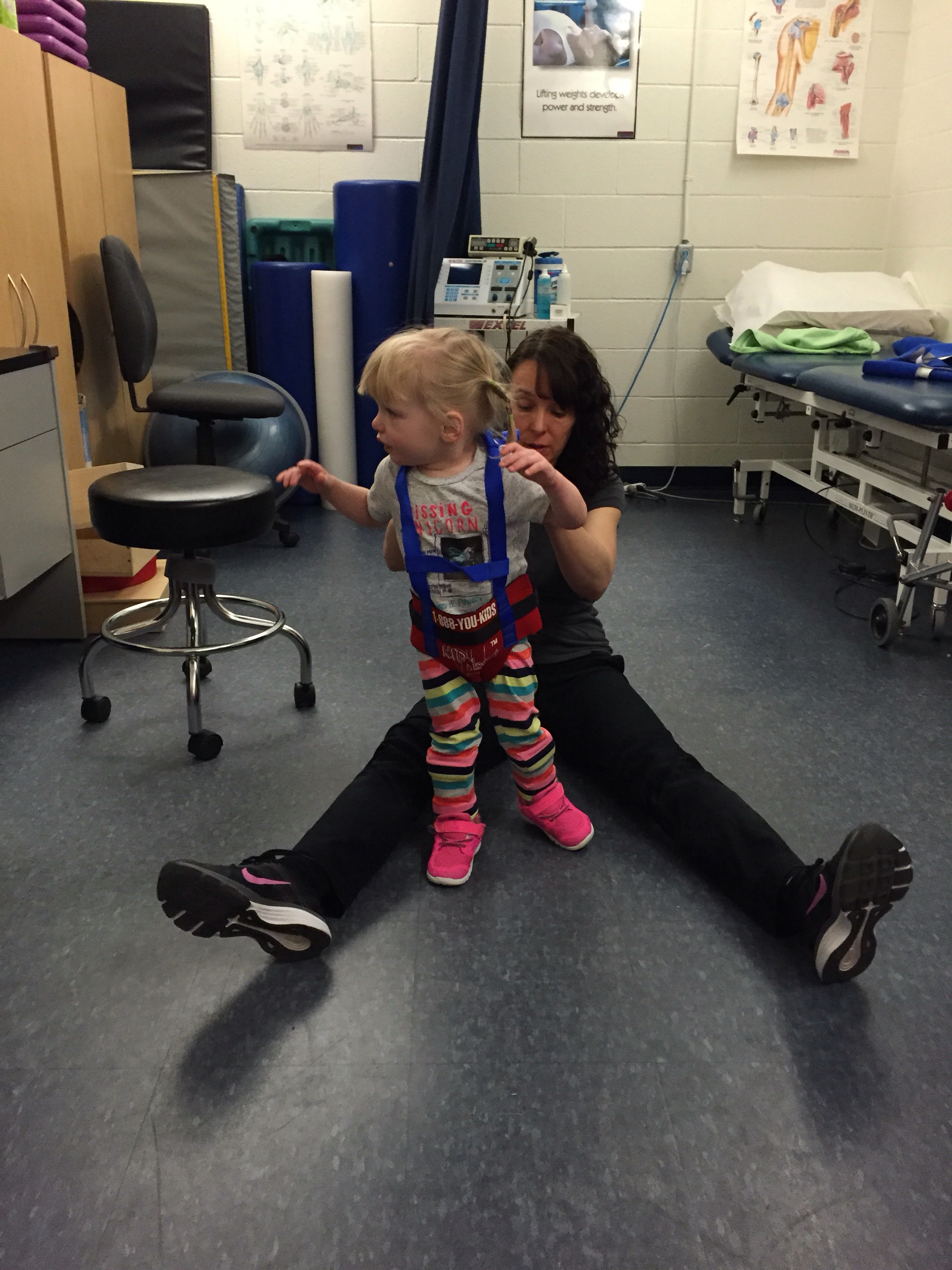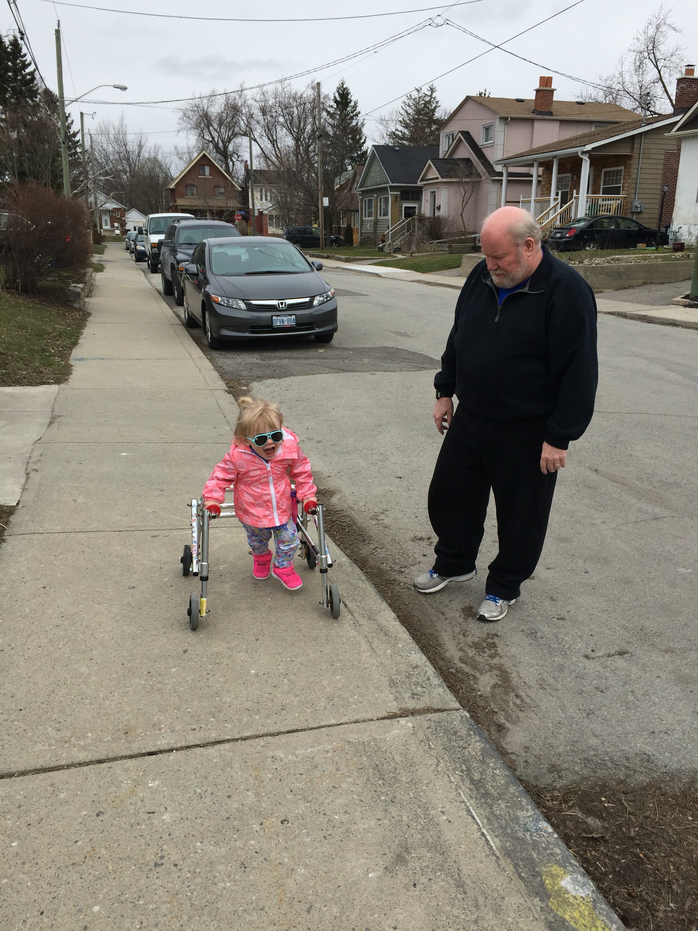 Madison had a great morning at Nana and Papa’s. She baked cookies with Nana, went for a walk outside with Papa and practiced standing and reaching for toys with no hands! We are being encouraged to assist Madison with her walking and standing with our hands off by exposing her to different methods of trying to walk to mix things up, keep her motivated and to develop problem solving skills. Her growing awareness of what challenges her has brought some nervousness about trying things by herself. The more she gets use to not feeling a helping hand when moving, the more confident she’ll become in trying to stand and walk by herself. We have been trying this by using a pole, holding her shirt or pants, using a harness or getting Madison to walk holding a toy and then holding the same toy to help support her. We have been focusing on these strategies a lot for the last couple of days and already see a big improvement with her confidence and risk taking.