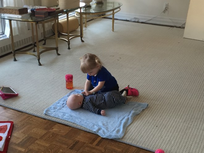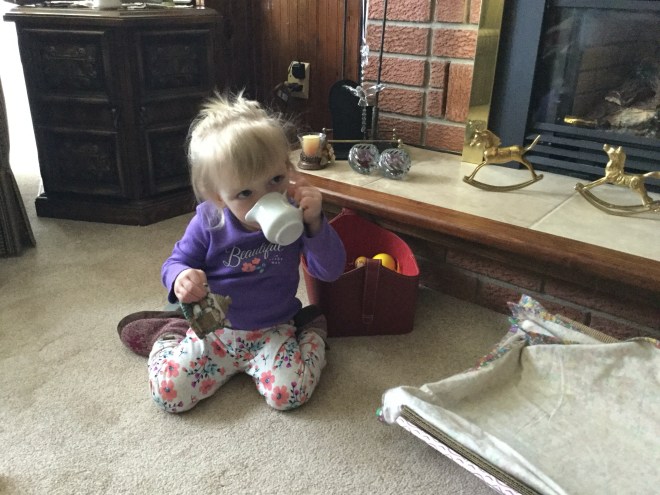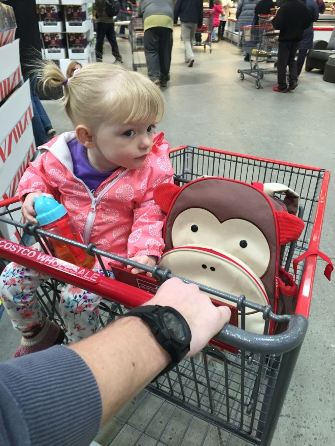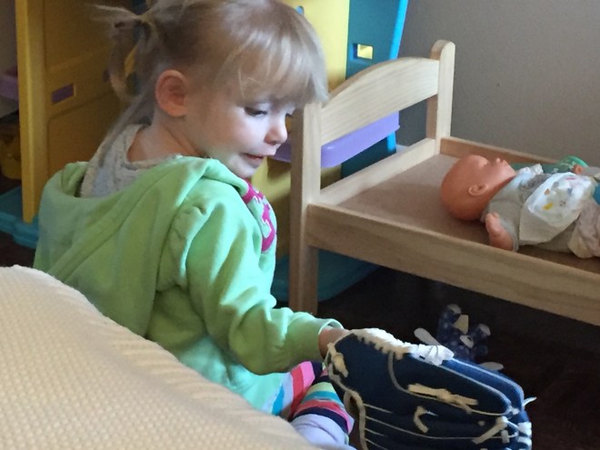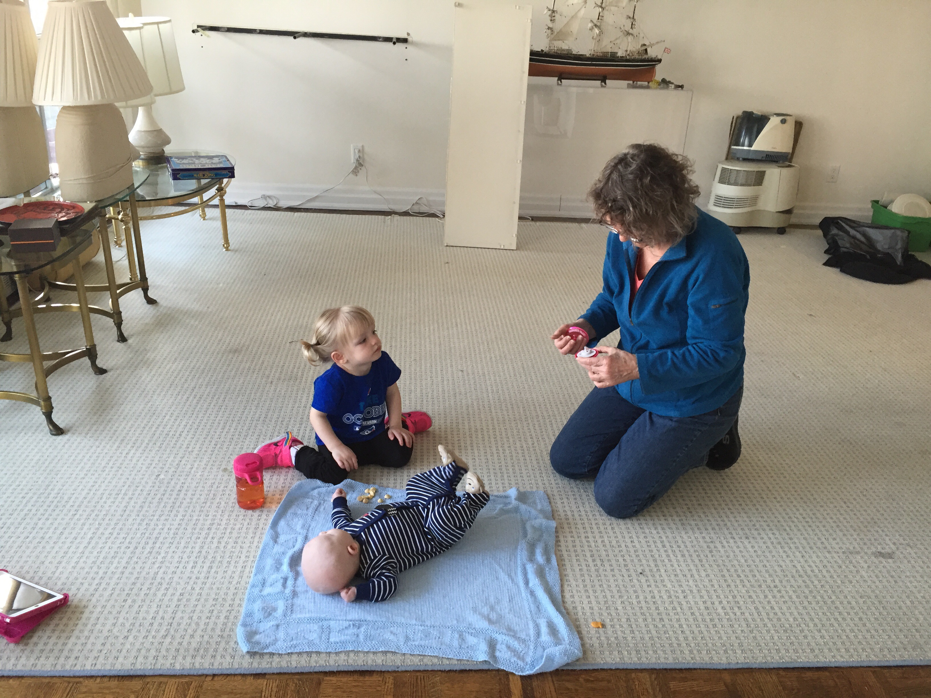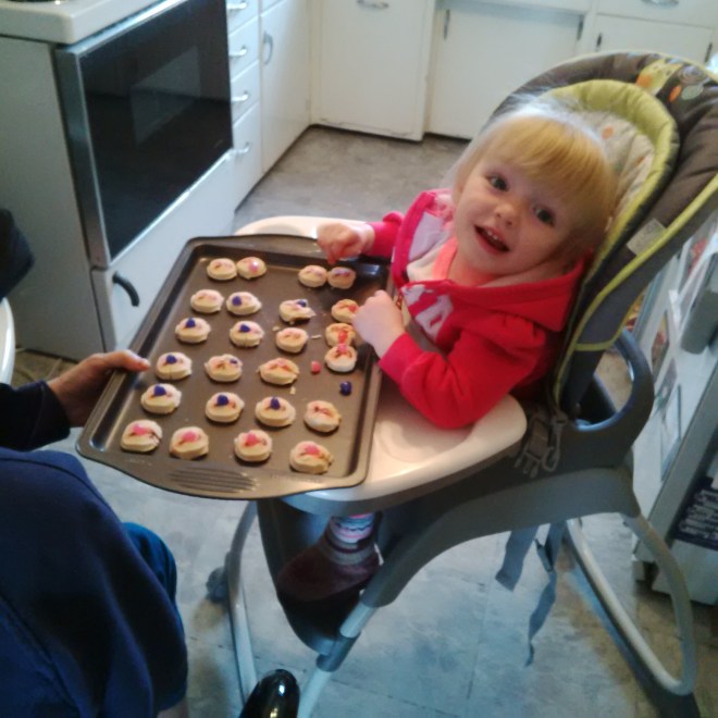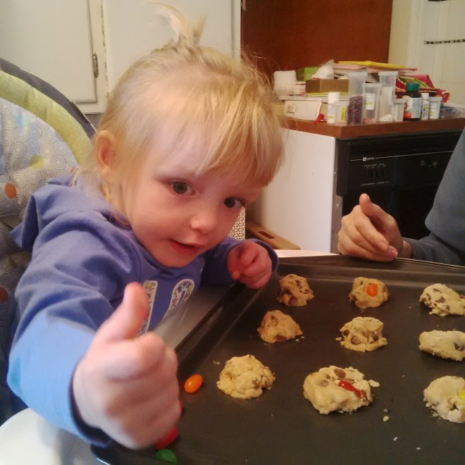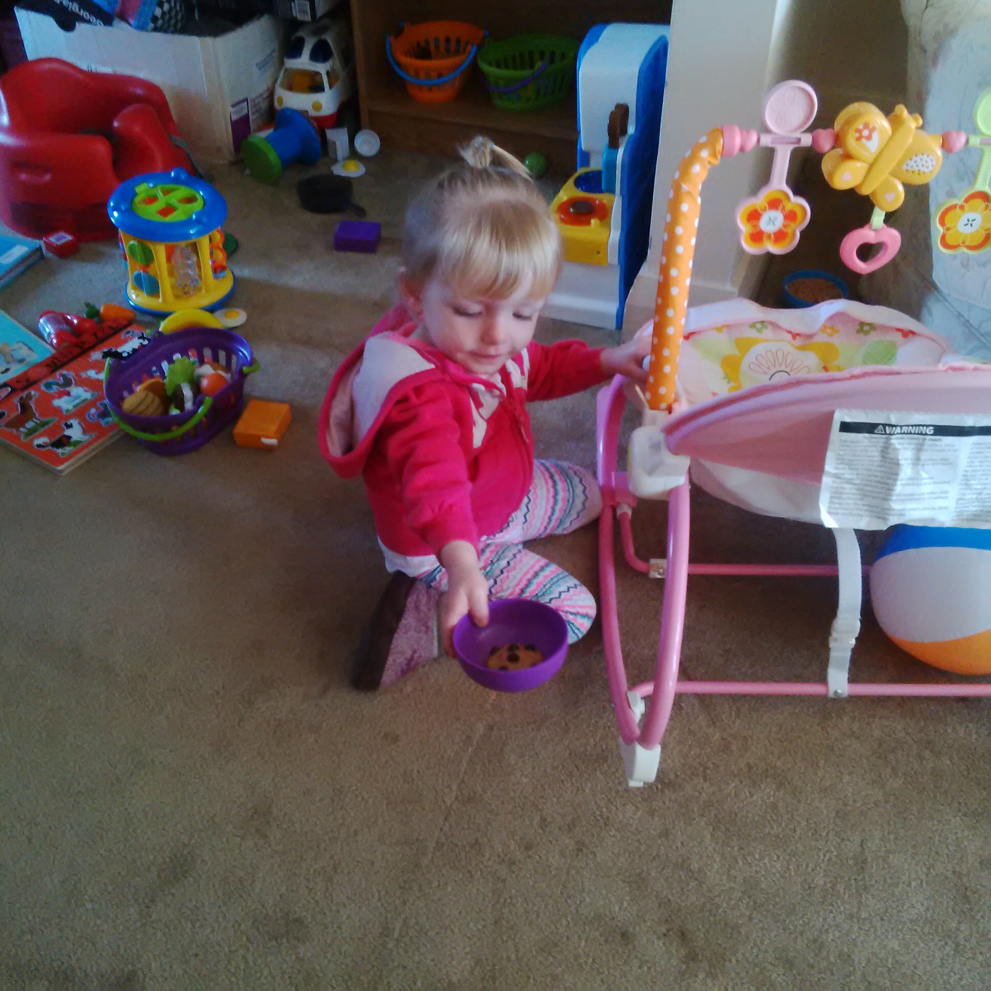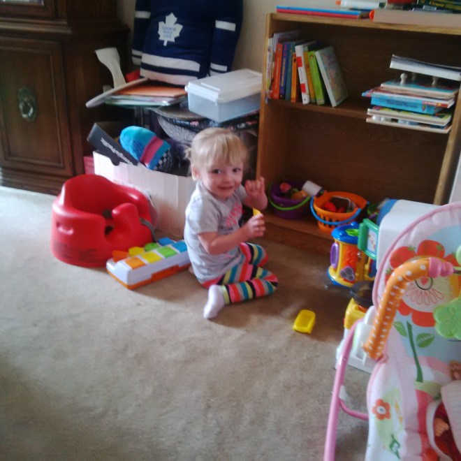 Madison had a great morning at Nana and Papa’s. She baked cookies with Nana, went for a walk outside with Papa and practiced standing and reaching for toys with no hands! We are being encouraged to assist Madison with her walking and standing with our hands off by exposing her to different methods of trying to walk to mix things up, keep her motivated and to develop problem solving skills. Her growing awareness of what challenges her has brought some nervousness about trying things by herself. The more she gets use to not feeling a helping hand when moving, the more confident she’ll become in trying to stand and walk by herself. We have been trying this by using a pole, holding her shirt or pants, using a harness or getting Madison to walk holding a toy and then holding the same toy to help support her. We have been focusing on these strategies a lot for the last couple of days and already see a big improvement with her confidence and risk taking.