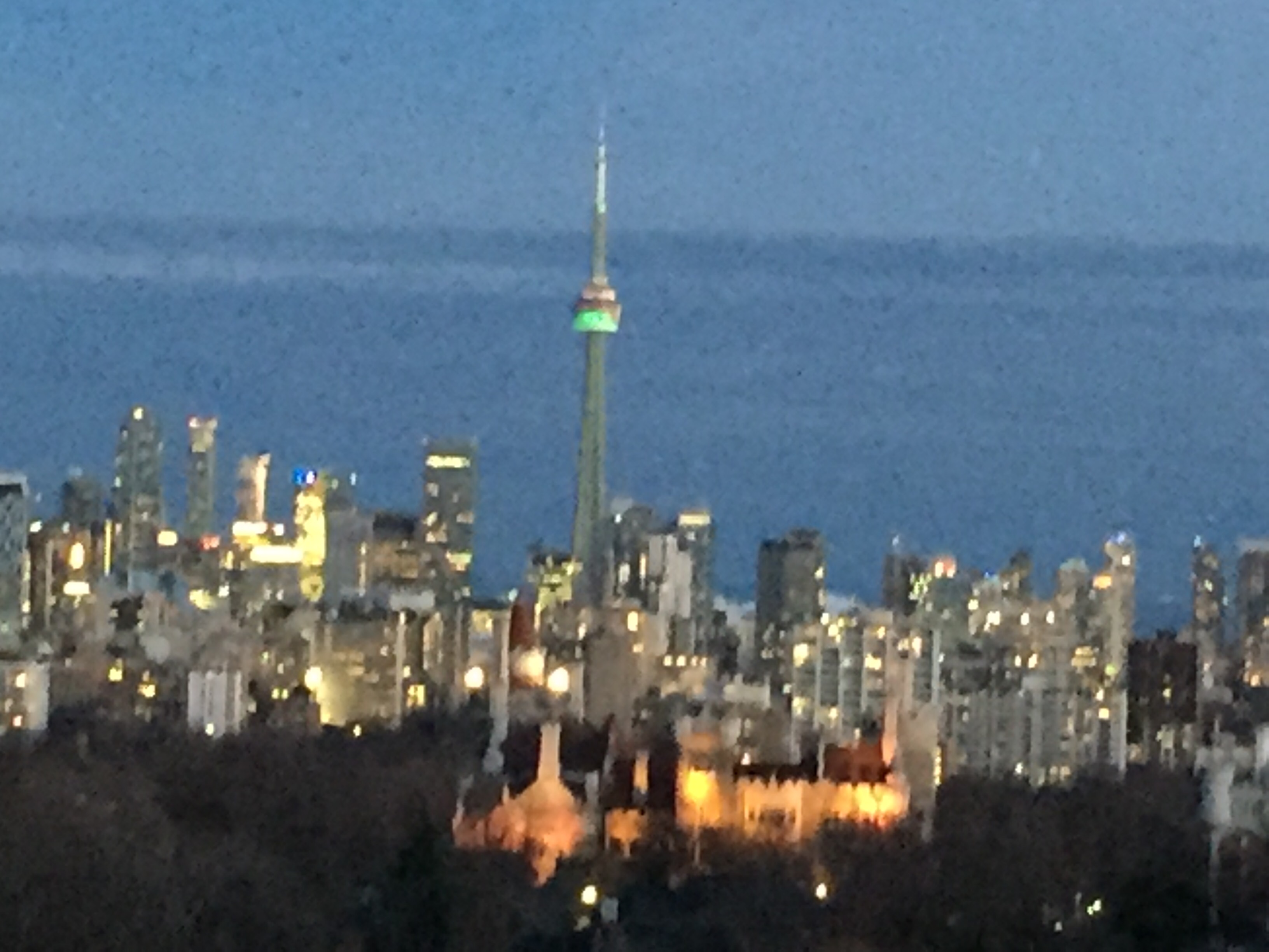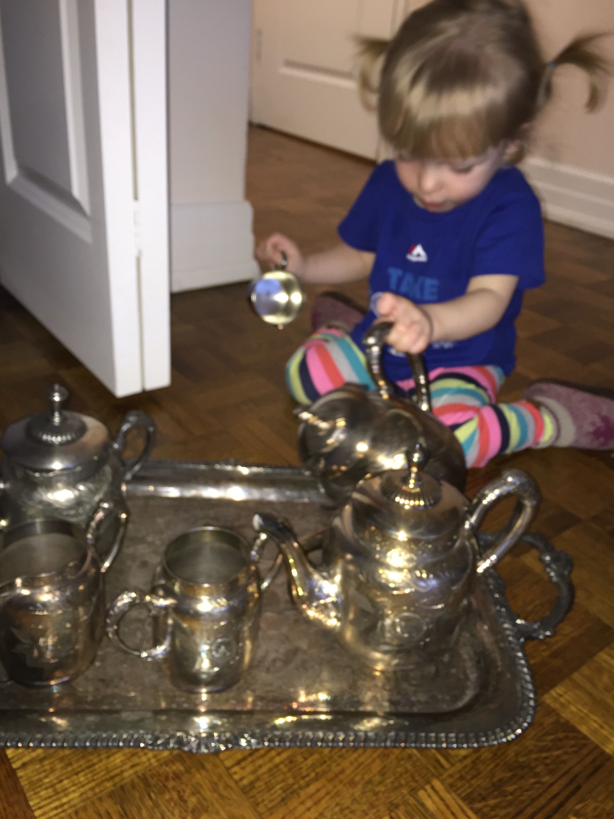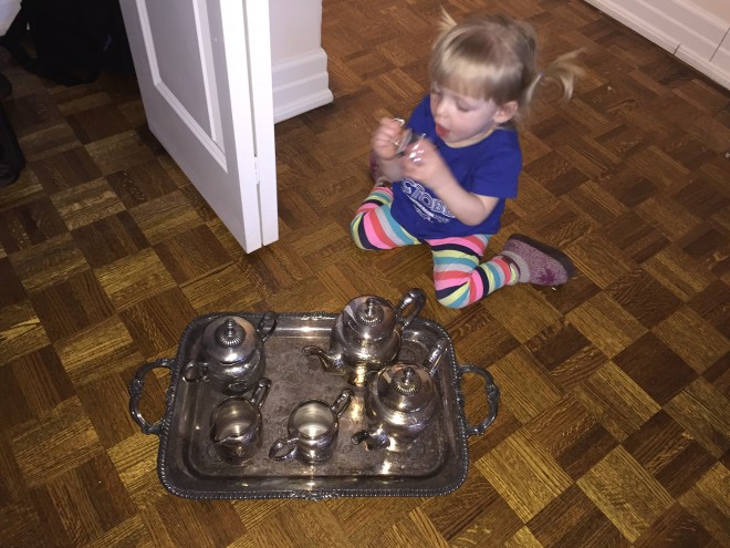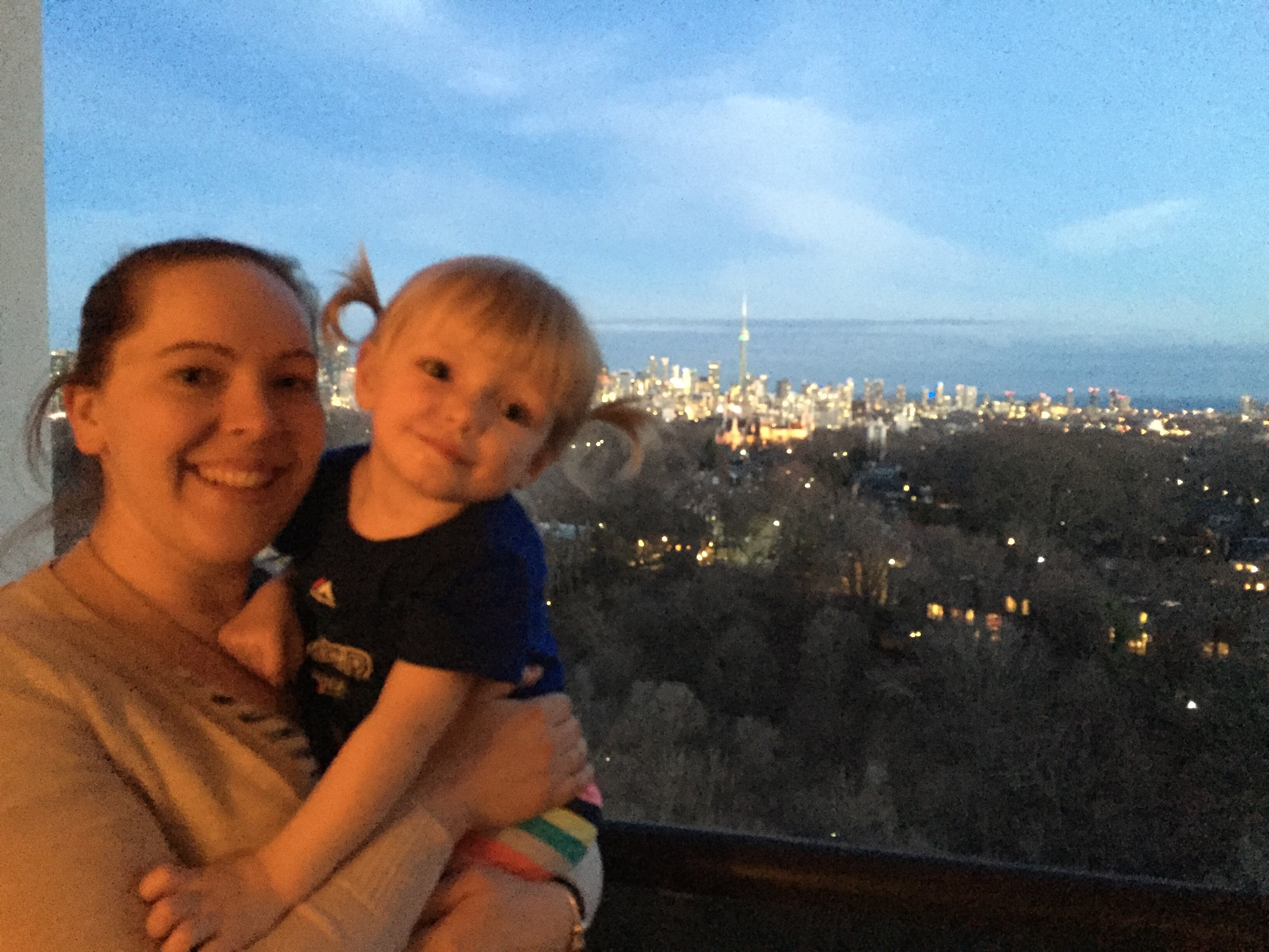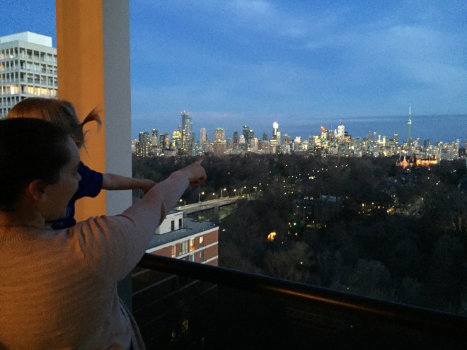 After her session with Stephanie she headed to Great Grandmas apartment to help Nana pack up a few items. Madison’s Great Grandma is now living in a smaller apartment and the family is helping her downsize and keep various items important to her Great Grandma and the family. Mommy and Madi were happy to receive a silver tea and coffee set that was Madi’s Great Great Grandmothers. It is very special to have and she was happy to serve herself tea and play while everyone packed some things up and got organized. When it was almost time to go – Mommy, Nana, Uncle Mark, Aunt Nadia and Jack all admired the view from the belcony looking at the skyline and the CN Tower that was lit up green for organ donation awareness!