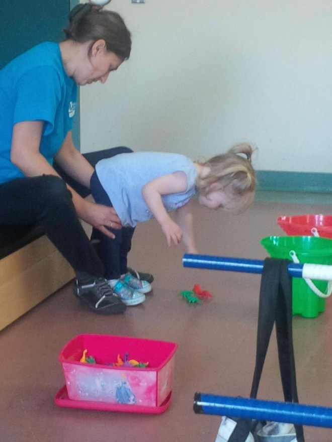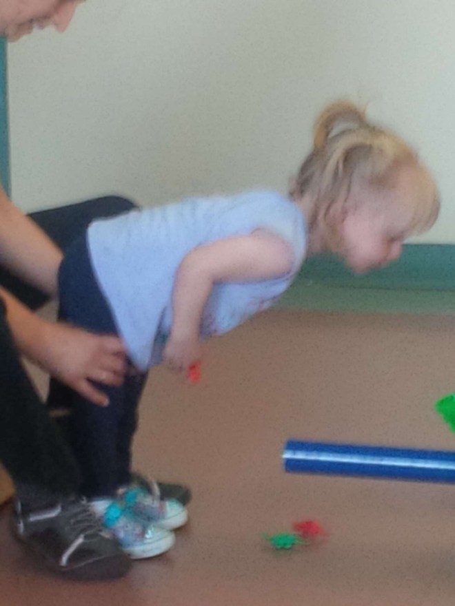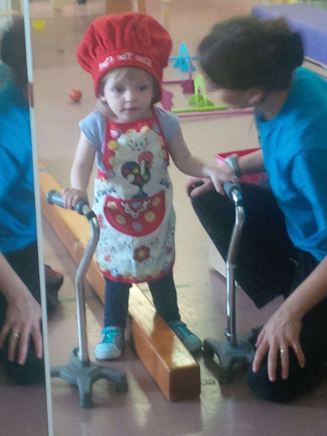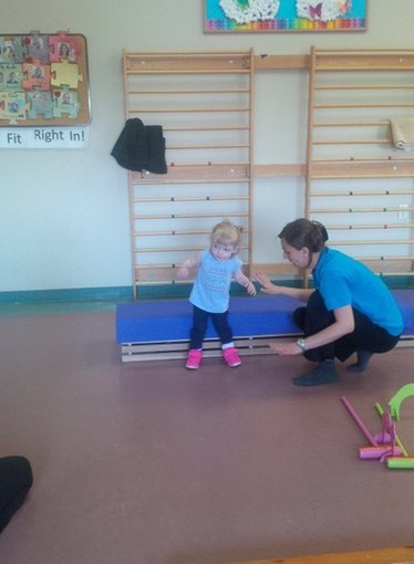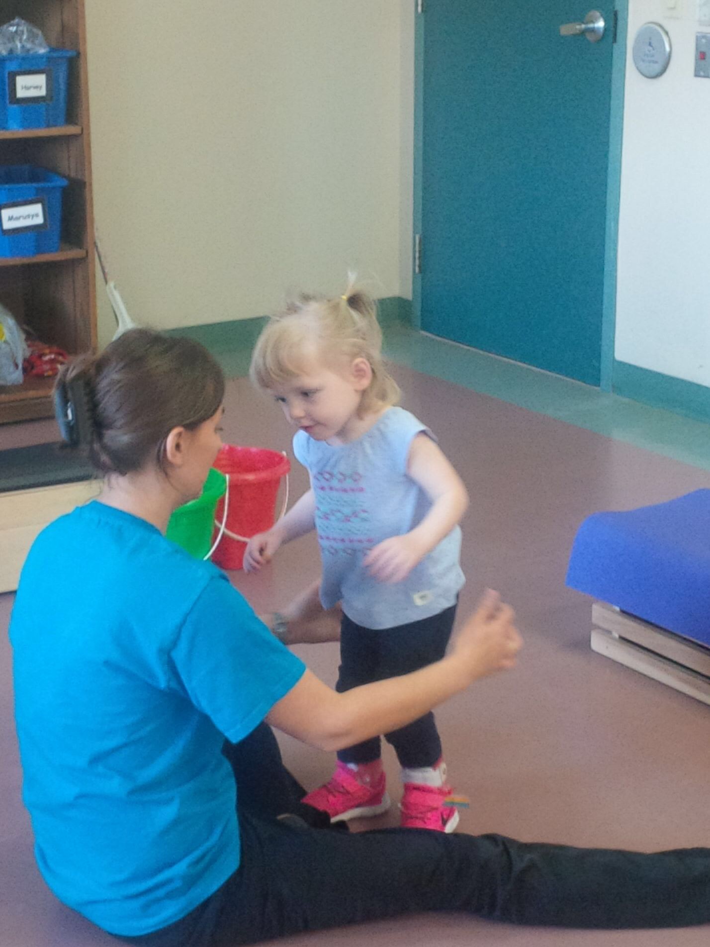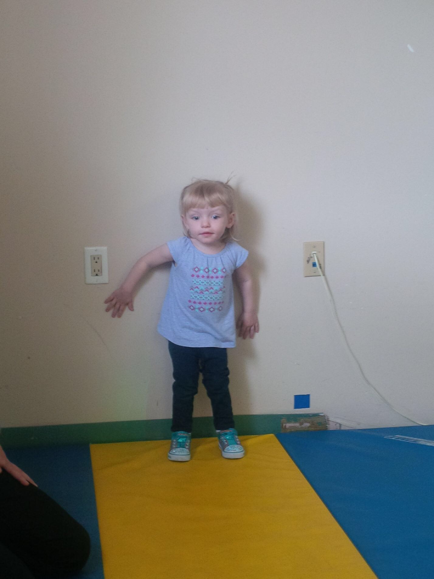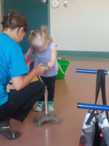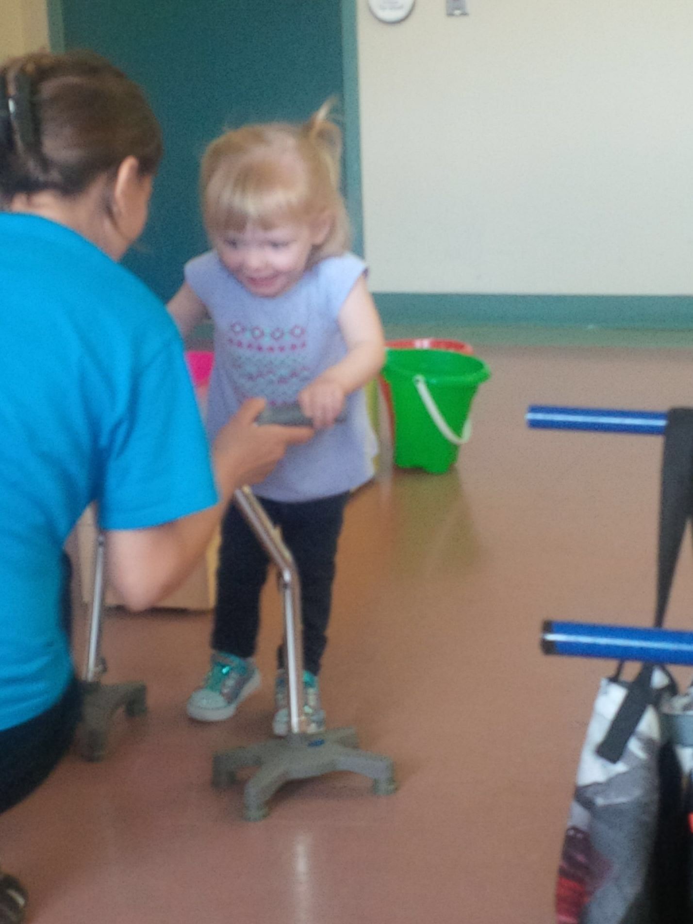Madison worked hard with Monika this afternoon at March of Dimes. She tried standing up from a bench and side stepping without holding onto anything. She did great! They also did lots of stretching of her hamstrings now that the Botox is working its way through her muscles. Madi showed Monika how she has been practicing standing up from the floor and they worked on walking with her canes. When watching Madison at conductive education we often think back to when she first started about 15 months ago. At that time she was learning to roll over, sit independently and crawl. She has changed so much since then and has accomplished so much with her dedication and hard work.