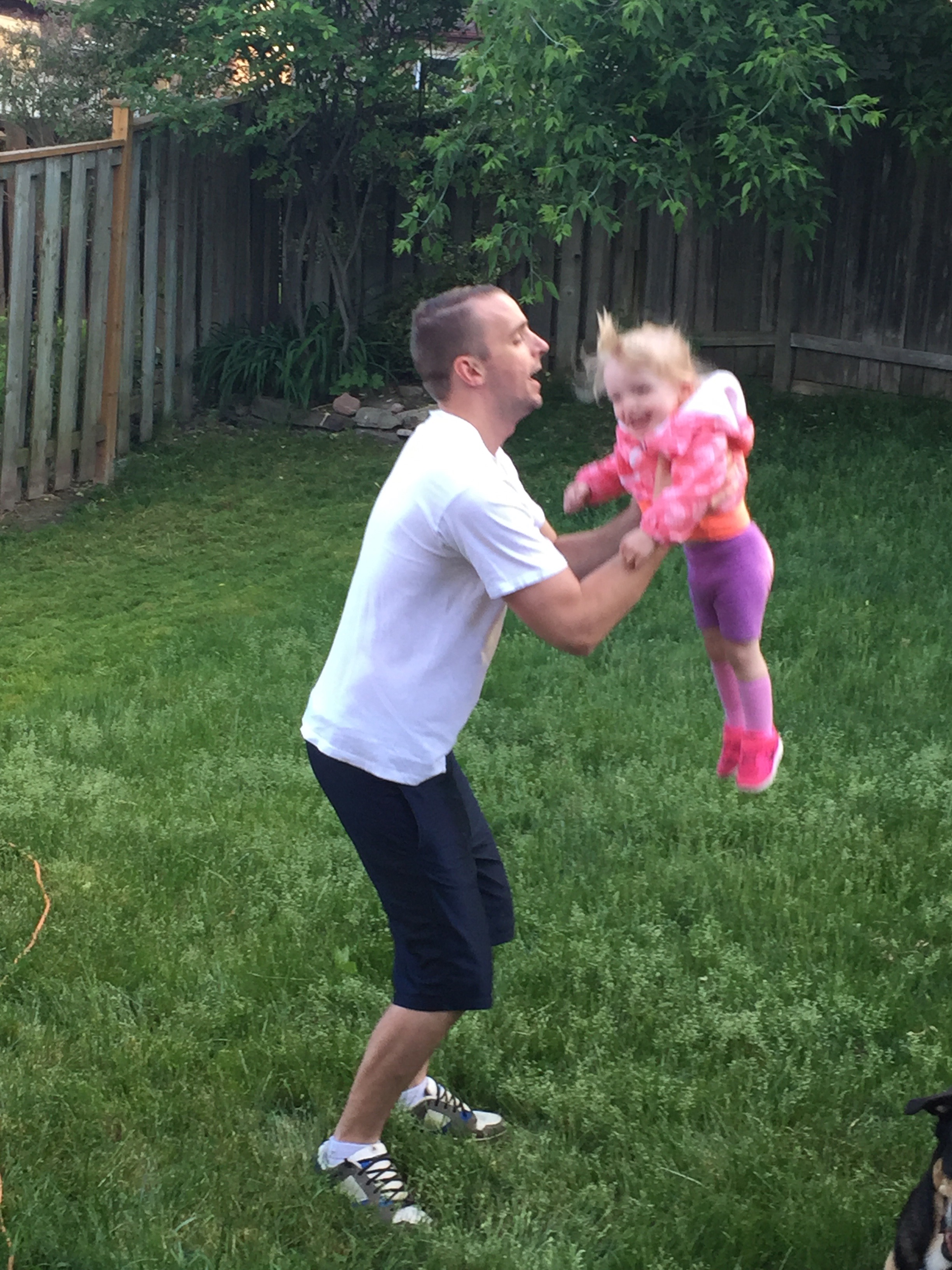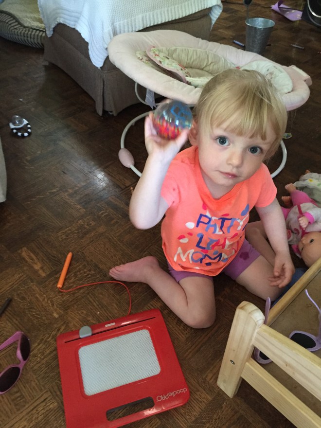 Madison spent some time with Pam and Medford before dinner. She played with her new ball they gave her from their trip to the museum, she helped Pam hang items on the line by squeezing clothes pins and she sang Medford Happy Birthday! When Daddy got home from work, they had some giggles in the backyard before bed.