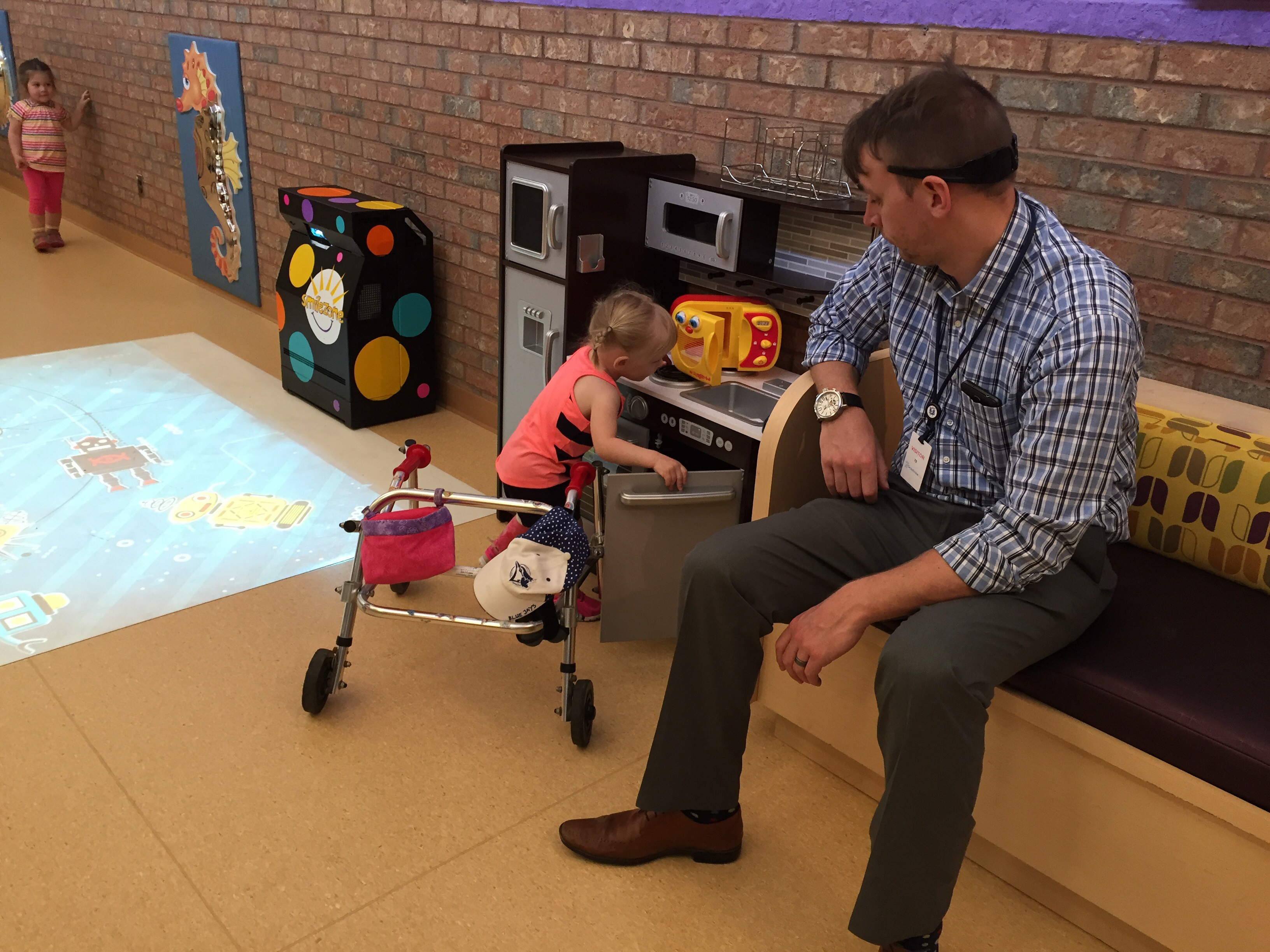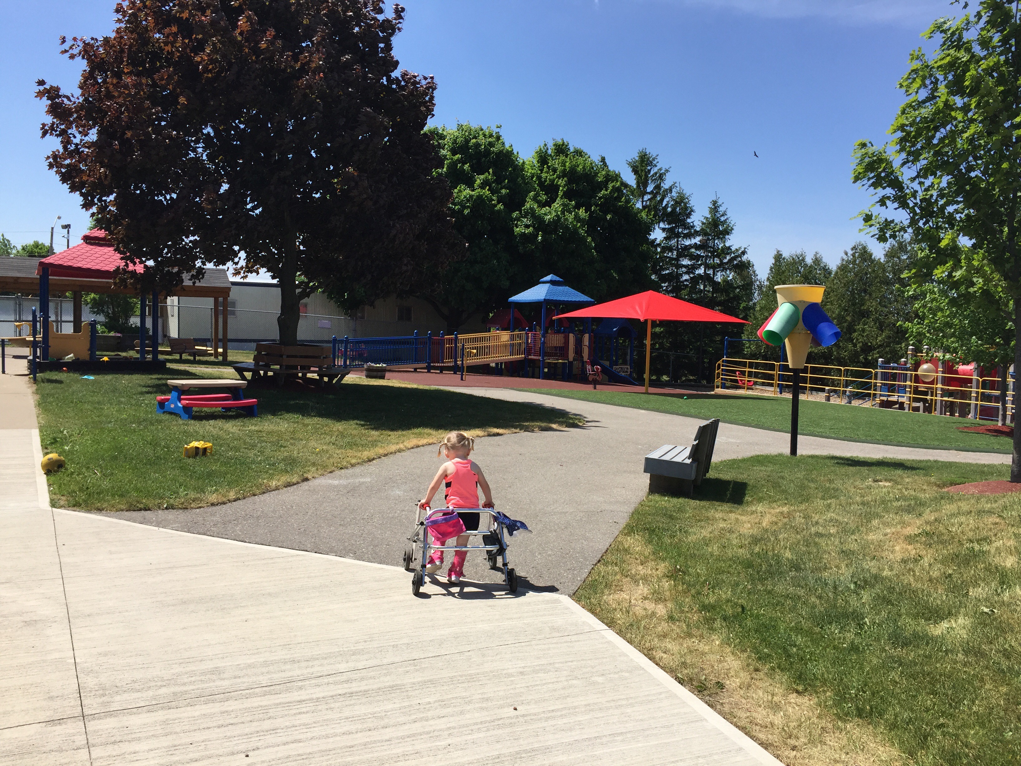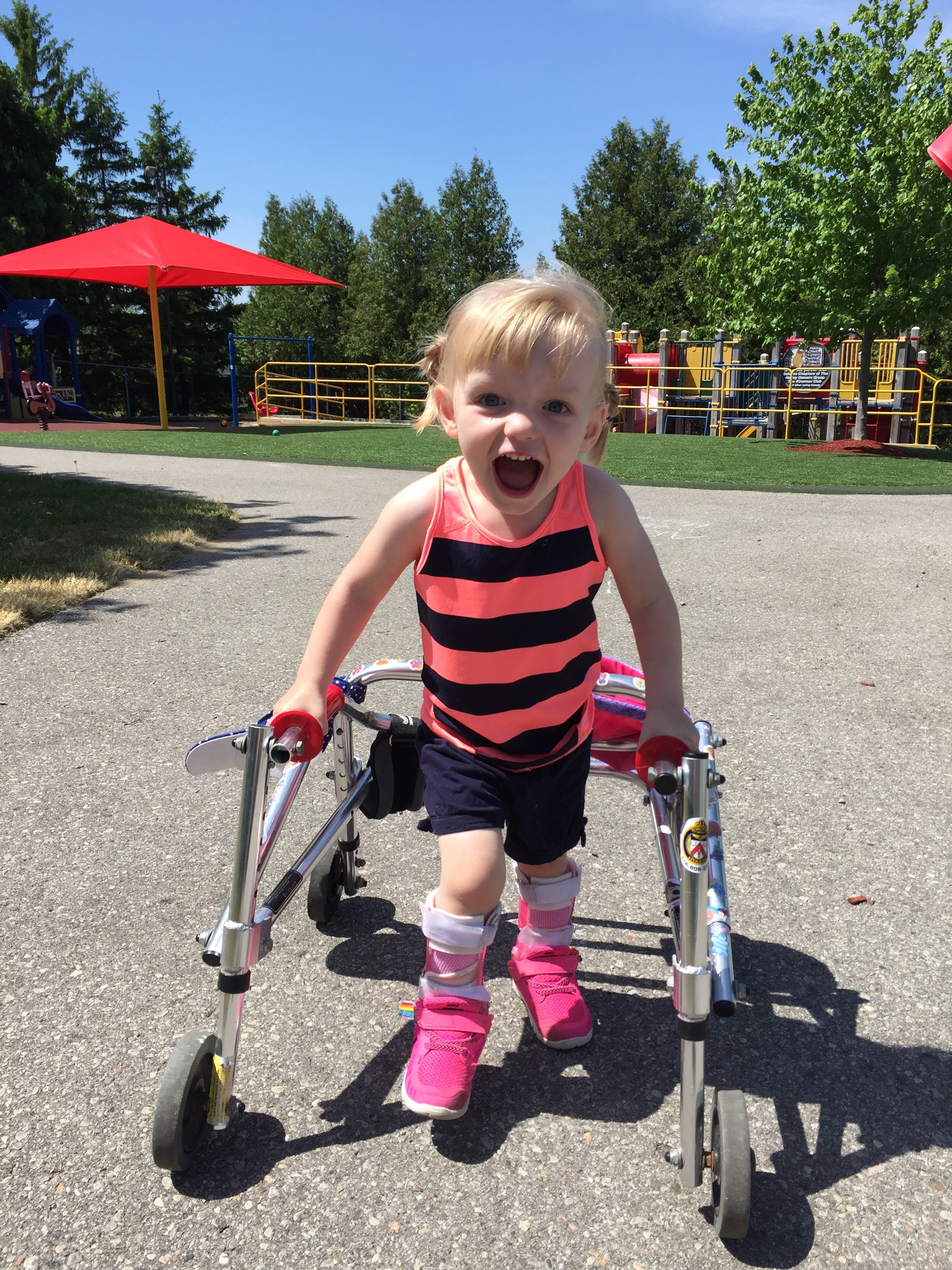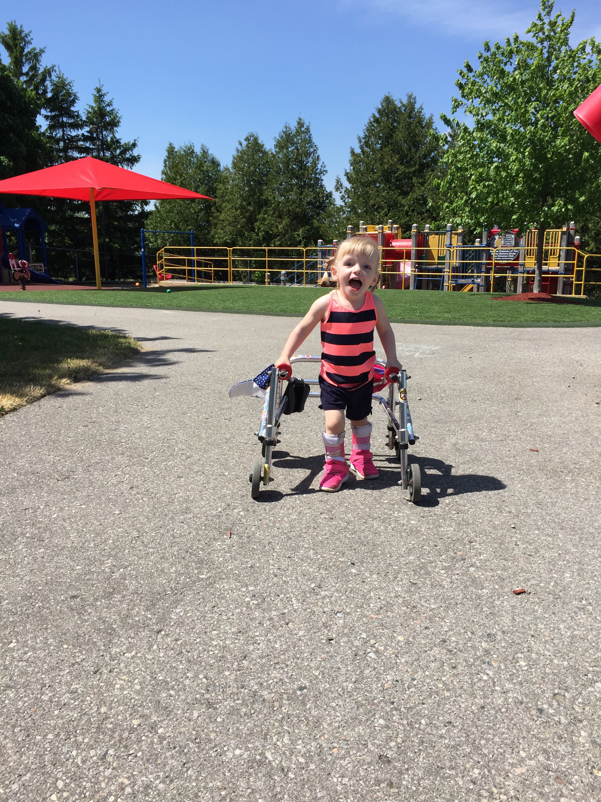 Since Madison’s diagnosis almost 2 years ago, we have been slowly finding ways to make our home easy for Madison to be independent and access what she needs. Something new to us right now is Madison’s desire to be independent outside. We love that she wants to be outside all the time, but she is not able to do it by herself because of the layout of our backyard screen door. The last couple of days she has asked to go in the backyard and we have let her try going in and out of the house herself as she wants. The freedom and independence has been exciting for her, but her walker does not fit through the door and then there is the issue of the steps. She has been crawling in and out but it has left her knees and legs bruised, swollen and cut up. We want to find a good long term solution but in the meantime we have tried padding her knees or laying towels down on the brick and concrete. We are thinking of applying to the Presidents Choice charity for home repairs or to Brian Baeimers charity for home repairs. We are currently looking for other organizations we could apply to for assistance either with materials or labor to help with this project, as well as an organization that provides accessible swing sets or playgrounds for backyards.