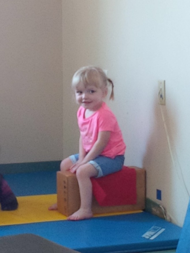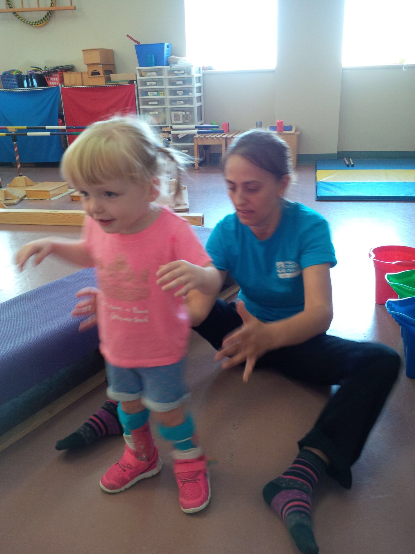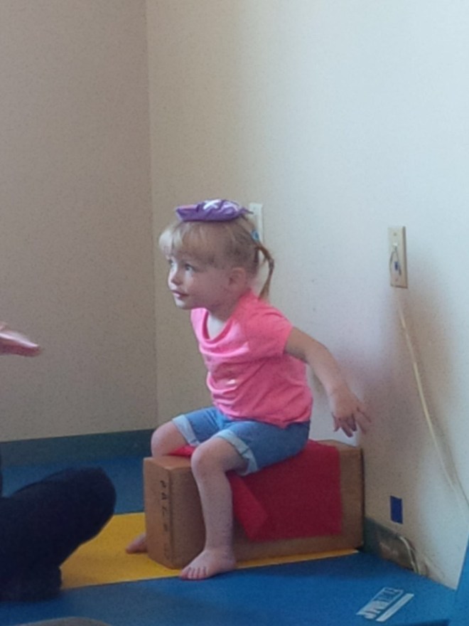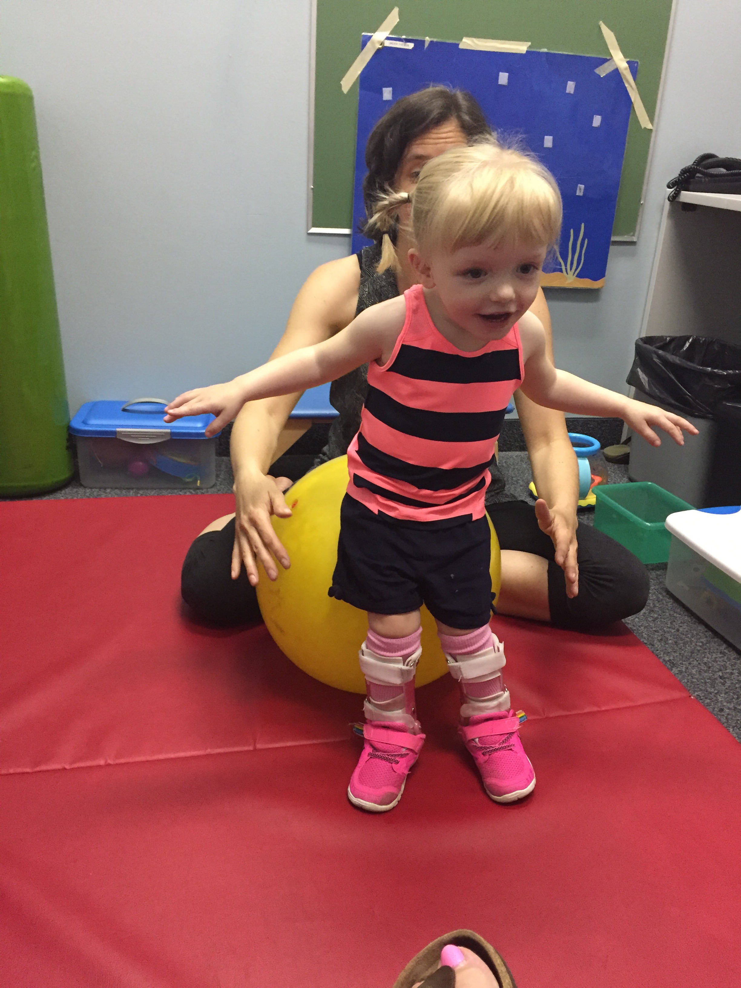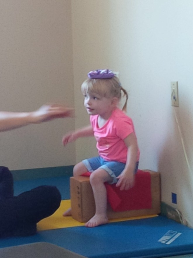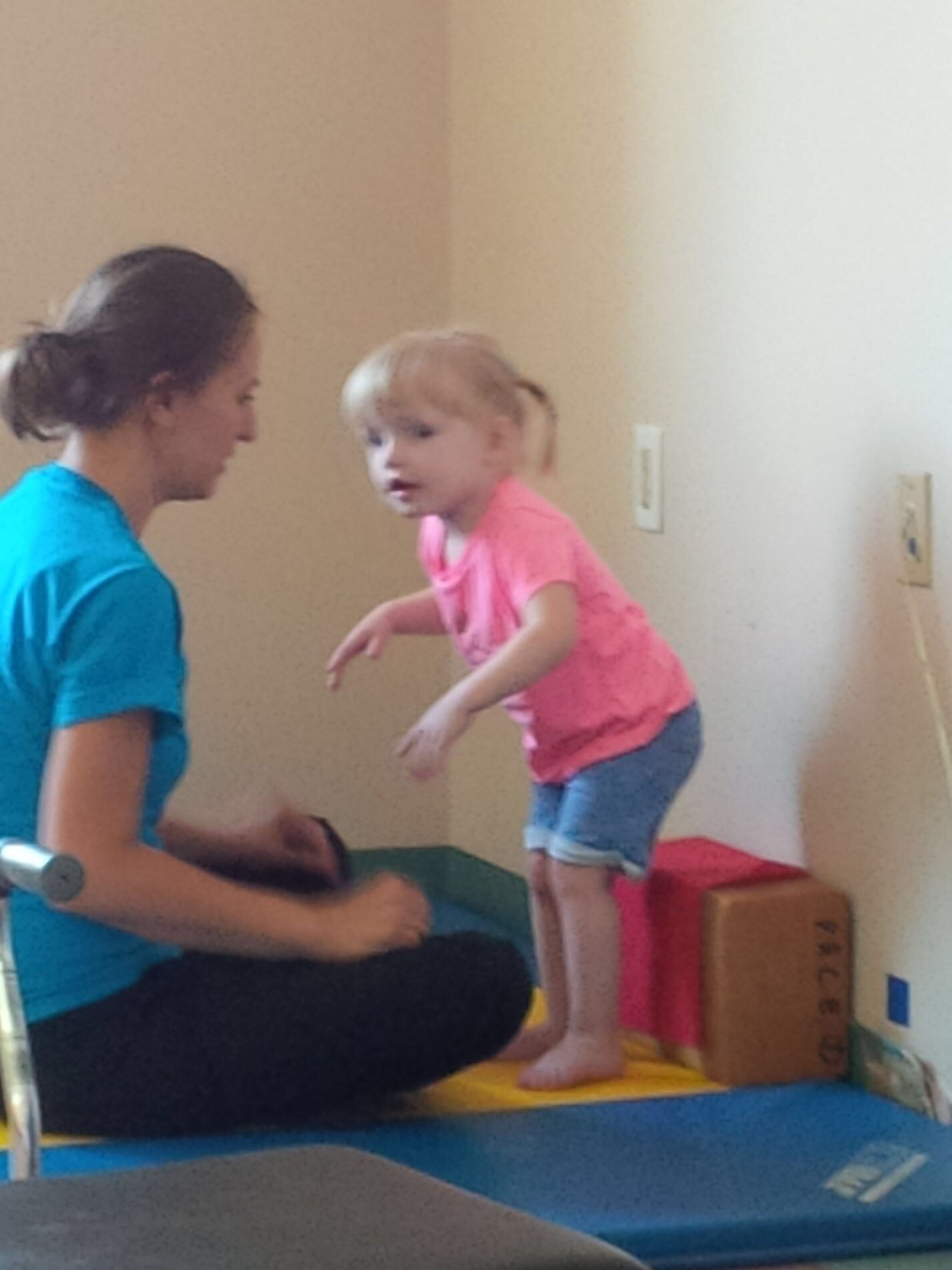 Madison worked with Monika at Conductive Ed today. She did a great job working on straddle sitting to standing and independent standing! Madi practiced sitting and standing with a beanbag on her head to keep her balance and head up. She also took several independent steps today. She had an off day at school but seemed much more herself once she was with Monika and her aunts.