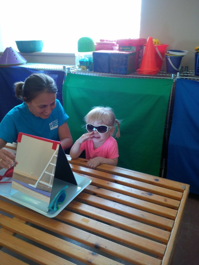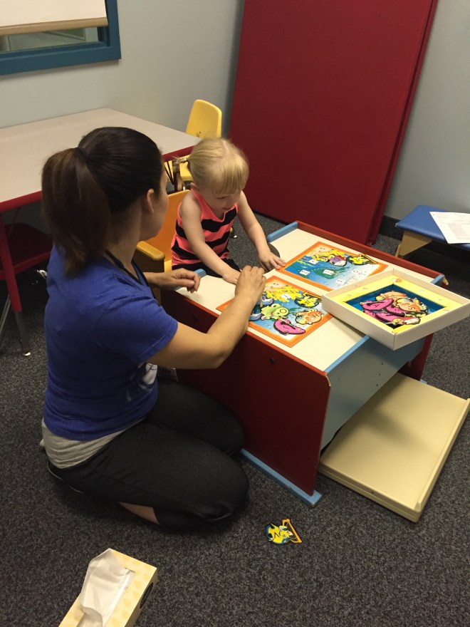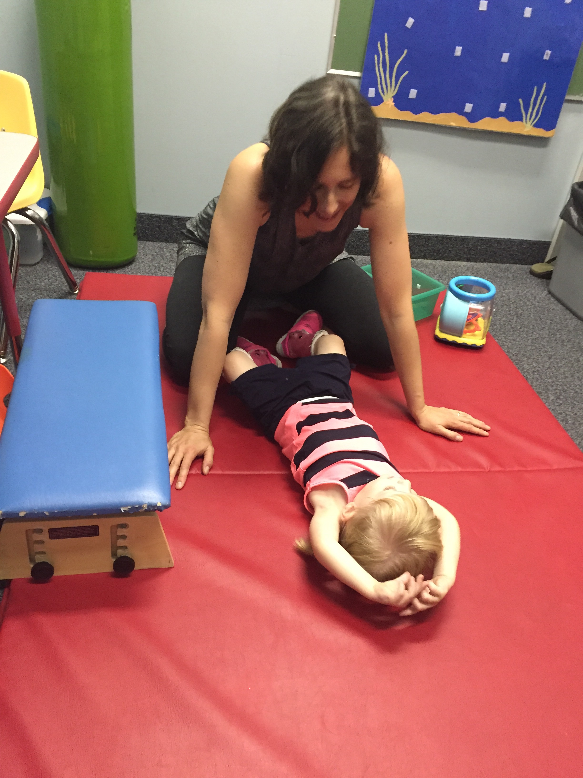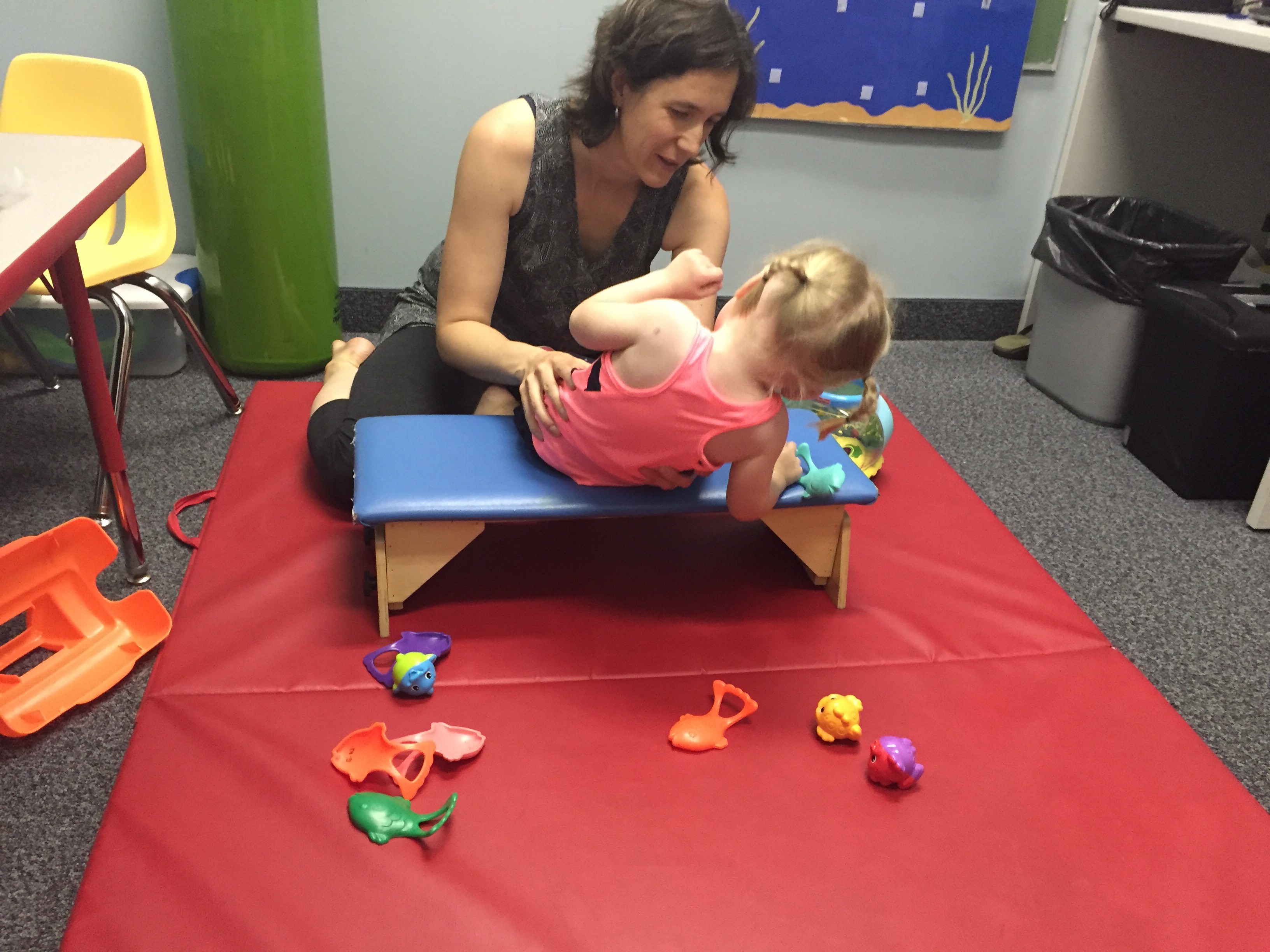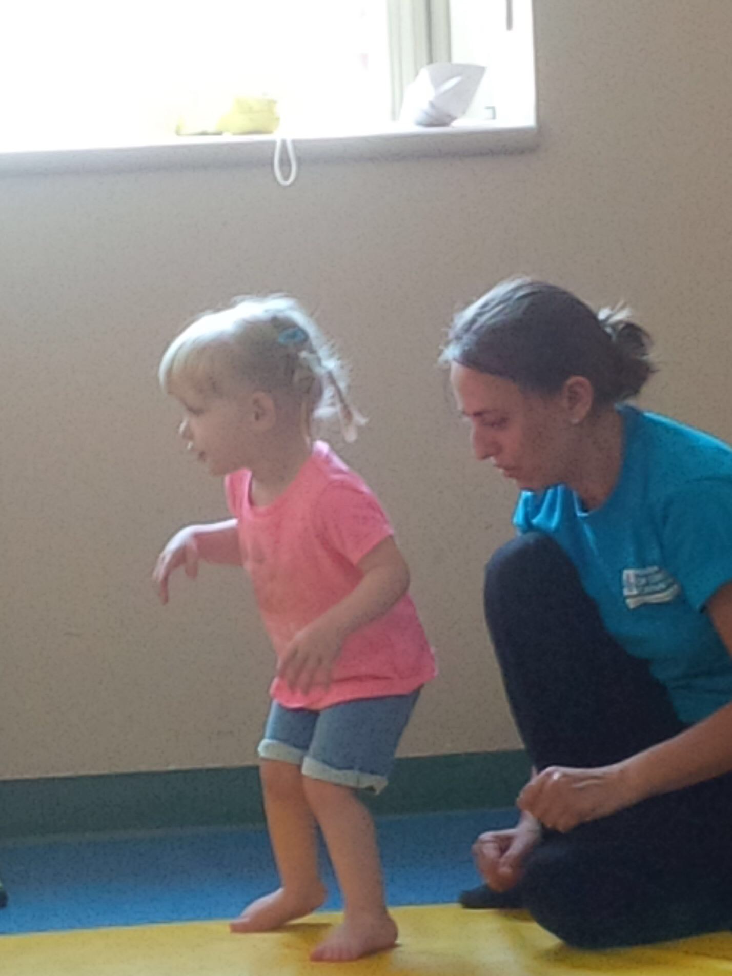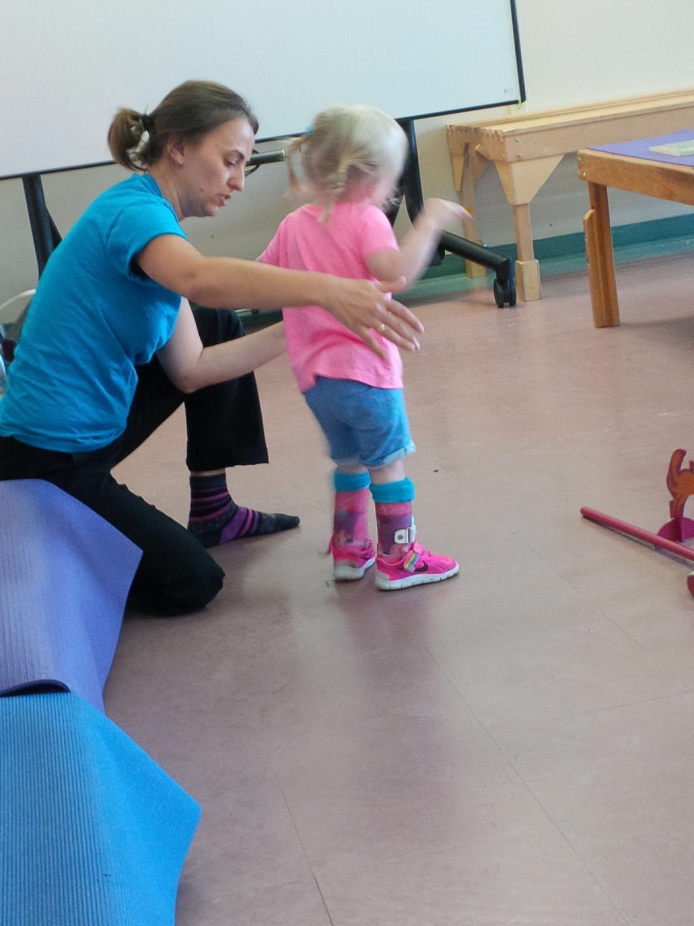Madison worked with Monika at Conductive Ed today. She did a great job working on straddle sitting to standing and independent standing! Madi practiced sitting and standing with a beanbag on her head to keep her balance and head up. She also took several independent steps today. She had an off day at school but seemed much more herself once she was with Monika and her aunts.