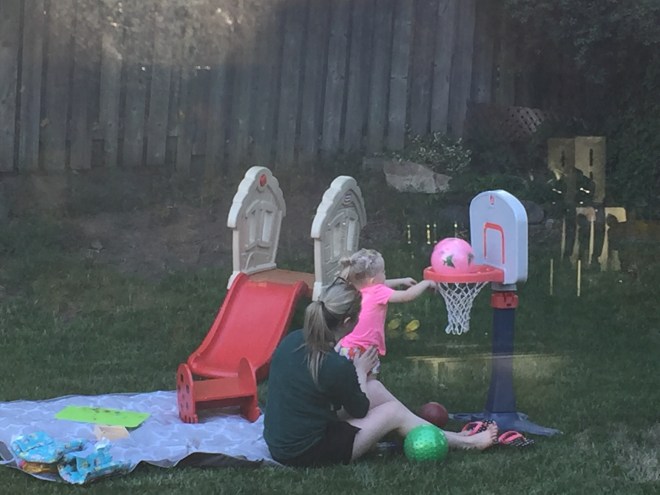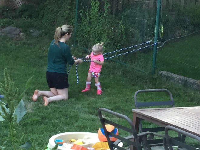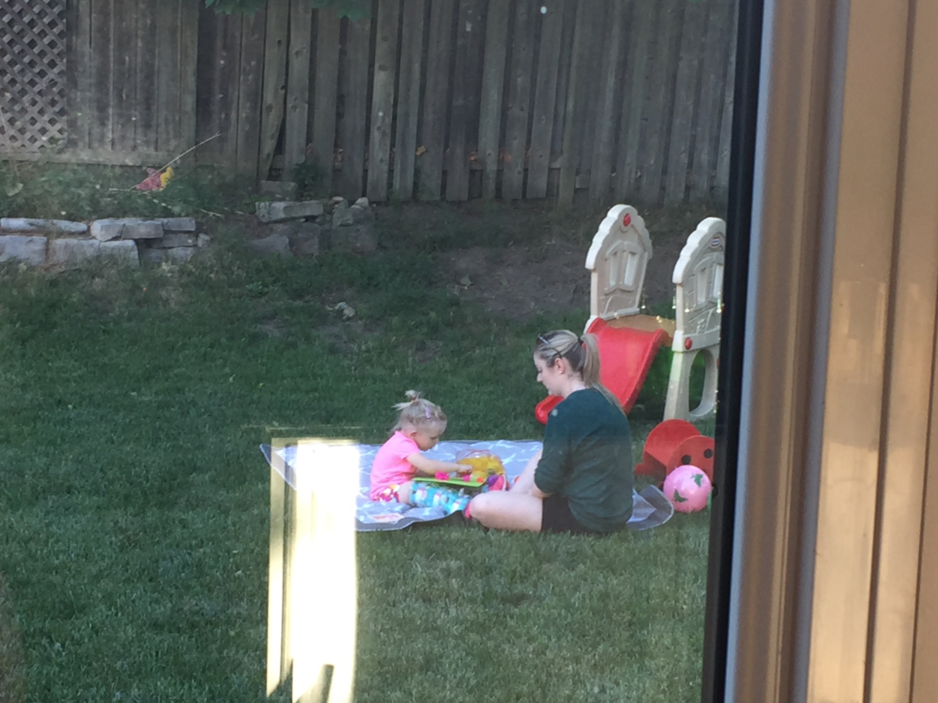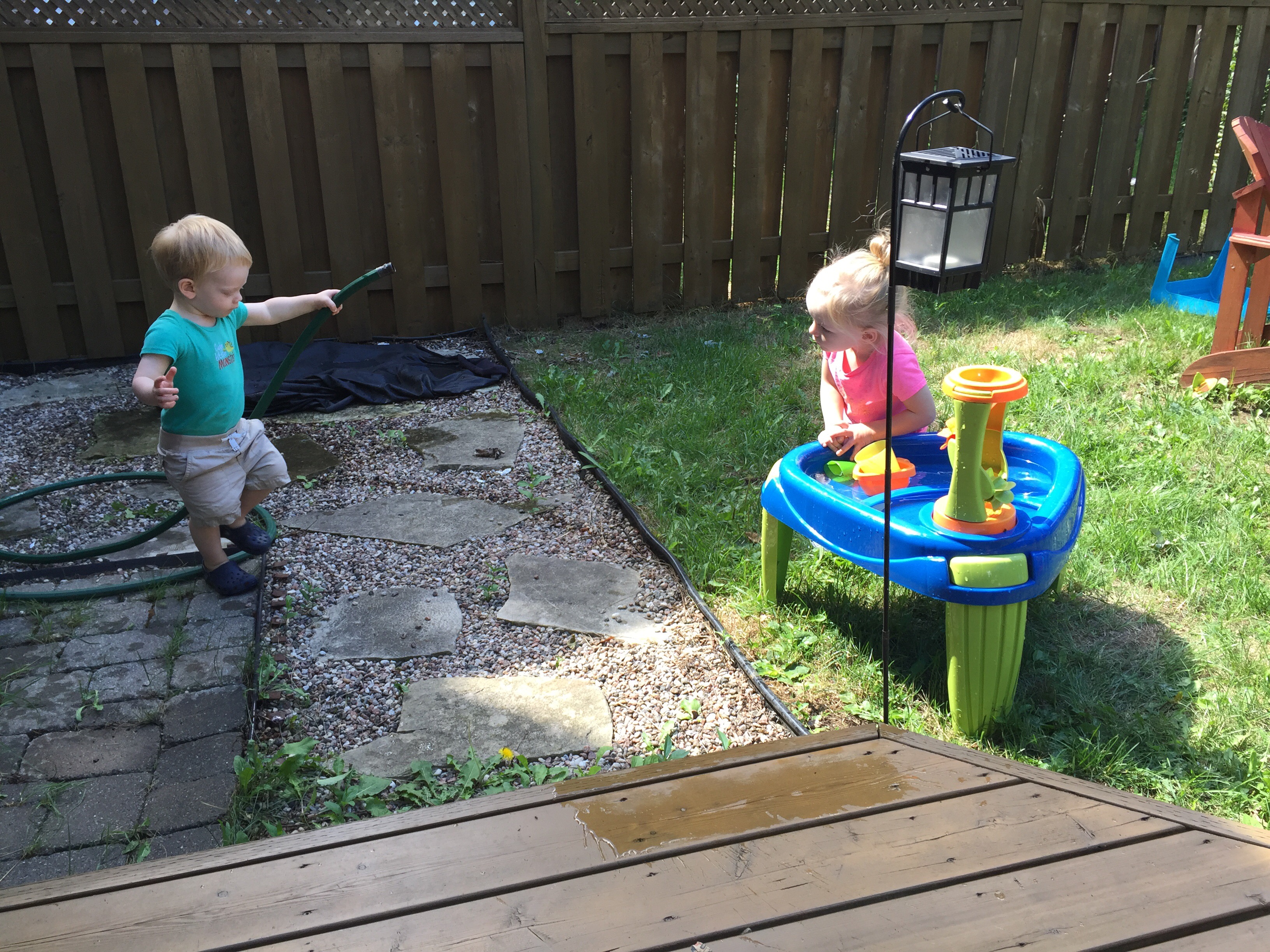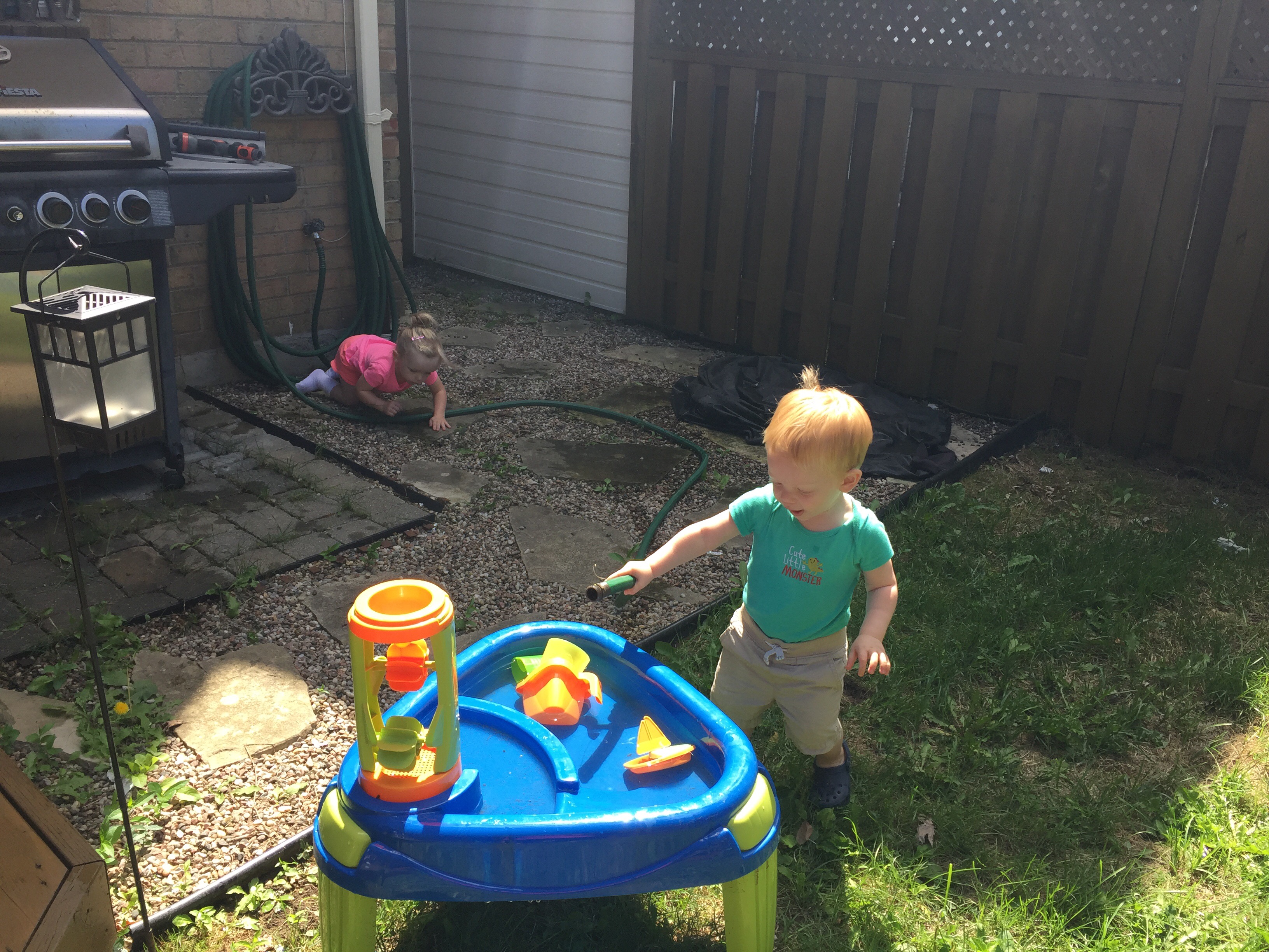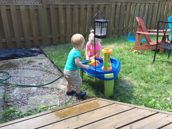 On their way home, Madi and Jack stopped by Nate’s house for a quick play. They re-arranged uncle Marks rocks in the backyard and filled the water table using the hose.