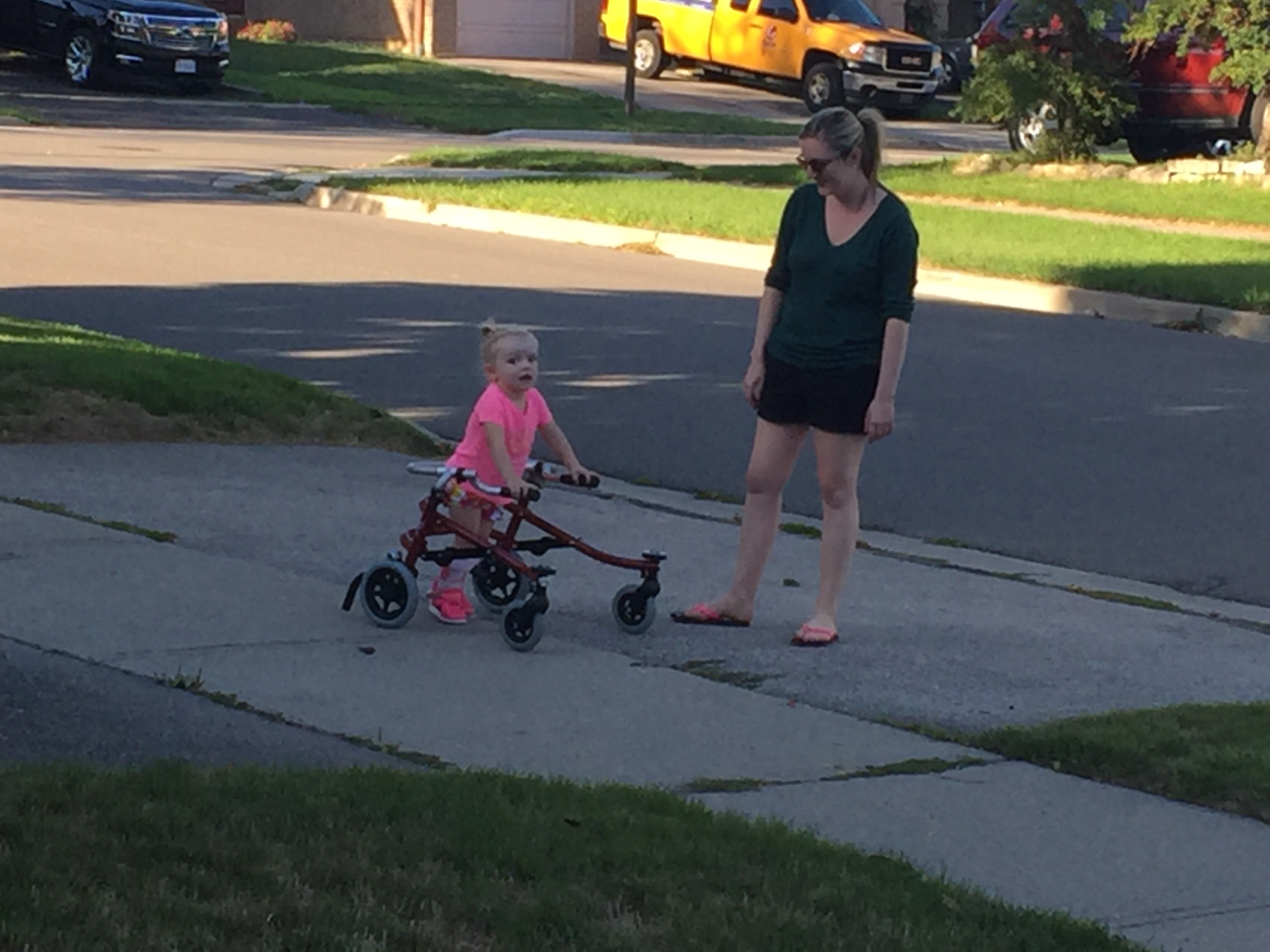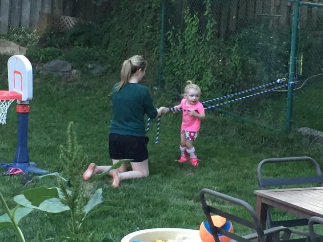 Madison ended her day with a great session with Emily. They walked up and down the street to practice in her walker. She also practiced her walking in the backyard using her ropes and she got a great stretch with her Gaitors while they did a puzzle and played with play dough. Emily leaves for school In a week and Madison is going to really miss their time together. We are so excited for Emily to start school for physio and are so grateful for all of the time and support she has given Madison. Good luck at school Emily!!