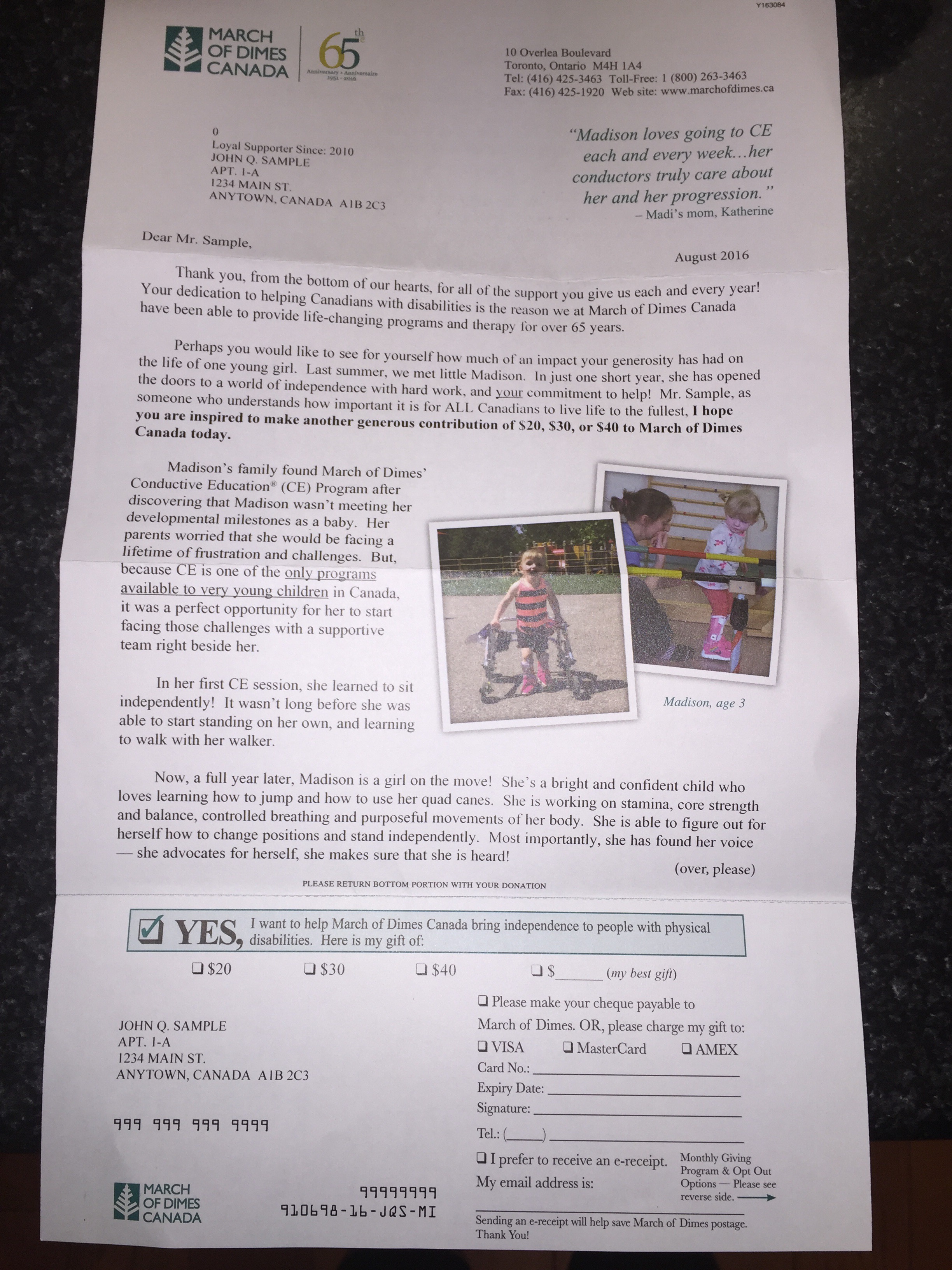Madi is honoured to be a part of the March of Dimes mail out campaign once again. The last mail out she did was so successful they asked for another. This mail out recaps her last year of therapy and how far she has come.