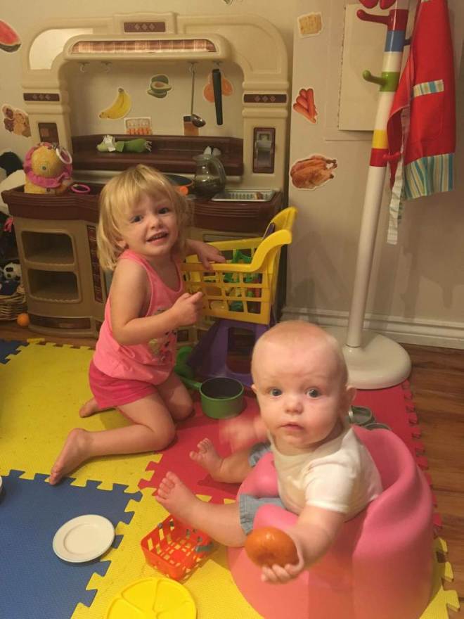 While Daddy was briefing auntie em on “life at the zoo”, em thought she heard a knock at the door. So we walked to the bottom of the stairs and looked up, and who did we see? Madi! She had gotten out of bed, crawled to the door and somehow opened the door and was sitting at the top of the landing, ready to play.