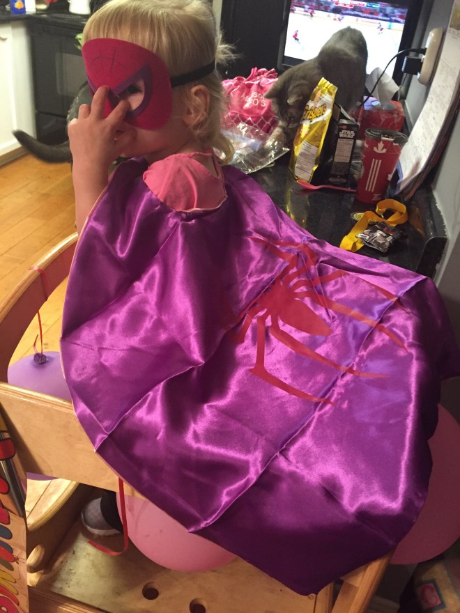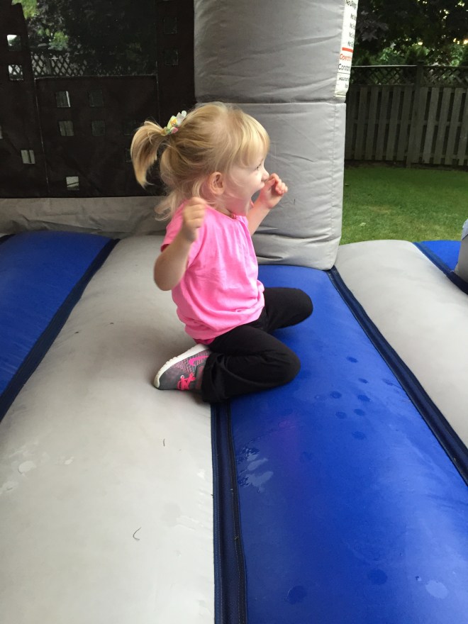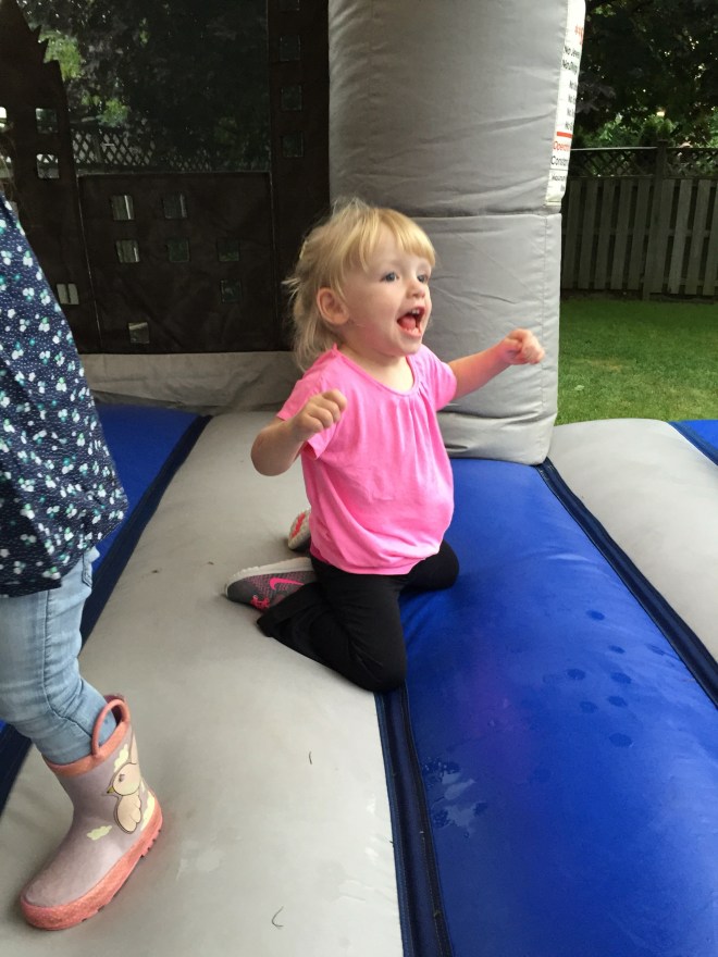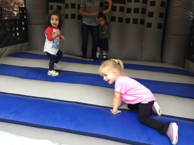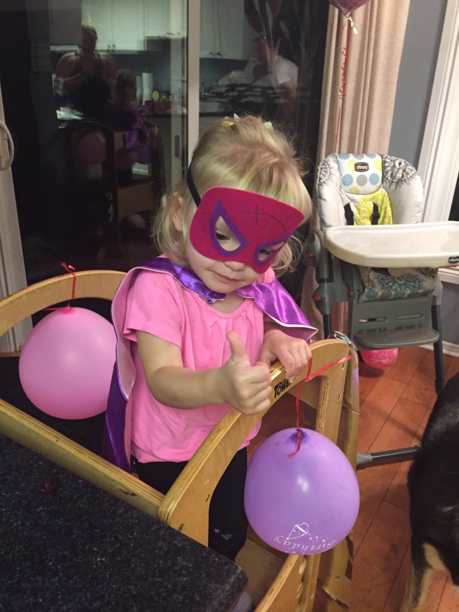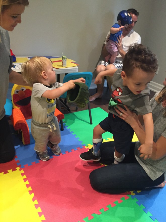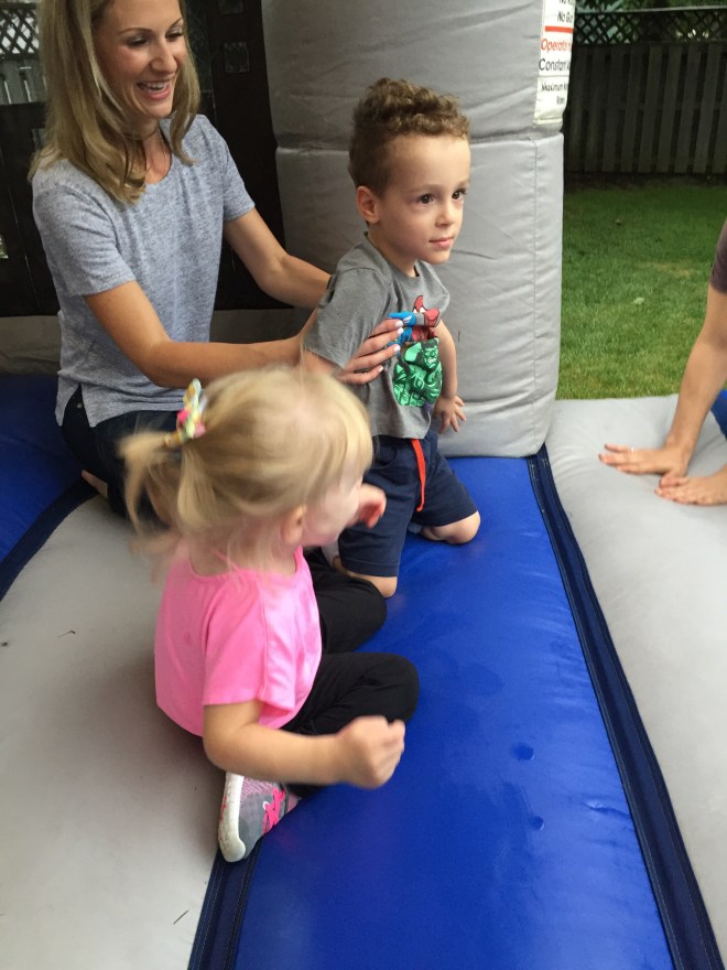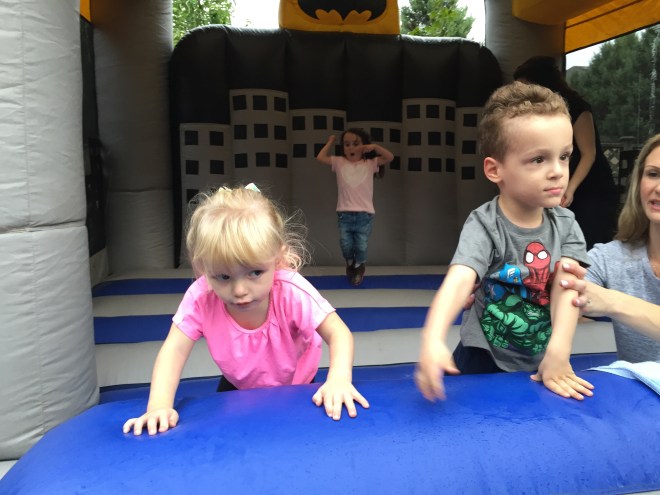MThey ate lots of yummy food, played with all Ben’s toys, sang happy birthday with a super cool super hero cake and jumped like crazy in the super hero bouncy castle. Mommy was so proud of Madi for trying to jump on her feet. She has been working on the feeling of jumping and learning how to bend her knees and then reach high to jump at conductive Ed for over a year. She is always scared to let go when jumping and she tried it today! Check out the video below!