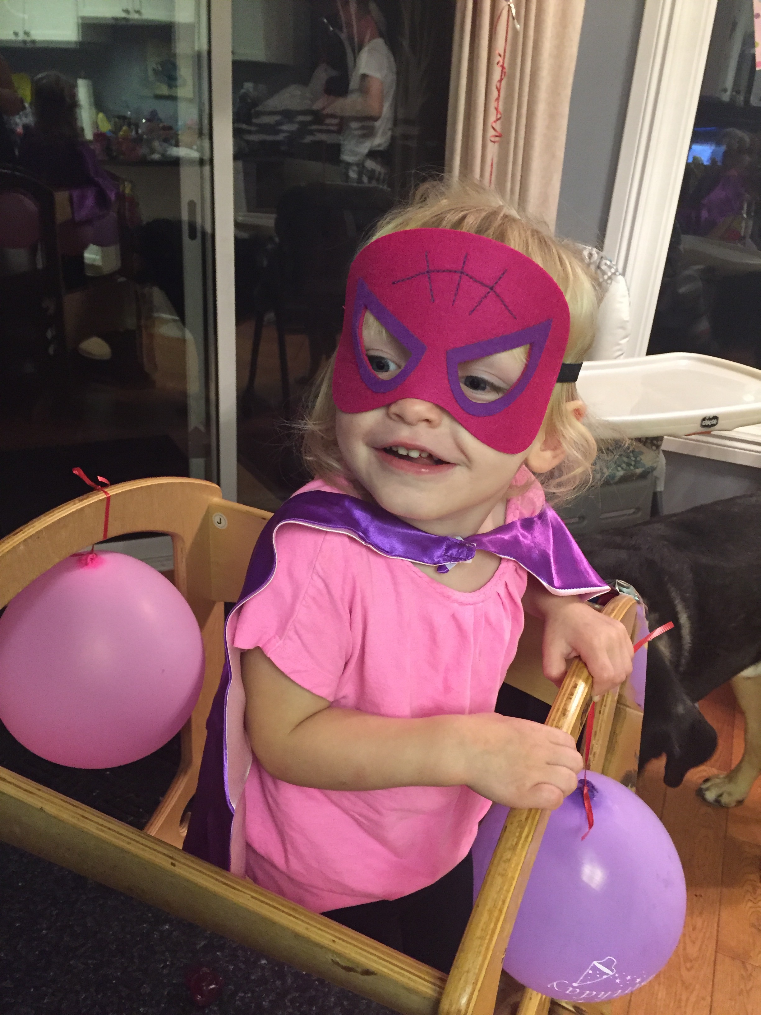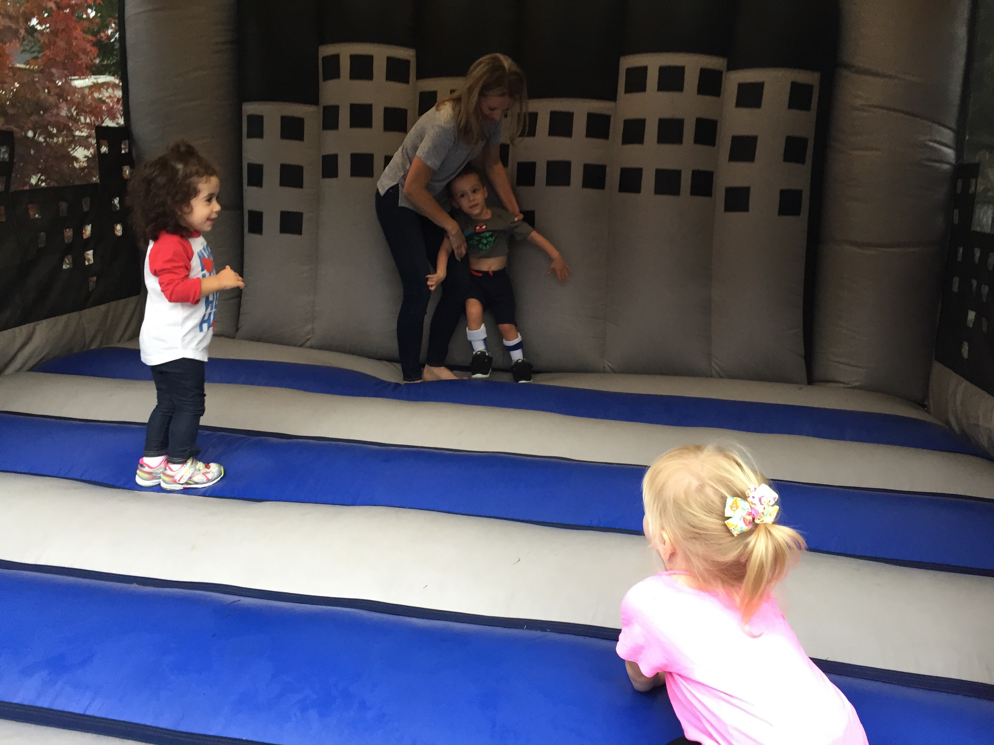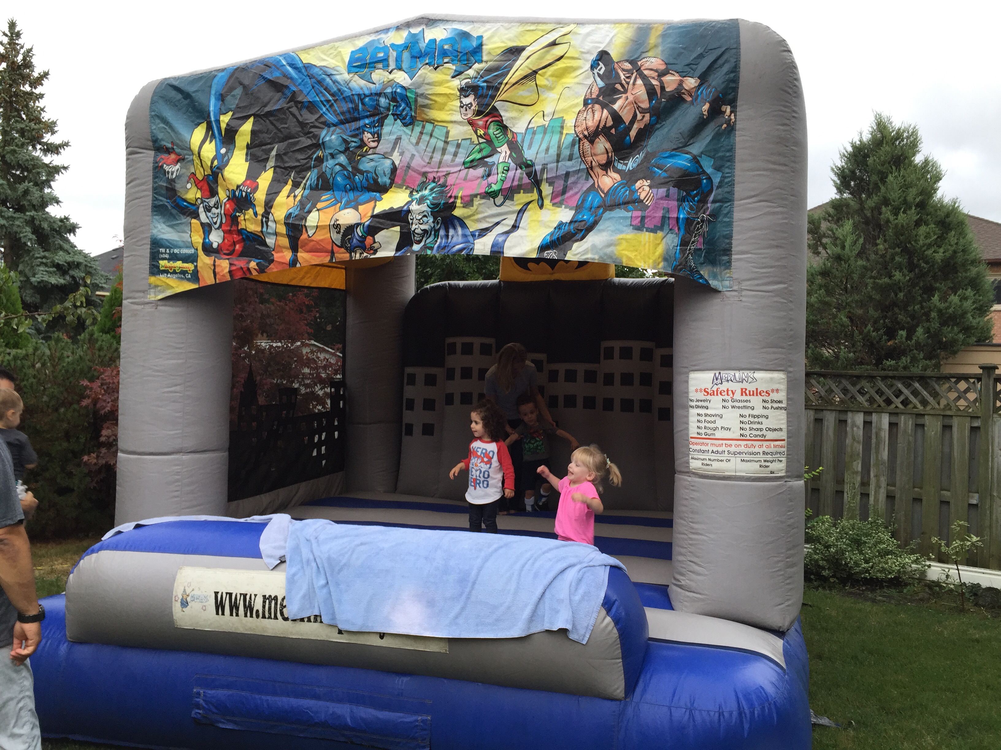 MThey ate lots of yummy food, played with all Ben’s toys, sang happy birthday with a super cool super hero cake and jumped like crazy in the super hero bouncy castle. Mommy was so proud of Madi for trying to jump on her feet. She has been working on the feeling of jumping and learning how to bend her knees and then reach high to jump at conductive Ed for over a year. She is always scared to let go when jumping and she tried it today! Check out the video below!