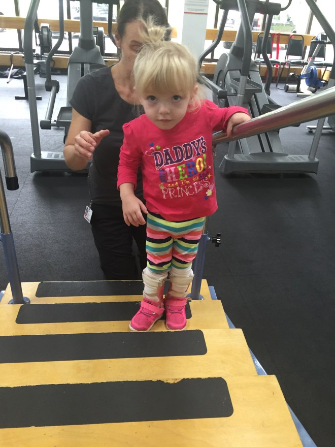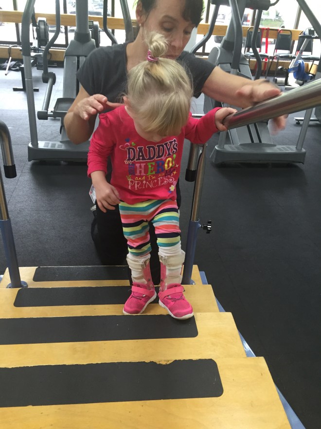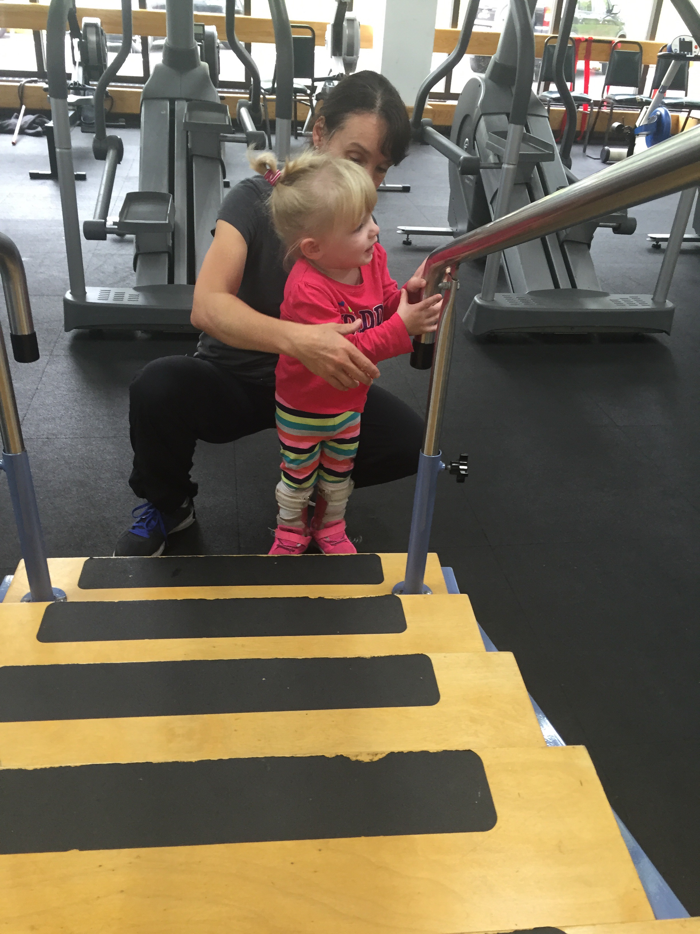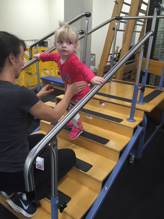 Madi had a rough go at physio today. It was the perfect storm between her being tired, being a 3 year old and limited snack…Stephanie’s patience certainly was tested but she did an excellent job of giving Madison lots of choice, re-directing her and working her hard when Madi was ready. Madison did her best work on the stairs today. They practiced going up and down, remembering to slide her hand before stepping and bending her knees. Thank you Stephanie!!!