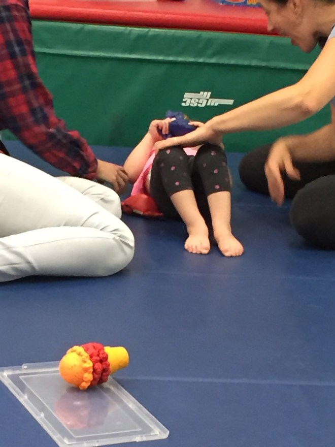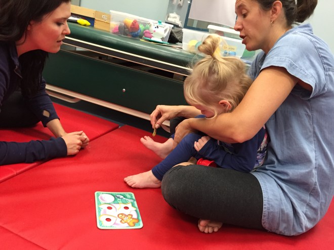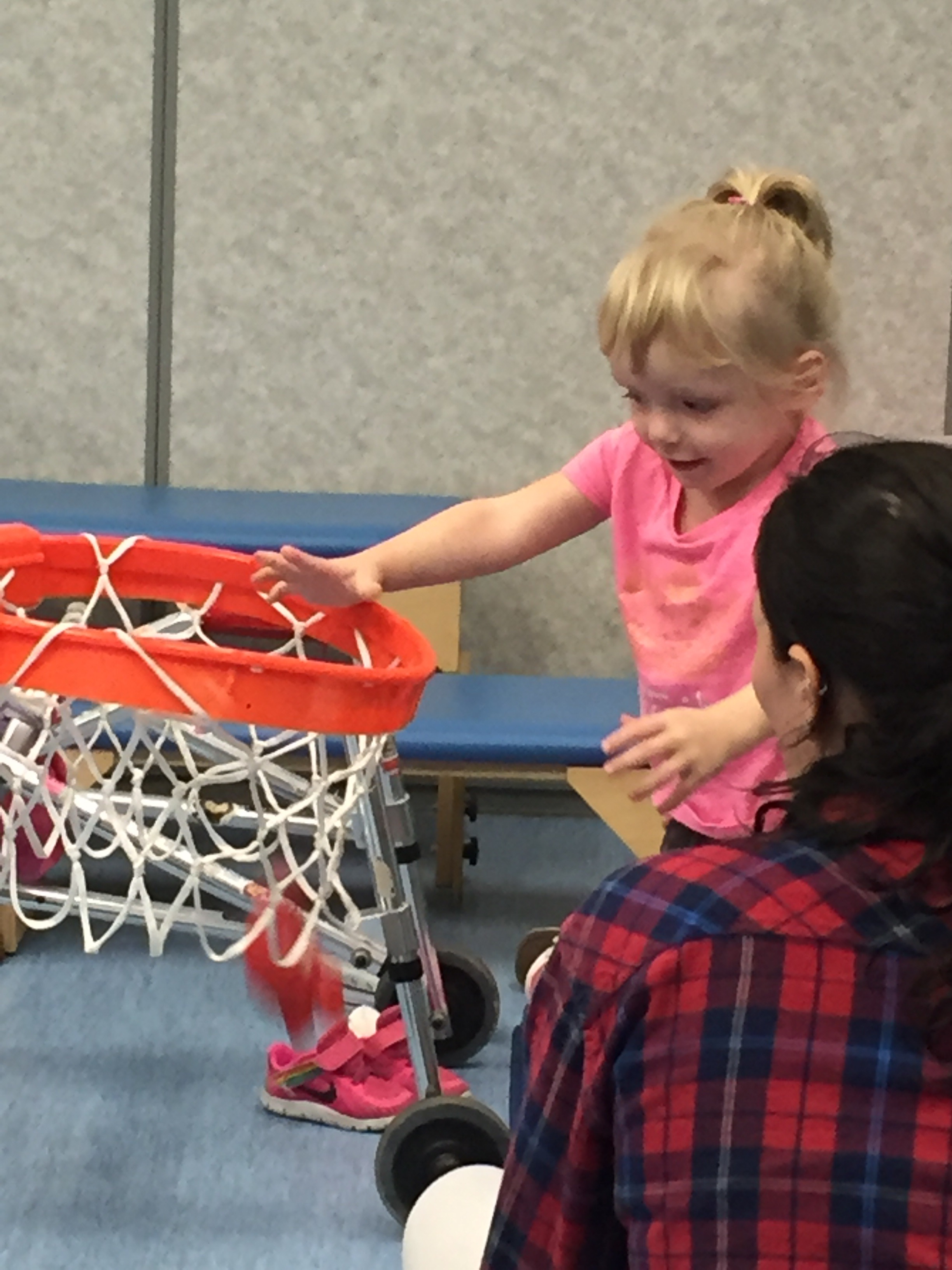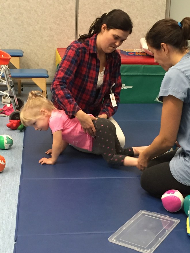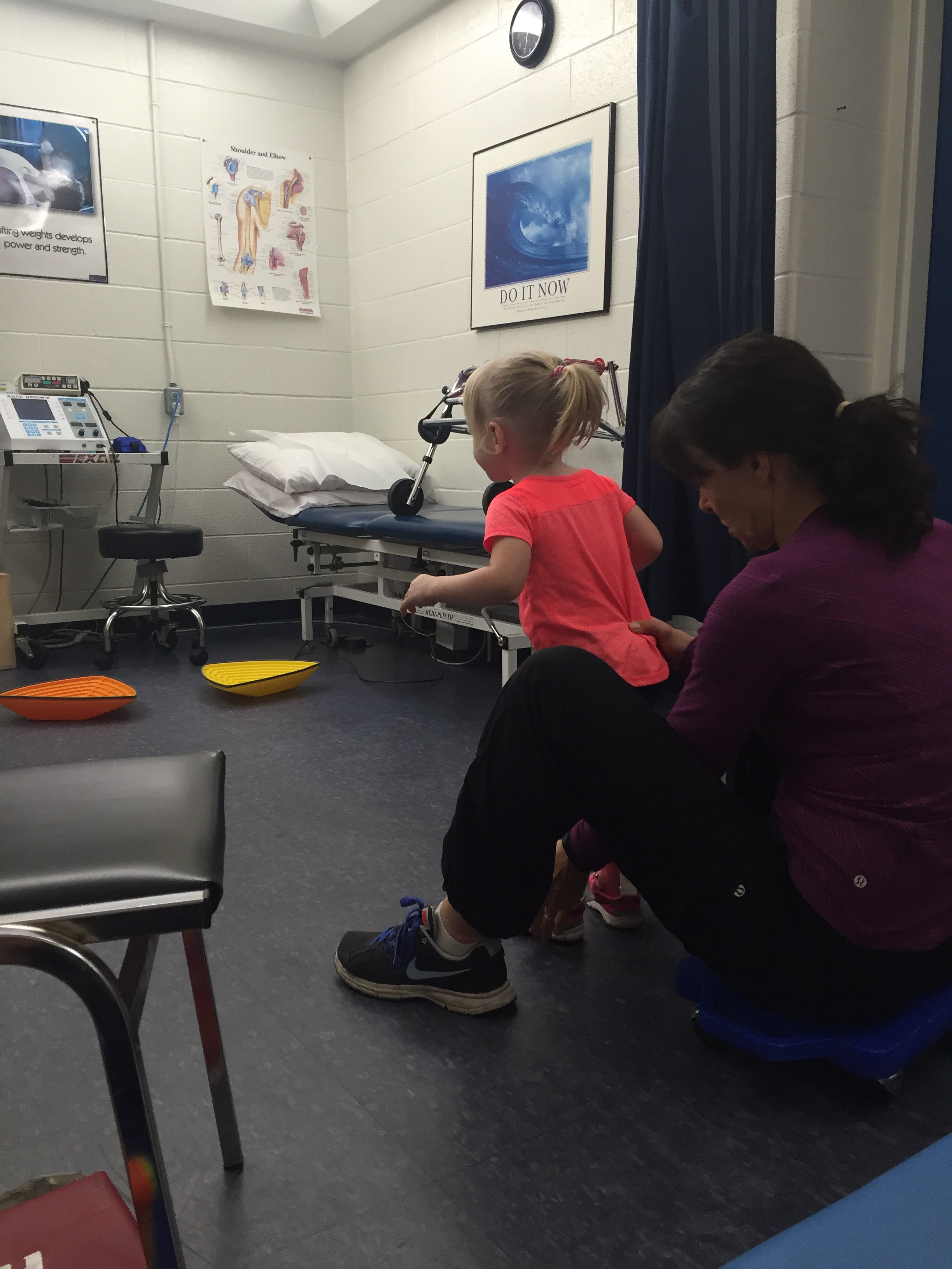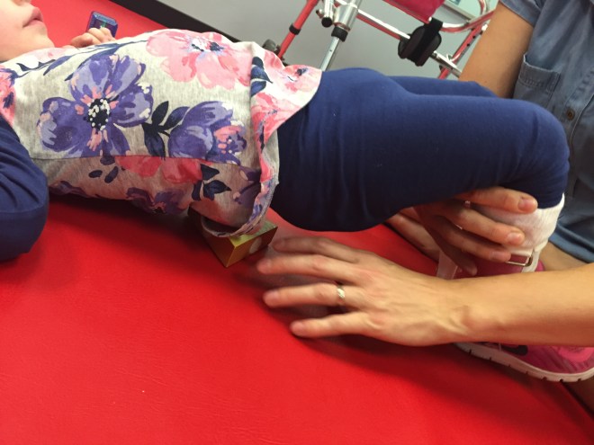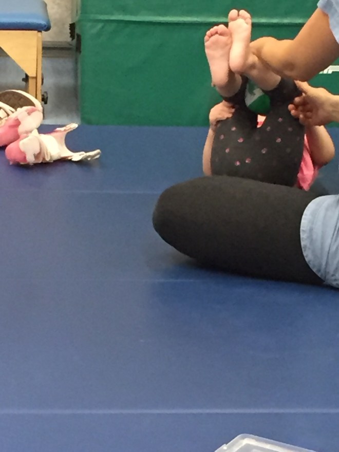 Madison worked with Kate on some new stretching activities to activate and strengthen her dorsiflexion in her feet as well as a bridging activity to strengthen her gluteus. They finished by practicing some walking and learning transitions to sit on the potty independently.